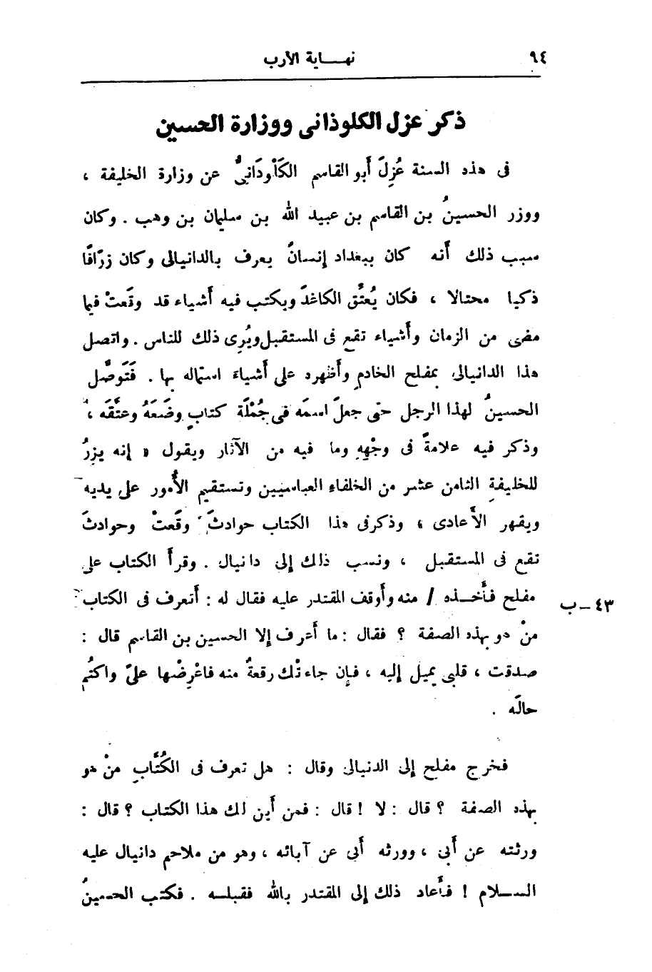 فى هذه السنة عزل أبو القاسم الكلودانىّ عن وزارة الخليفة، ووزر الحسين بن القاسم بن عبيد الله بن سليمان بن وهب. وكان سبب ذلك أنه كان ببغداد إنسان يعرف بالدانيالى وكان زرّافا ذكيا محتالا، فكان يعتّق الكاغد ويكتب فيه أشياء قد وقعت فيما مضى من الزمان وأشياء تقع فى المستقبل ويرى ذلك للناس. واتصل هذا الدانيالى بمفلح الخادم وأظهره على أشياء استماله بها. فتوصّل الحسين لهذا الرجل حتى جعل اسمه فى جملة كتاب وضعه وعتّقه، وذكر فيه علامة فى وجهه وما فيه من الآثار ويقول «إنه يزر للخليفة الثامن عشر من الخلفاء العباسيين وتستقيم الأمور على يديه ويقهر الأعادى» وذكر فى هذا الكتاب حوادث وقعت وحوادث تقع فى المستقبل، ونسب ذلك إلى دانيال. وقرأ الكتاب على مفلح فأخذه/ منه وأوقف المقتدر عليه فقال له: أتعرف فى الكتاب من هو بهذه الصفة؟ فقال: ما أعرف إلا الحسين بن القاسم قال: