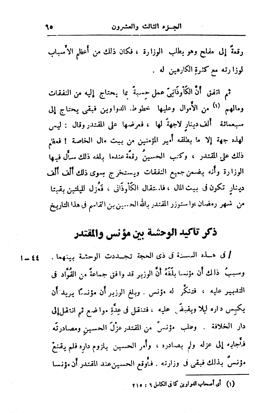 ثم اتفق أنّ الكلوذانىّ عمل حسبة بما يحتاج إليه من النفقات ومالهم «1» من الأموال وعليها خطوط الدواوين فبقى يحتاج إلى سبعمائة ألف دينار لا جهة لها، فعرضها على المقتدر وقال: ليس لهذه جهة إلا ما يطلقه أمير المؤمنين من بيت مال الخاصة! فعظم ذلك على المقتدر، وكتب الحسين رقعة عندما بلغه ذلك سأل فيها الوزارة وأنه يضمن جميع النفقات ويستخرج سوى ذلك ألف ألف دينار تكون فى بيت المال، فاستقال الكلوذانى، فعزل لليلتين بقبتا من شهر رمضان، واستوزر المقتدر بالله الحسين بن القاسم فى هذا التاريخ