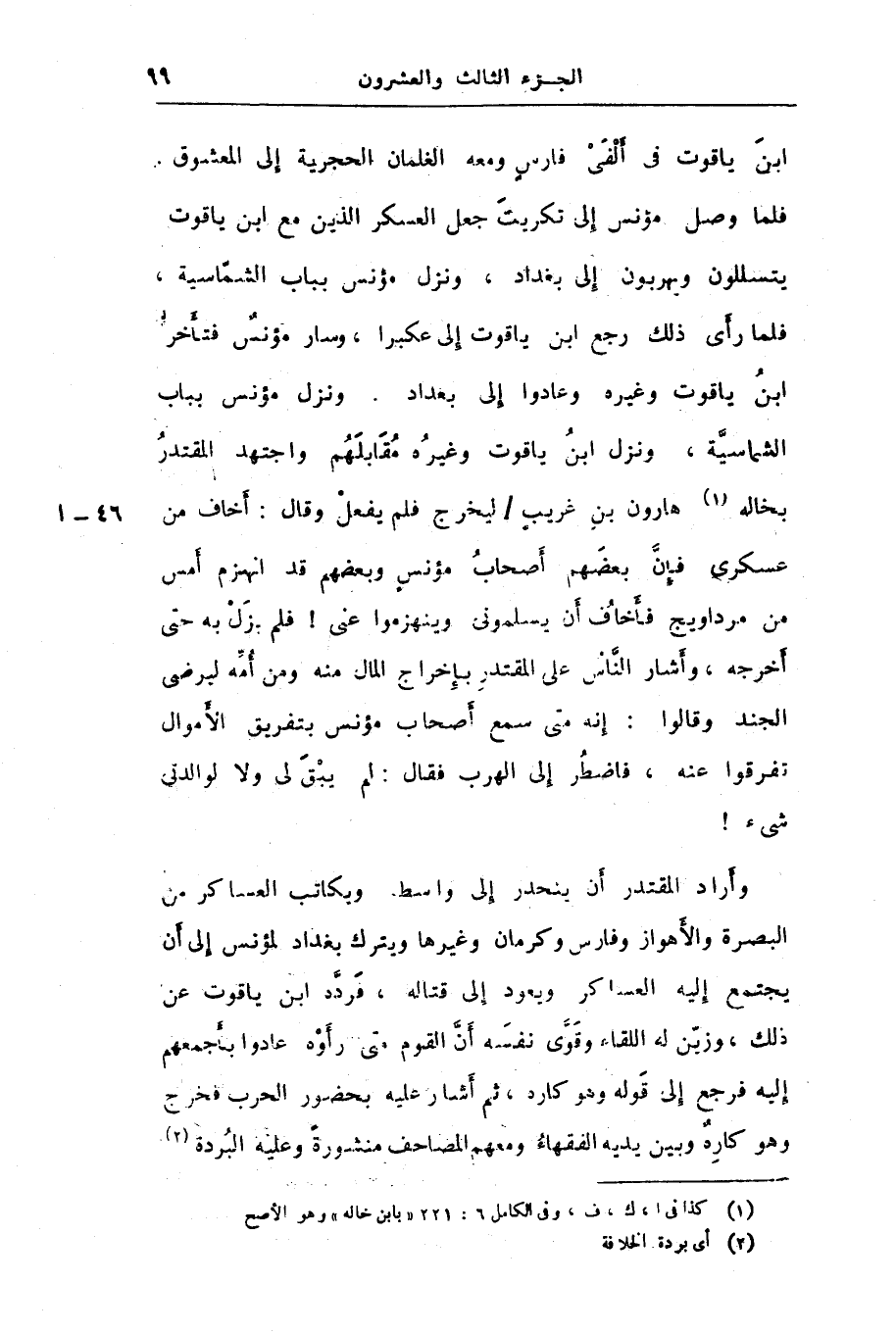 فلما وصل مؤنس إلى تكريت جعل العسكر الذين مع ابن ياقوت يتسللون ويهربون إلى بغداد، ونزل مؤنس بباب الشمّاسية فلما رأى ذلك رجع ابن ياقوت إلى عكبرا، وسار مؤنس فتأخر ابن ياقوت وغيره وعادوا إلى بعداد. ونزل مؤنس بباب الشماسيّة، ونزل ابن ياقوت وغيره مقابلهم واجتهد المقتدر بخاله «1» هارون بن غريب/ ليخرج فلم يفعل وقال: أخاف من عسكرى فإنّ بعضهم أصحاب مؤنس وبعضهم قد انهزم أمس من مرداويج فأخاف أن يسلمونى وينهزموا عنى! فلم يزل به حتى أخرجه، وأشار النّاس على المقتدر بإخراج المال منه ومن أمّه ليرضى الجند وقالوا: إنه متى سمع أصحاب مؤنس بتفريق الأموال تفرقوا عنه، فاضطر إلى الهرب فقال: لم يبق لى ولا لوالدتى شىء! وأراد المقتدر أن ينحدر إلى واسط ويكاتب العساكر من البصرة والأهواز وفارس وكرمان وغيرها ويترك بغداد لمؤنس إلى أن يجتمع إليه العساكر ويعود إلى قتاله، فردّد ابن ياقوت عن ذلك، وزيّن له اللقاء وقوّى نفسه أنّ القوم متى رأوه عادوا بأجمعهم إليه فرجع إلى قوله وهو كاره، ثم أشار عليه بحضور الحرب فخرج وهو كاره وبين يديه الفقهاء ومعهم المصاحف منشورة وعليه البردة «2»