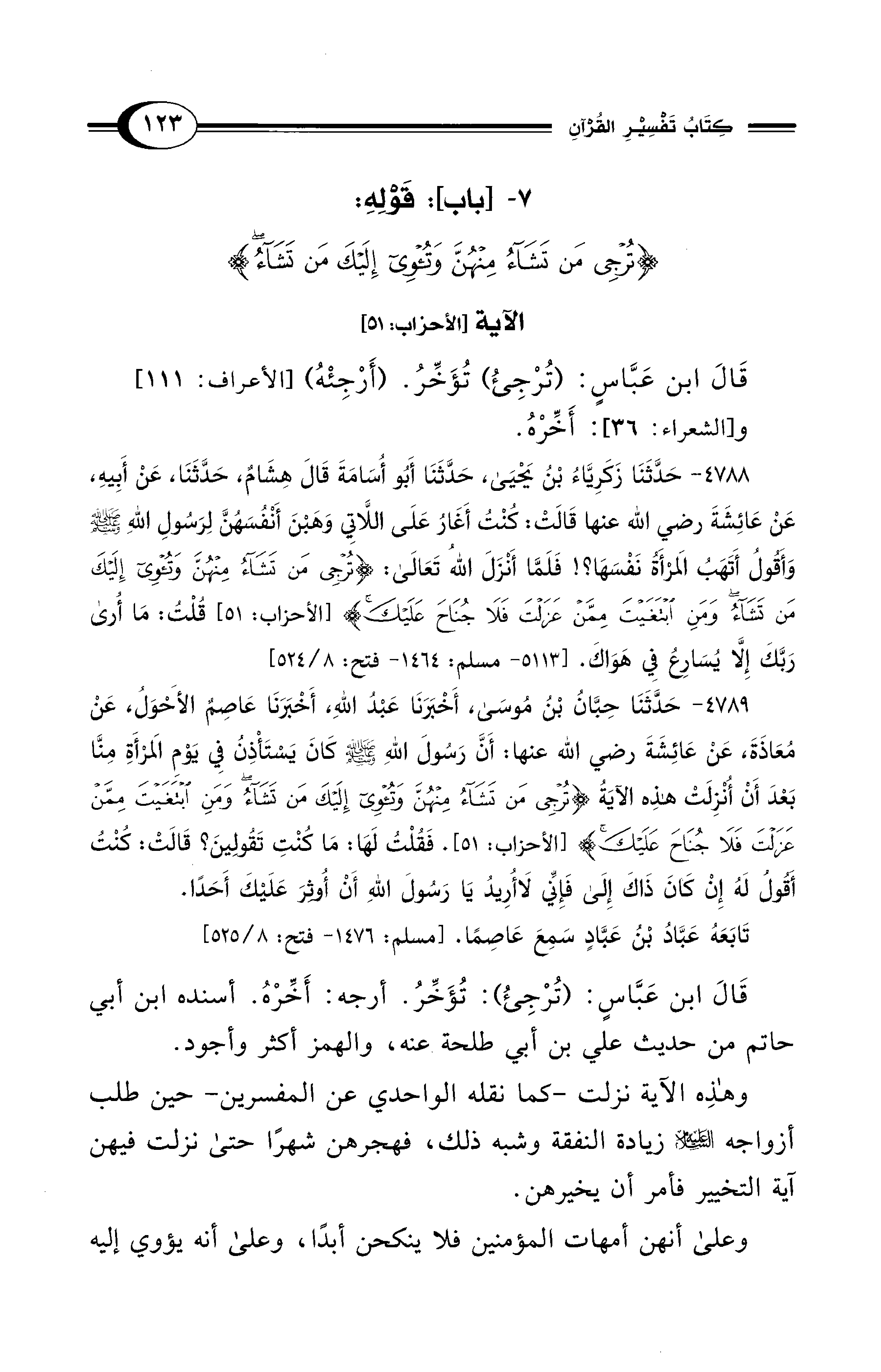 7 - [باب]: قَوْلِهِ: {تُرْجِي مَنْ تَشَاءُ مِنْهُنَّ وَتُؤْوِي إِلَيْكَ مَنْ تَشَاءُ} الآية [الأحزاب: 51]