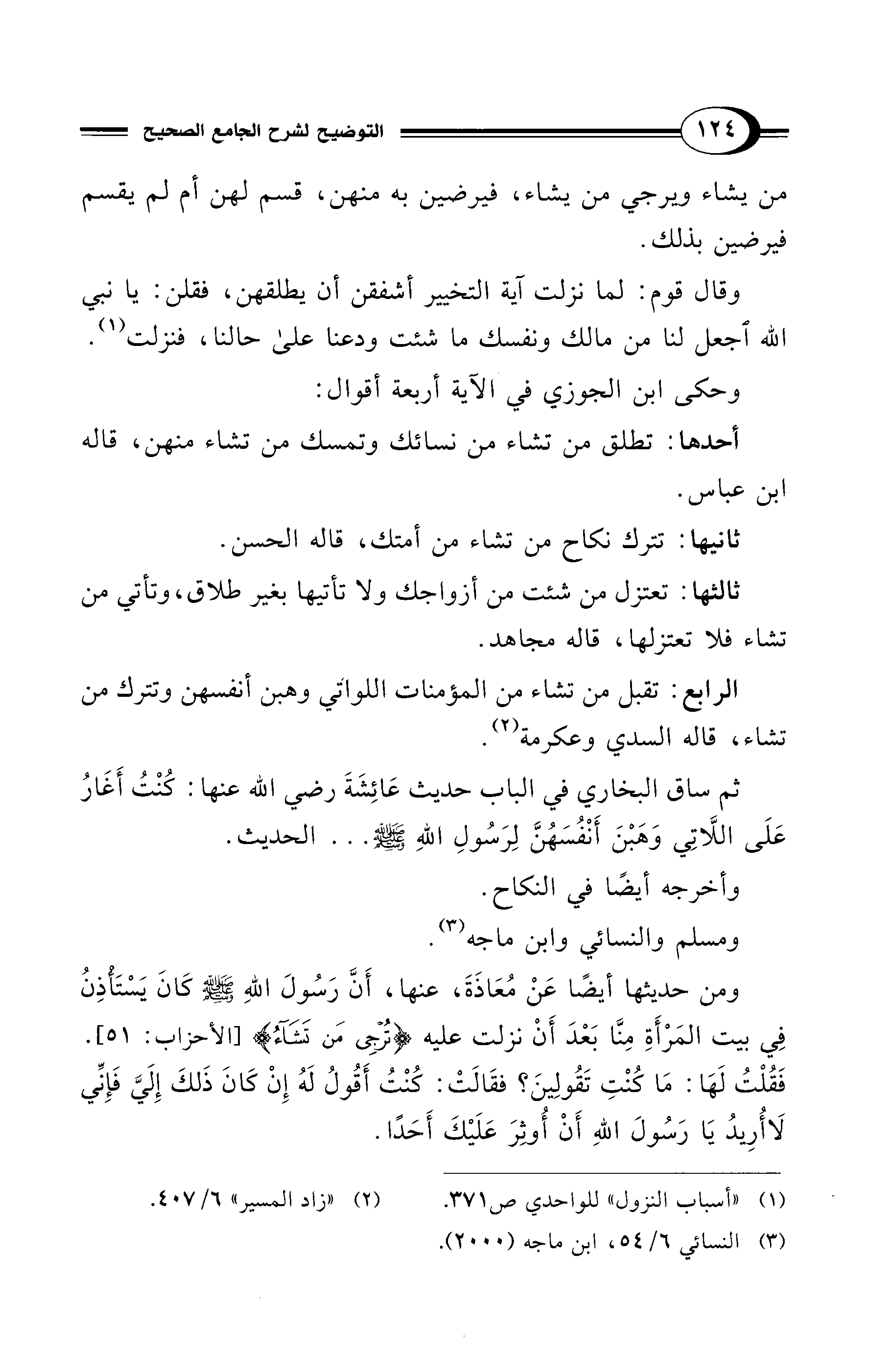 الرابع: تقبل من تشاء من المؤمنات اللواتي وهبن أنفسهن وتترك من تشاء، قاله السدي وعكرمة (¬2).