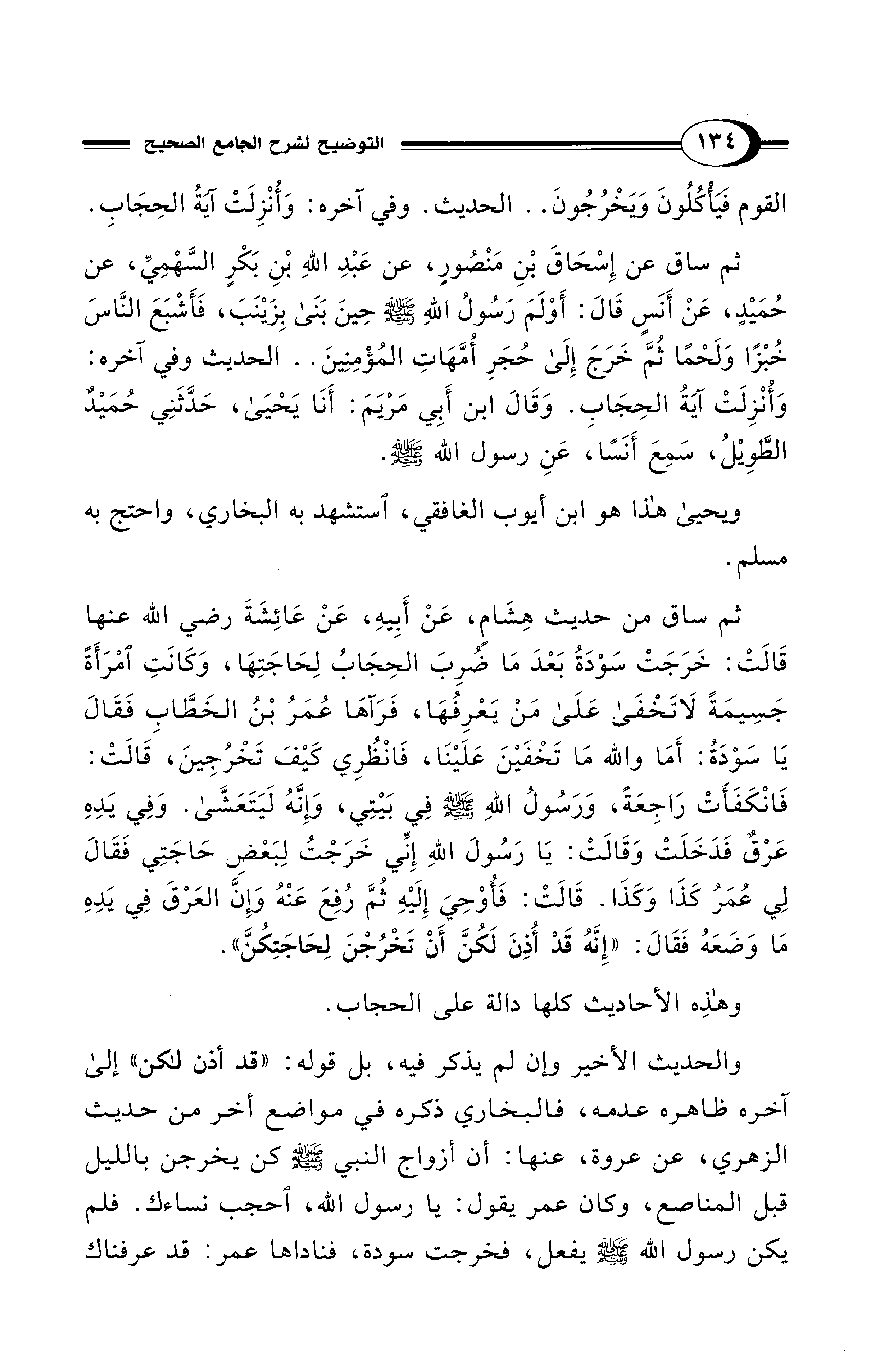 ثم ساق من حديث هِشَامٍ، عَنْ أَبِيهِ، عَنْ عَائِشَةَ رضي الله عنها قَالَتْ: خَرَجَتْ سَوْدَةُ بَعْدَ مَا ضُرِبَ الحِجَابُ لِحَاجَتِهَا، وَكَانَتِ امْرَأَةً جَسِيمَةً لَا تَخْفَى على مَنْ يَعْرِفُهَا، فَرَآهَا عُمَرُ بْنُ الخَطَّابِ فَقَالَ يَا سَوْدَةُ: أَمَا والله مَا تَخْفَيْنَ عَلَيْنَا، فَانْظُرِي كَيْفَ تَخْرُجِينَ، قَالَتْ: فَانْكَفَأَتْ رَاجِعَةً، وَرَسُولُ اللهِ - صلى الله عليه وسلم - فِي بَيْتِي، وَإِنَّهُ لَيَتَعَشَّى. وَفِي يَدِهِ عَرْقٌ فَدَخَلَتْ وَقَالَتْ: يَا رَسُولَ اللهِ إِنِّي خَرَجْتُ لِبَعْضِ حَاجَتِي فَقَالَ لِي عُمَرُ كَذَا وَكَذَا. قَالَتْ: فَأُوْحِيَ إِلَيْهِ ثُمَّ رُفِعَ عَنْهُ وَإِنَّ العَرْقَ فِي يَدِهِ مَا وَضعَهُ فَقَالَ: "إِنَّهُ قَدْ أُذِنَ لَكُنَّ أَنْ تَخْرُجْنَ لِحَاجَتِكُنَّ ".