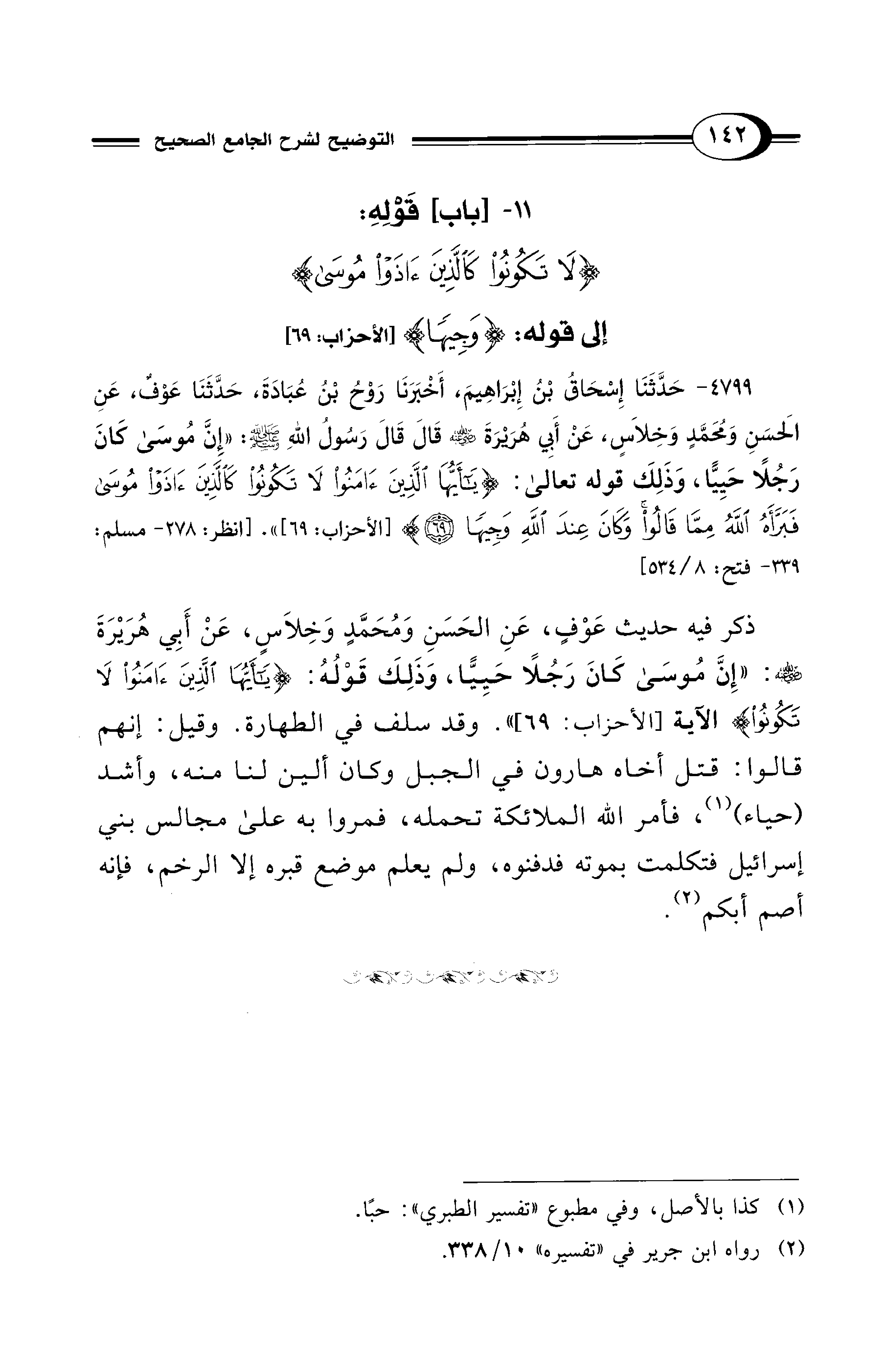 4799 - حَدَّثَنَا إِسْحَاقُ بْنُ إِبْرَاهِيمَ, أَخْبَرَنَا رَوْحُ بْنُ عُبَادَةَ, حَدَّثَنَا عَوْفٌ, عَنِ الْحَسَنِ وَمُحَمَّدٍ وَخِلاَسٍ, عَنْ أَبِي هُرَيْرَةَ - رضي الله عنه - قَالَ قَالَ رَسُولُ اللهِ - صلى الله عليه وسلم -: «إِنَّ مُوسَى كَانَ رَجُلاً حَيِيًّا، وَذَلِكَ قَوْلُهُ تَعَالَى: {يَا أَيُّهَا الَّذِينَ آمَنُوا لاَ تَكُونُوا كَالَّذِينَ آذَوْا مُوسَى فَبَرَّأَهُ اللهُ مِمَّا قَالُوا وَكَانَ عِنْدَ اللهِ وَجِيهًا (69)} [انظر: 278 - مسلم: 339 - فتح: 8/ 534]
