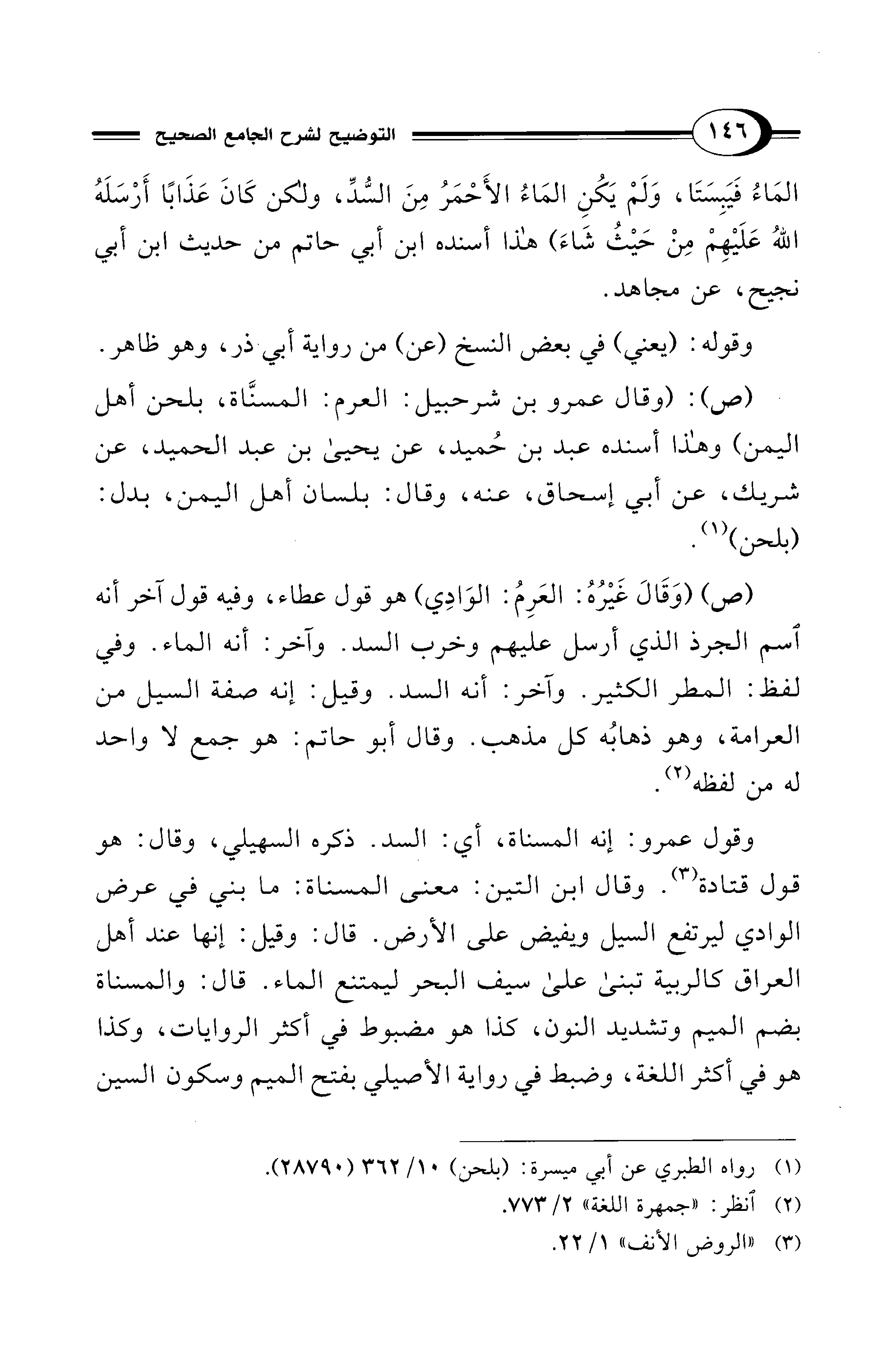(ص): (وقال عمرو بن شرحبيل: العرم: المسنَّاة، بلحن أهل اليمن) وهذا أسنده عبد بن حُميد، عن يحيى بن عبد الحميد، عن شريك، عن أبي إسحاق، عنه، وقال: بلسان أهل اليمن، بدل: (بلحن) (¬1).