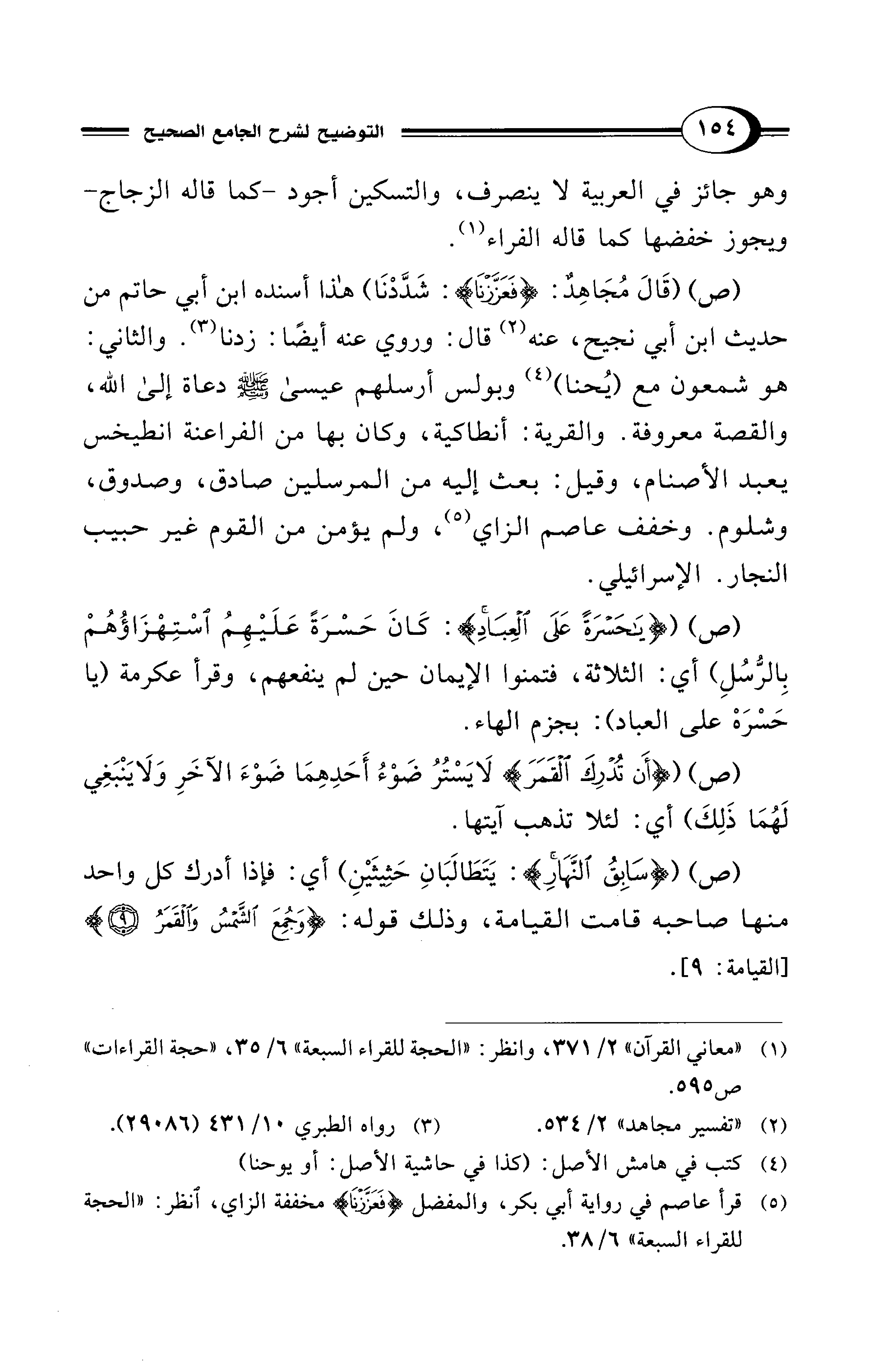 (ص) (قَالَ مُجَاهِدٌ: {فَعَزَّزْنَا}: شَدَّدْنَا) هذا أسنده ابن أبي حاتم من حديث ابن أبي نجيح، عنه (¬2) قال: وروي عنه أيضًا: زدنا (¬3). والثاني: هو شمعون مع (يُحنا) (¬4) وبولس أرسلهم عيسى - صلى الله عليه وسلم - دعاة إلى الله، والقصة معروفة. والقرية: أنطاكية، وكان بها من الفراعنة انطيخس يعبد الأصنام، وقيل: بعث إليه من المرسلين صادق، وصدوق، وشلوم. وخفف عاصم الزاي (¬5)، ولم يؤمن من القوم غير حبيب النجار. الإسرائيلي.