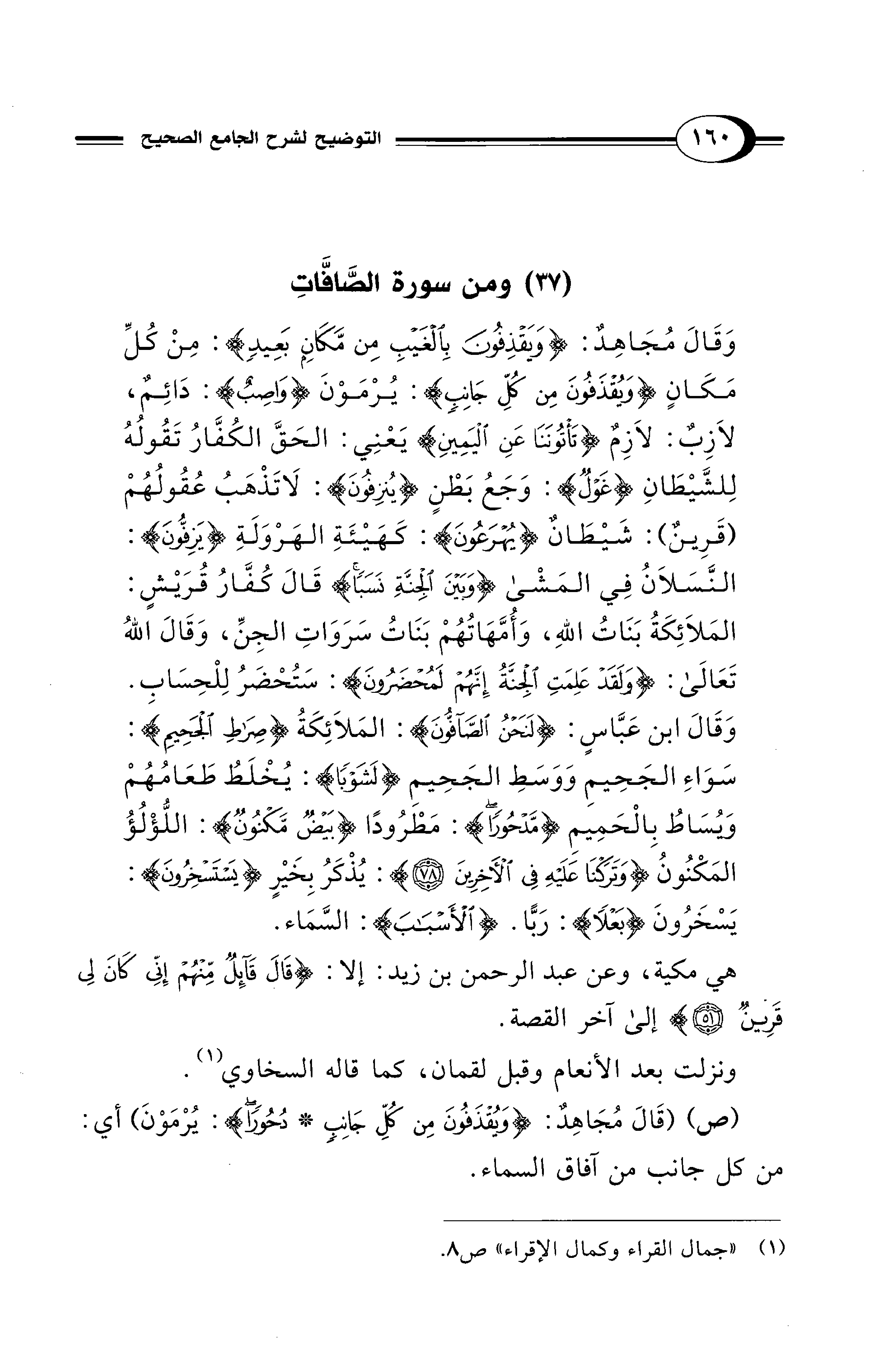 تَعَالَى: {وَلَقَدْ عَلِمَتِ الْجِنَّةُ إِنَّهُمْ لَمُحْضَرُونَ}: سَتُحْضرُ لِلْحِسَاب. وَقَالَ ابن عَبَّاسٍ: {لَنَحْنُ الصَّافُّونَ}: المَلاَئِكَةُ {صِرَاطِ الْجَحِيمِ}: سوَاءِ الجَحِيمِ وَوَسَطِ الجَحِيمِ {لَشَوْبًا}: يُخْلَطُ طَعَامُهُمْ وَيُسَاطُ بِالْحَمِيمِ {مَّدْحُورًا}: مَطْرُودًا {بَيْضٌ مَكْنُونٌ}: اللُّؤْلُؤُ المَكْنُونُ {وَتَرَكْنَا عَلَيْهِ فِي الْآخِرِينَ (78)}: يُذْكَرُ بِخَيْرٍ {يَسْتَسْخِرُونَ}: يَسْخَرُونَ {بَعْلًا}: رَبًّا. {الْأَسْبَابِ}: السَّمَاء.