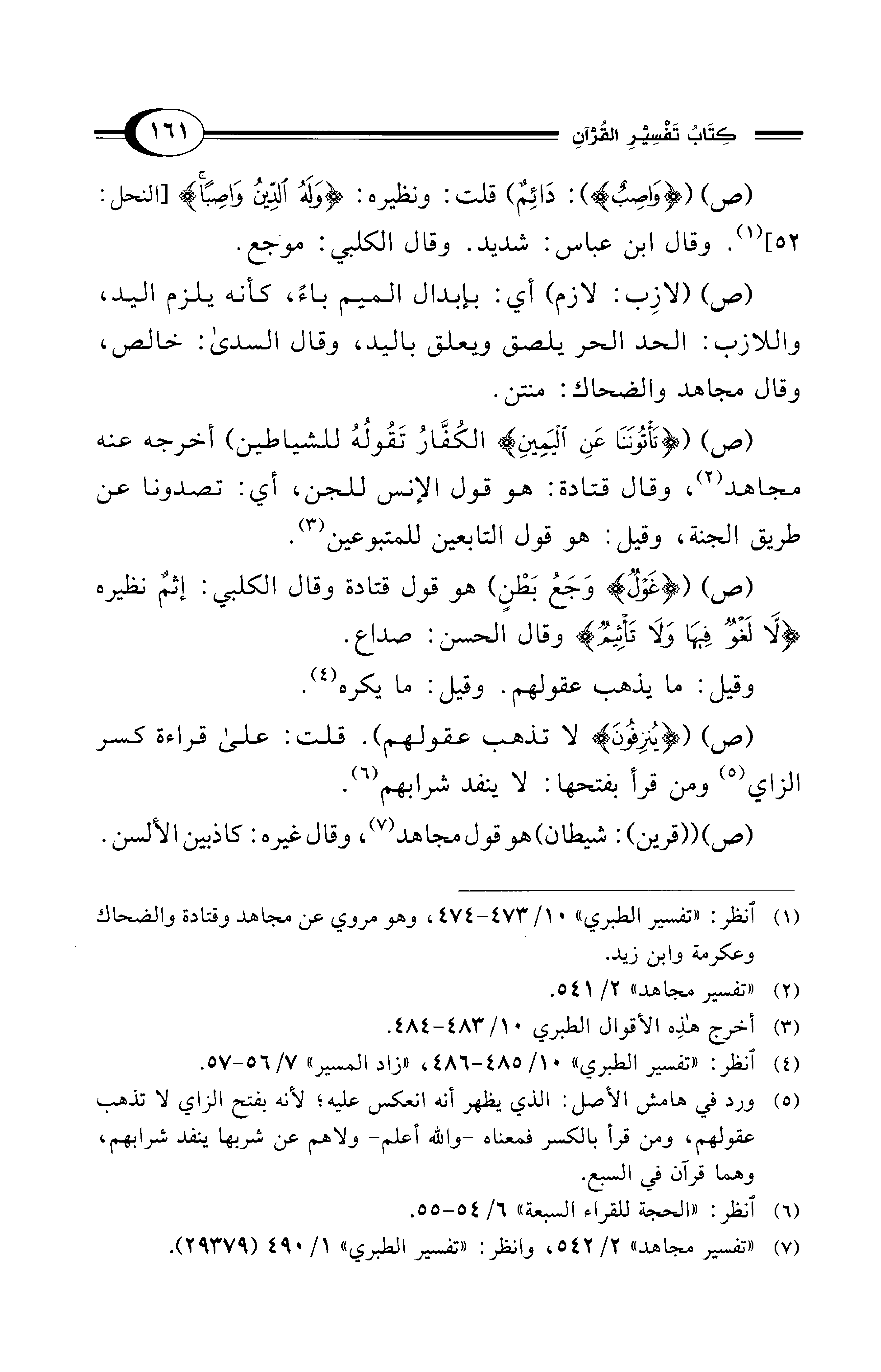 (ص) ((قرين): شيطان) هو قول مجاهد (¬7)، وقال غيره: كاذبين الألسن.