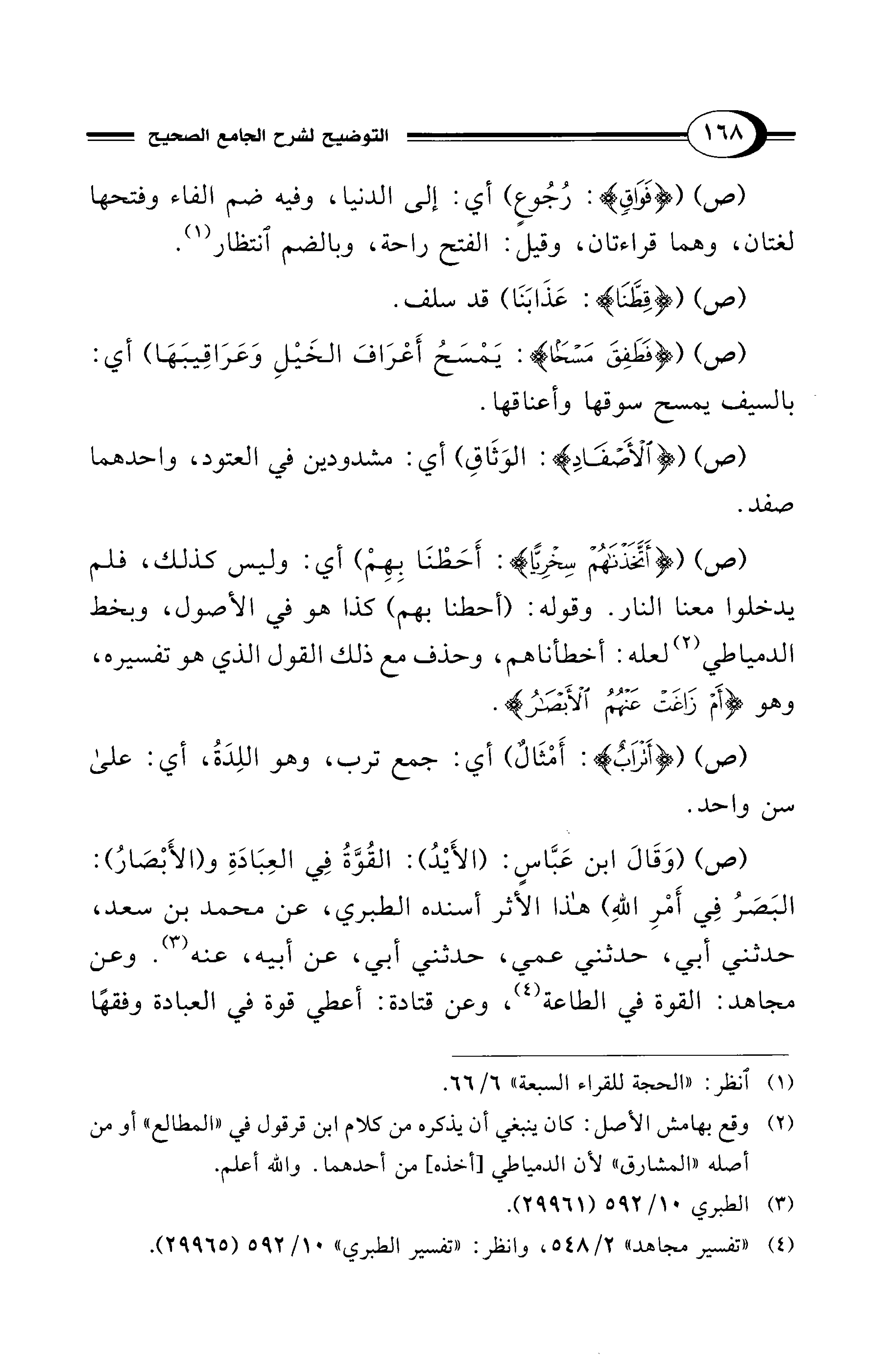 (ص) (وَقَالَ ابن عَبَّاسٍ: (الأَيْدُ): القُوَّةُ فِي العِبَادَةِ و (الأَبْصَارُ): البَصَرُ فِي أَمْرِ اللهِ) هذا الأثر أسنده الطبري، عن محمد بن سعد، حدثني أبي، حدثني عمي، حدثني أبي، عن أبيه، عنه (¬3). وعن مجاهد: القوة في الطاعة (¬4)، وعن قتادة: أعطي قوة في العبادة وفقهًا