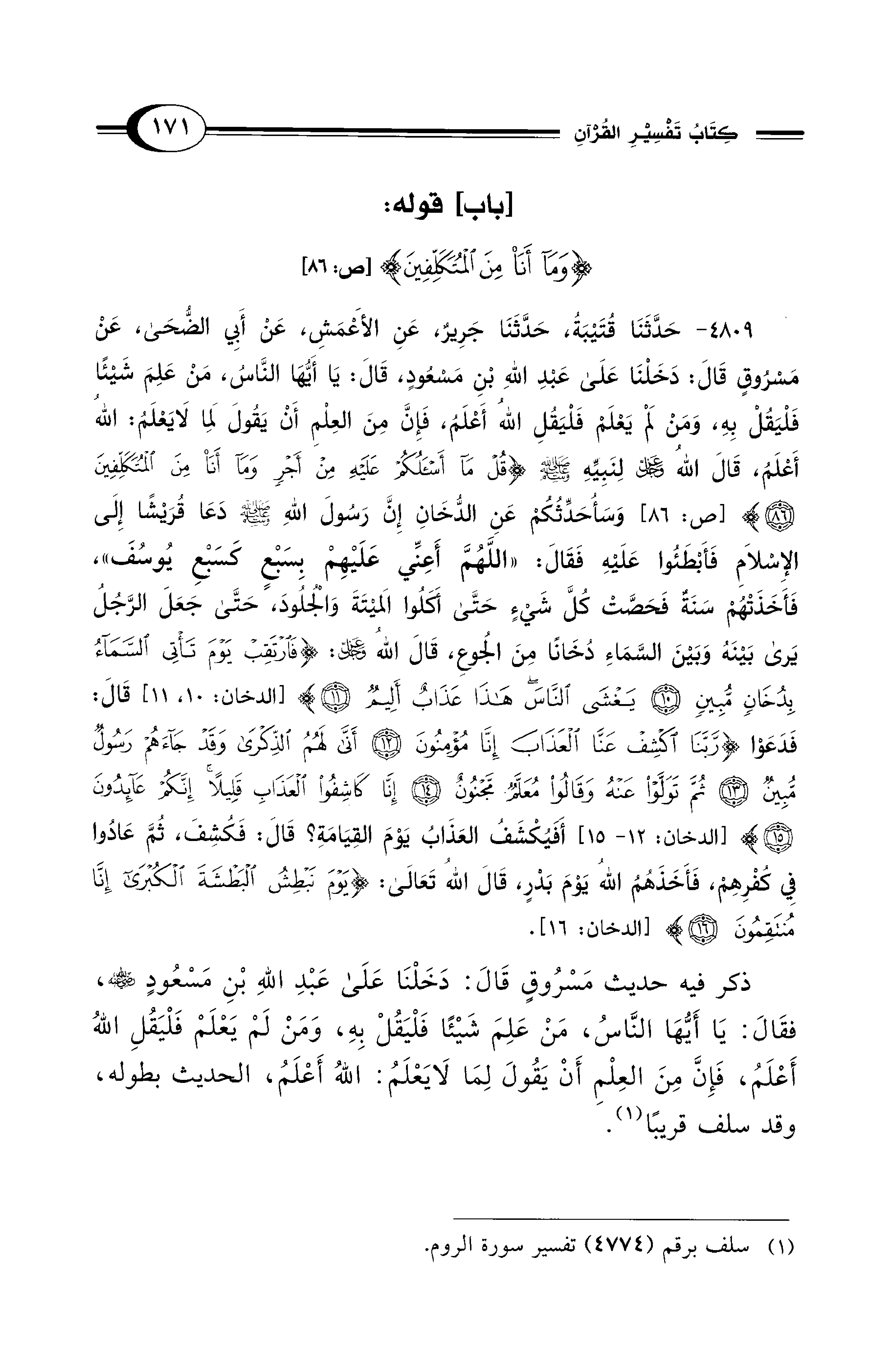 4809 - حَدَّثَنَا قُتَيْبَةُ, حَدَّثَنَا جَرِيرٌ, عَنِ الأَعْمَشِ, عَنْ أَبِي الضُّحَى, عَنْ مَسْرُوقٍ قَالَ: دَخَلْنَا عَلَى عَبْدِ اللهِ بْنِ مَسْعُودٍ، قَالَ: يَا أَيُّهَا النَّاسُ, مَنْ عَلِمَ شَيْئًا فَلْيَقُلْ بِهِ، وَمَنْ لَمْ يَعْلَمْ فَلْيَقُلِ اللهُ أَعْلَمُ، فَإِنَّ مِنَ الْعِلْمِ أَنْ يَقُولَ لِمَا لاَ يَعْلَمُ: اللهُ أَعْلَمُ، قَالَ اللهُ -عَزَّ وَجَلَّ- لِنَبِيِّهِ - صلى الله عليه وسلم - {قُلْ مَا أَسْأَلُكُمْ عَلَيْهِ مِنْ أَجْرٍ وَمَا أَنَا مِنَ الْمُتَكَلِّفِينَ} [ص: 86] وَسَأُحَدِّثُكُمْ عَنِ الدُّخَانِ إِنَّ رَسُولَ اللهِ - صلى الله عليه وسلم - دَعَا قُرَيْشًا إِلَى الإِسْلاَمِ فَأَبْطَئُوا عَلَيْهِ فَقَالَ: «اللَّهُمَّ أَعِنِّى عَلَيْهِمْ بِسَبْعٍ كَسَبْعِ يُوسُفَ»، فَأَخَذَتْهُمْ سَنَةٌ فَحَصَّتْ كُلَّ شَيْءٍ حَتَّى أَكَلُوا الْمَيْتَةَ وَالْجُلُودَ, حَتَّى جَعَلَ الرَّجُلُ يَرَى بَيْنَهُ وَبَيْنَ السَّمَاءِ دُخَانًا مِنَ الْجُوعِ، قَالَ اللهُ -عَزَّ وَجَلَّ-: {فَارْتَقِبْ يَوْمَ تَأْتِي السَّمَاءُ بِدُخَانٍ مُبِينٍ (10) يَغْشَى النَّاسَ هَذَا عَذَابٌ أَلِيمٌ (11)} [الدخان: 11,10] قَالَ: فَدَعَوْا {رَبَّنَا اكْشِفْ عَنَّا الْعَذَابَ إِنَّا مُؤْمِنُونَ (12) أَنَّى لَهُمُ الذِّكْرَى وَقَدْ جَاءَهُمْ رَسُولٌ مُبِينٌ (13) ثُمَّ تَوَلَّوْا عَنْهُ وَقَالُوا مُعَلَّمٌ مَجْنُونٌ (14) إِنَّا كَاشِفُو الْعَذَابِ قَلِيلًا إِنَّكُمْ عَائِدُونَ (15)} [الدخان: 12 - 15] أَفَيُكْشَفُ الْعَذَابُ يَوْمَ الْقِيَامَةِ؟ قَالَ: فَكُشِفَ, ثُمَّ عَادُوا فِي كُفْرِهِمْ، فَأَخَذَهُمُ اللهُ يَوْمَ بَدْرٍ, قَالَ اللهُ تَعَالَى {يَوْمَ نَبْطِشُ الْبَطْشَةَ الْكُبْرَى إِنَّا مُنْتَقِمُونَ (16)}. [الدخان: 16].