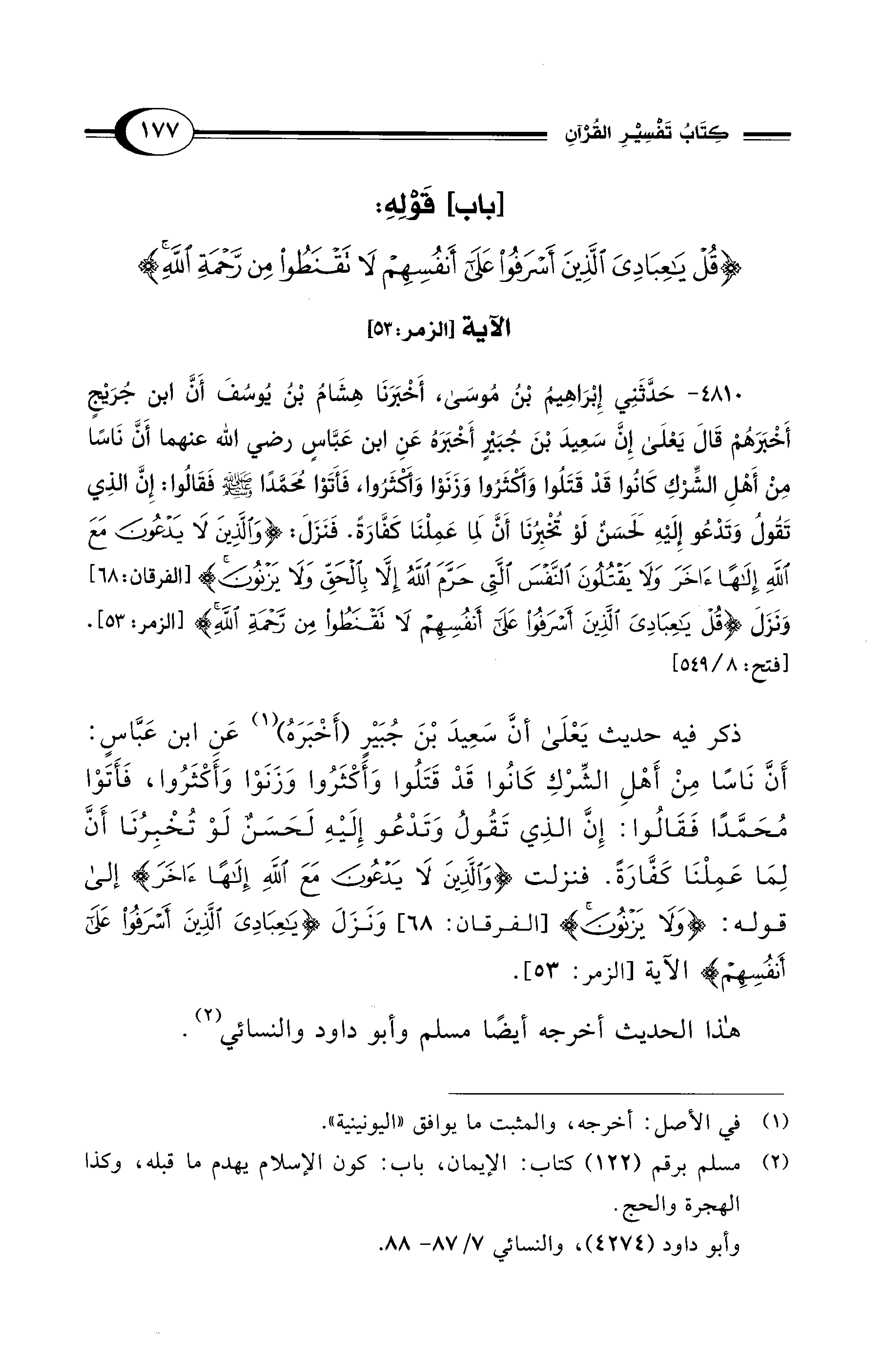 4810 - حَدَّثَنِي إِبْرَاهِيمُ بْنُ مُوسَى, أَخْبَرَنَا هِشَامُ بْنُ يُوسُفَ أَنَّ ابْنَ جُرَيْجٍ أَخْبَرَهُمْ قَالَ يَعْلَى إِنَّ سَعِيدَ بْنَ جُبَيْرٍ أَخْبَرَهُ عَنِ ابْنِ عَبَّاسٍ - رضي الله عنهما - أَنَّ نَاسًا مِنْ أَهْلِ الشِّرْكِ كَانُوا قَدْ قَتَلُوا وَأَكْثَرُوا وَزَنَوْا وَأَكْثَرُوا، فَأَتَوْا مُحَمَّدًا - صلى الله عليه وسلم - فَقَالُوا: إِنَّ الَّذِي تَقُولُ وَتَدْعُو إِلَيْهِ لَحَسَنٌ لَوْ تُخْبِرُنَا أَنَّ لِمَا عَمِلْنَا كَفَّارَةً. فَنَزَلَ: {وَالَّذِينَ لاَ يَدْعُونَ مَعَ اللهِ إِلَهًا آخَرَ وَلاَ يَقْتُلُونَ النَّفْسَ الَّتِي حَرَّمَ اللهُ إِلاَّ بِالْحَقِّ وَلاَ يَزْنُونَ} [الفرقان: 68] وَنَزَلَ {قُلْ يَا عِبَادِىَ الَّذِينَ أَسْرَفُوا عَلَى أَنْفُسِهِمْ لاَ تَقْنَطُوا مِنْ رَحْمَةِ اللهِ}. [الزمر: 53]. [فتح: 8/ 549]