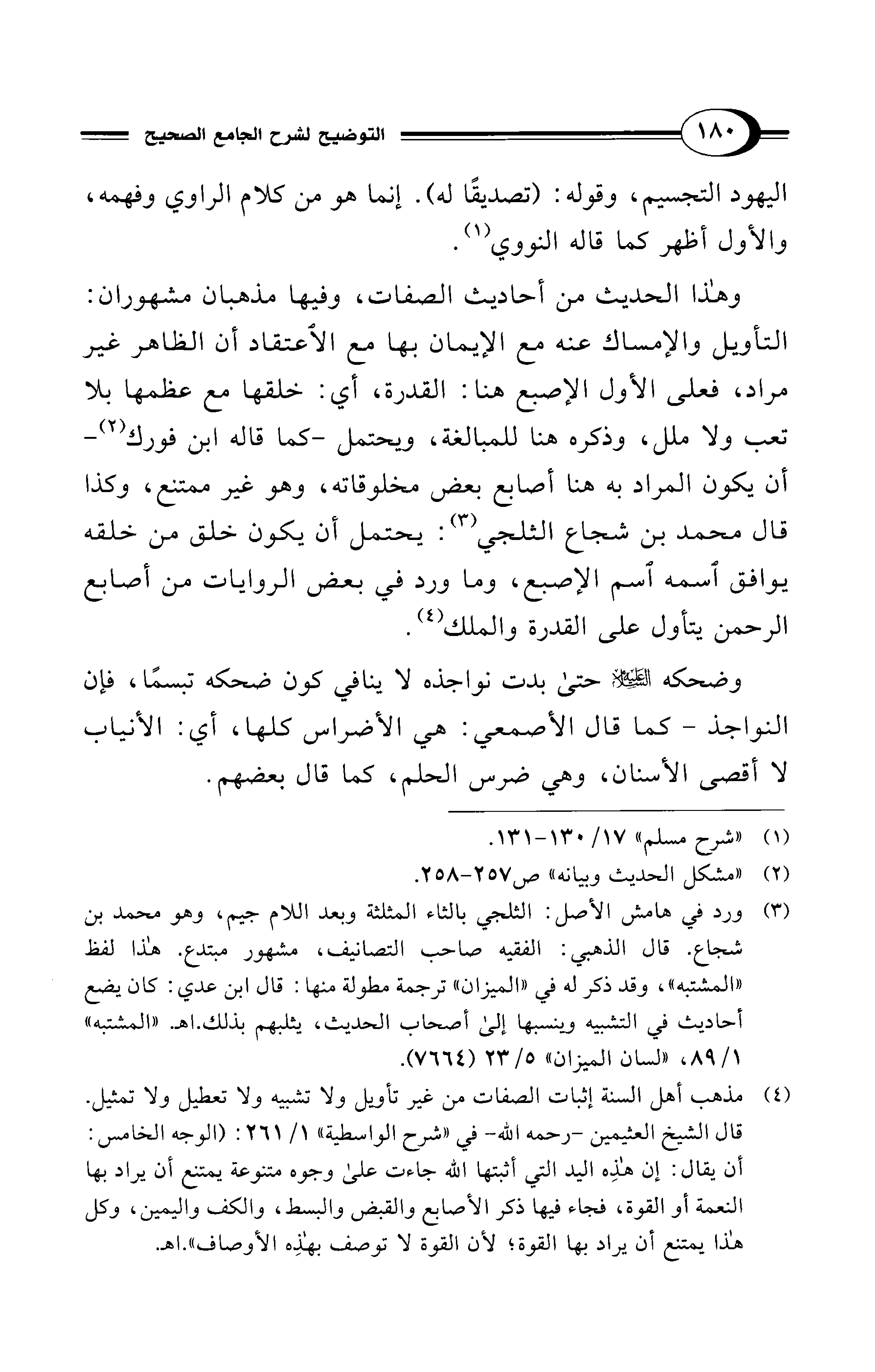 (¬4) مذهب أهل السنة إثبات الصفات من غير تأويل ولا تشبيه ولا تعطيل ولا تمثيل. قال الشيخ العثيمين - رحمه الله - في "شرح الواسطية" 1/ 261: (الوجه الخامس: أن يقال: إن هذِه اليد التي أثبتها الله جاءت على وجوه متنوعة يمتنع أن يراد بها النعمة أو القوة، فجاء فيها ذكر الأصابع والقبض والبسط، والكف واليمين، وكل هذا يمتنع أن يراد بها القوة؛ لأن القوة لا توصف بهذِه الأوصاف". اهـ.
