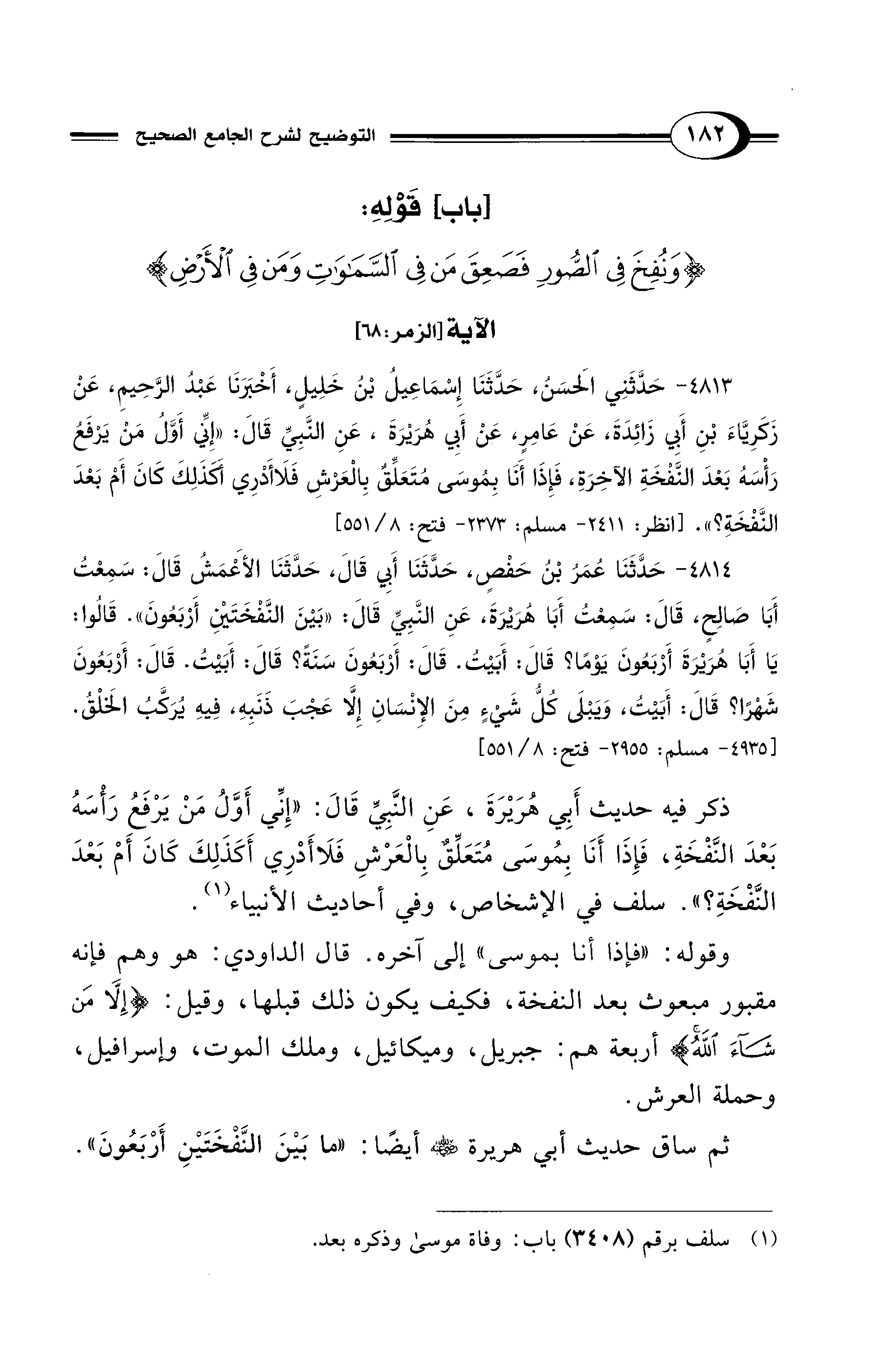 [باب] قَوْلِهِ: {وَنُفِخَ فِي الصُّورِ فَصَعِقَ مَنْ فِي السَّمَاوَاتِ وَمَنْ فِي الْأَرْضِ} الآية [الزمر: 68]