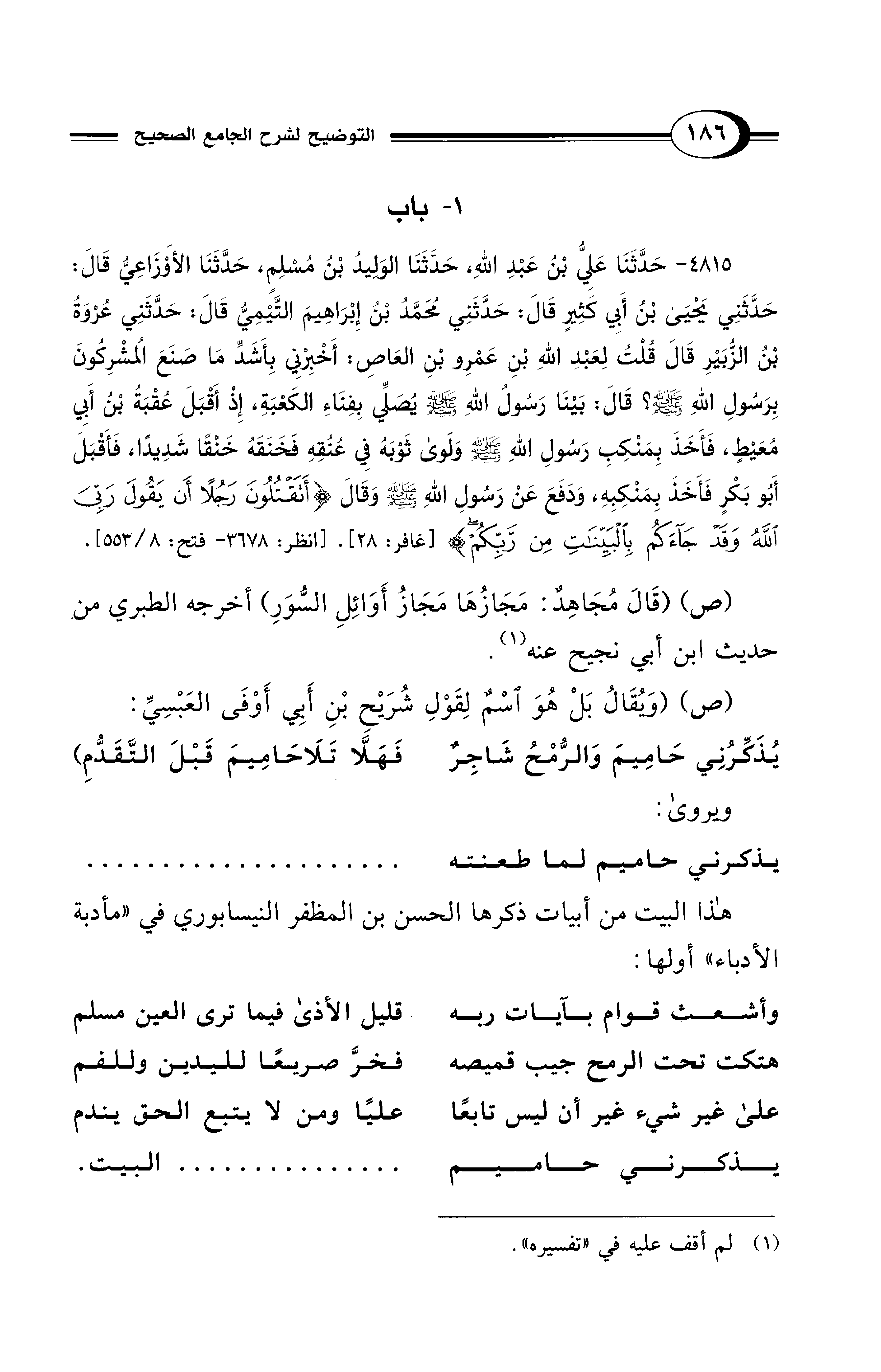 يُذَكِّرُنِي حَامِيمَ وَالرُّمْحُ شَاجِرٌ ... فَهَلَّا تَلَا حَامِيمَ قَبْلَ التَّقَدُّمِ)