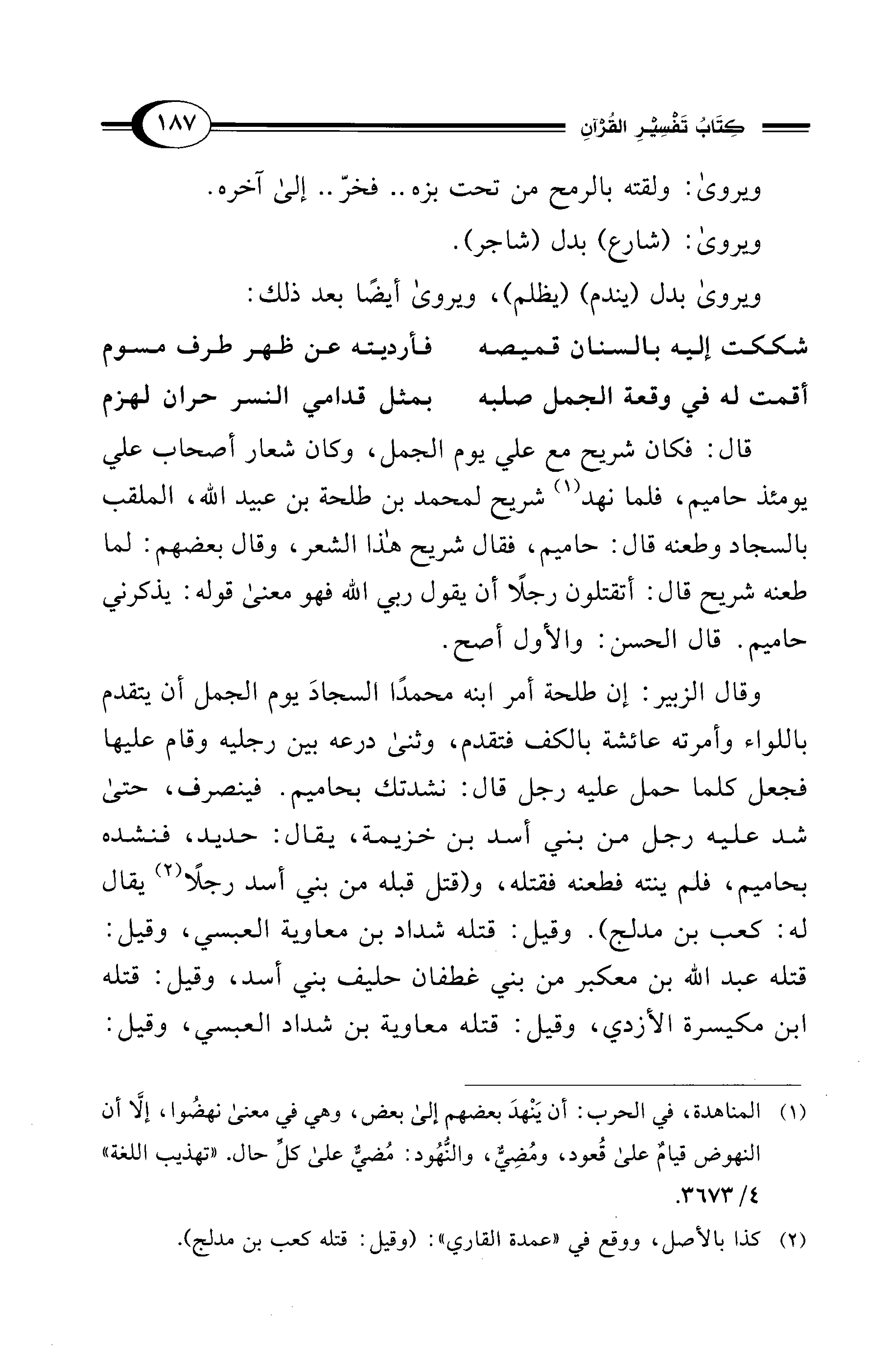 قال: فكان شريح مع علي يوم الجمل، وكان شعار أصحاب علي يومئذ حاميم، فلما نهد (¬1) شريح لمحمد بن طلحة بن عبيد الله، الملقب بالسجاد وطعنه قال: حاميم، فقال شريح هذا الشعر، وقال بعضهم: لما طعنه شريح قال: أتقتلون رجلًا أن يقول ربي الله فهو معنى قوله: يذكرني حاميم. قال الحسن: والأول أصح.