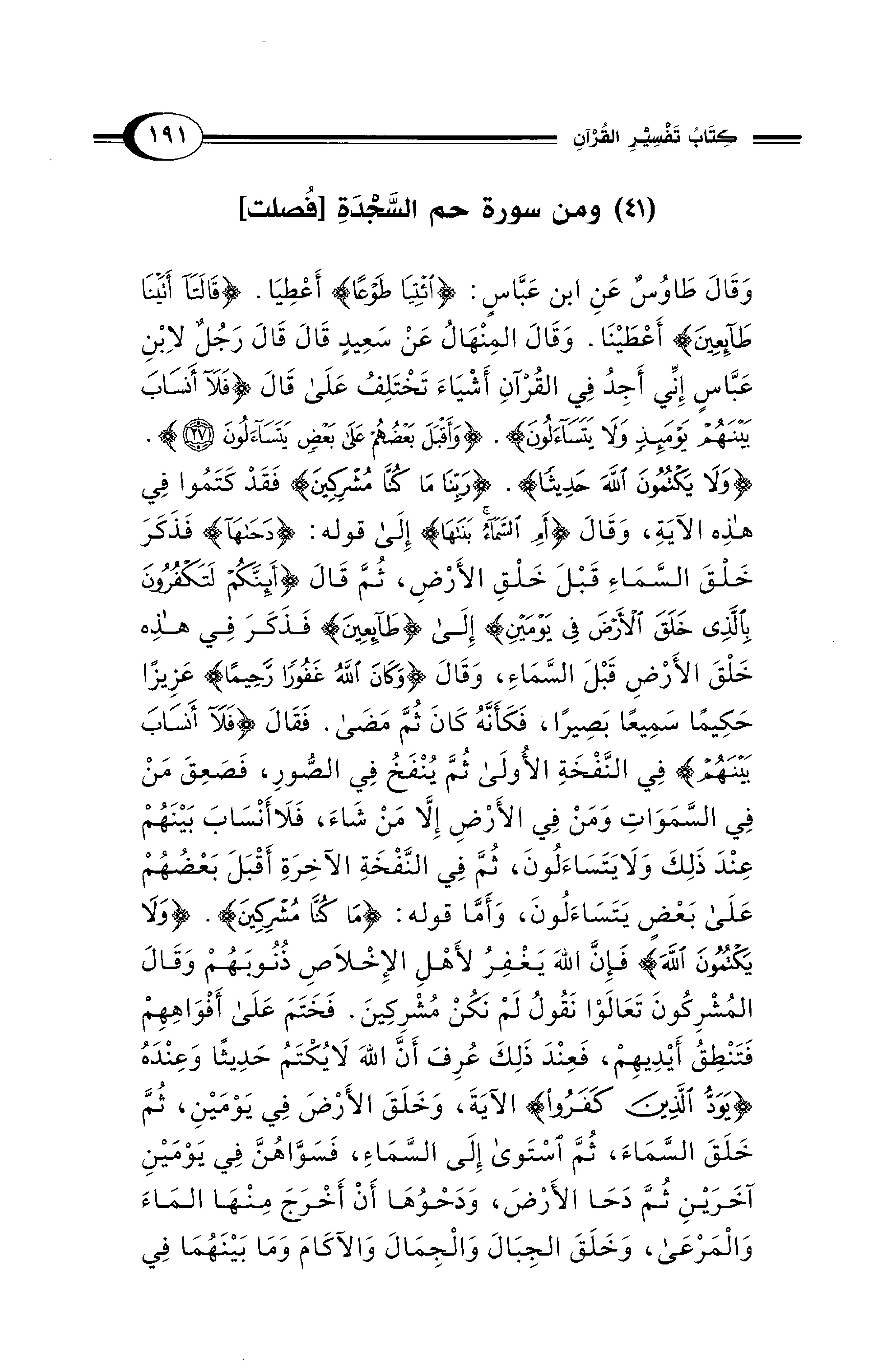 وَقَالَ طَاوُسٌ عَنِ ابن عَبَّاسٍ: {ائْتِيَا طَوْعًا} أَعْطِيَا. {قَالَتَا أَتَيْنَا طَائِعِينَ} أَعْطَيْنَا. وَقَالَ المِنْهَالُ عَنْ سَعِيدٍ قَالَ قَالَ رَجُلٌ لاِبْنِ عَبَّاسٍ إِنِّي أَجِدُ فِي القُرْآنِ أَشْيَاءَ تَخْتَلِفُ عَلَيَّ قَالَ {فَلَا أَنْسَابَ بَيْنَهُمْ يَوْمَئِذٍ وَلَا يَتَسَاءَلُونَ} {وَأَقْبَلَ بَعْضُهُمْ عَلَى بَعْضٍ يَتَسَاءَلُونَ (27)}. {وَلَا يَكْتُمُونَ اللهَ حَدِيثًا}. {رَبِّنَا مَا كُنَّا مُشْرِكِينَ} فَقَدْ كَتَمُوا فِي هذِه الآيَةِ، وَقَالَ {أَمِ السَّمَاءُ بَنَاهَا} إلى قوله: {دَحَاهَا} فَذَكَرَ خَلْقَ السَّمَاءٍ قَبْلَ خَلْقِ الأَرْضِ، ثُمَّ قَالَ {أَئِنَّكُمْ لَتَكْفُرُونَ بِالَّذِي خَلَقَ الْأَرْضَ فِي يَوْمَيْنِ} إلى {طَائِعِينَ} فَذكَرَ فِي هذِه خَلْقَ الأَرْضِ قَبْلَ السَّمَاءِ، وَقَالَ {وَكَانَ اللهُ غَفُورًا رَحِيمًا} عَزِيزًا حَكِيمًا سَمِيعًا بَصِيرًا، فَكَأَنَّهُ كَانَ ثُمَّ مَضَى. فَقَالَ {فَلَا أَنْسَابَ بَيْنَهُمْ} فِي النَّفْخَةِ الأُولَى ثُمَّ يُنْفَخُ فِي الصُّورِ، فَصَعِقَ مَنْ فِي السَّمَوَاتِ وَمَنْ فِي الأَرْضِ إِلَّا مَنْ شاءَ، فَلَا أَنْسَابَ بَيْنَهُمْ عِنْدَ ذَلِكَ وَلَا يَتَسَاءَلُونَ، ثُمَّ فِي النَّفْخَةِ الآخِرَةِ أَقْبَلَ بَعْضُهُمْ على بَعْضٍ يَتَسَاءَلُونَ، وَأَمَّا قوله: {مَا كُنَّا مُشْرِكِينَ}. {وَلَا يَكْتُمُونَ اللهَ} فَإِنَّ اللهَ يَغْفِرُ لأَهْلِ الإِخْلاَصِ ذُنُوبَهُمْ وَقَالَ المُشْرِكُونَ تَعَالَوْا نَقُولُ لَمْ نَكُنْ مُشْرِكِينَ. فَخَتَمَ على أَفْوَاهِهِمْ فَتَنْطِقُ أَيْدِيهِمْ، فَعِنْدَ ذَلِكَ عُرِفَ أَنَّ اللهَ لَا يُكْتَمُ حَدِيثًا وَعِنْدَهُ {يَوَدُّ الَّذِينَ كَفَرُوا} الآيَةَ، وَخَلَقَ الأَرْضَ فِي يَوْمَيْنِ، ثُمَّ خَلَقَ السَّمَاءَ، ثُمَّ اسْتَوى إِلَى السَّمَاءِ، فَسَوَّاهُنَّ فِي يَوْمَيْنِ آخَرَيْنِ ثُمَّ دَحَا الأَرْضَ، وَدَحْوُهَا أَنْ أَخْرَجَ مِنْهَا المَاءَ وَالْمَرْعَى، وَخَلَقَ الجِبَالَ وَالْجِمَالَ وَالآكَامَ وَمَا بَيْنَهُمَا فِي