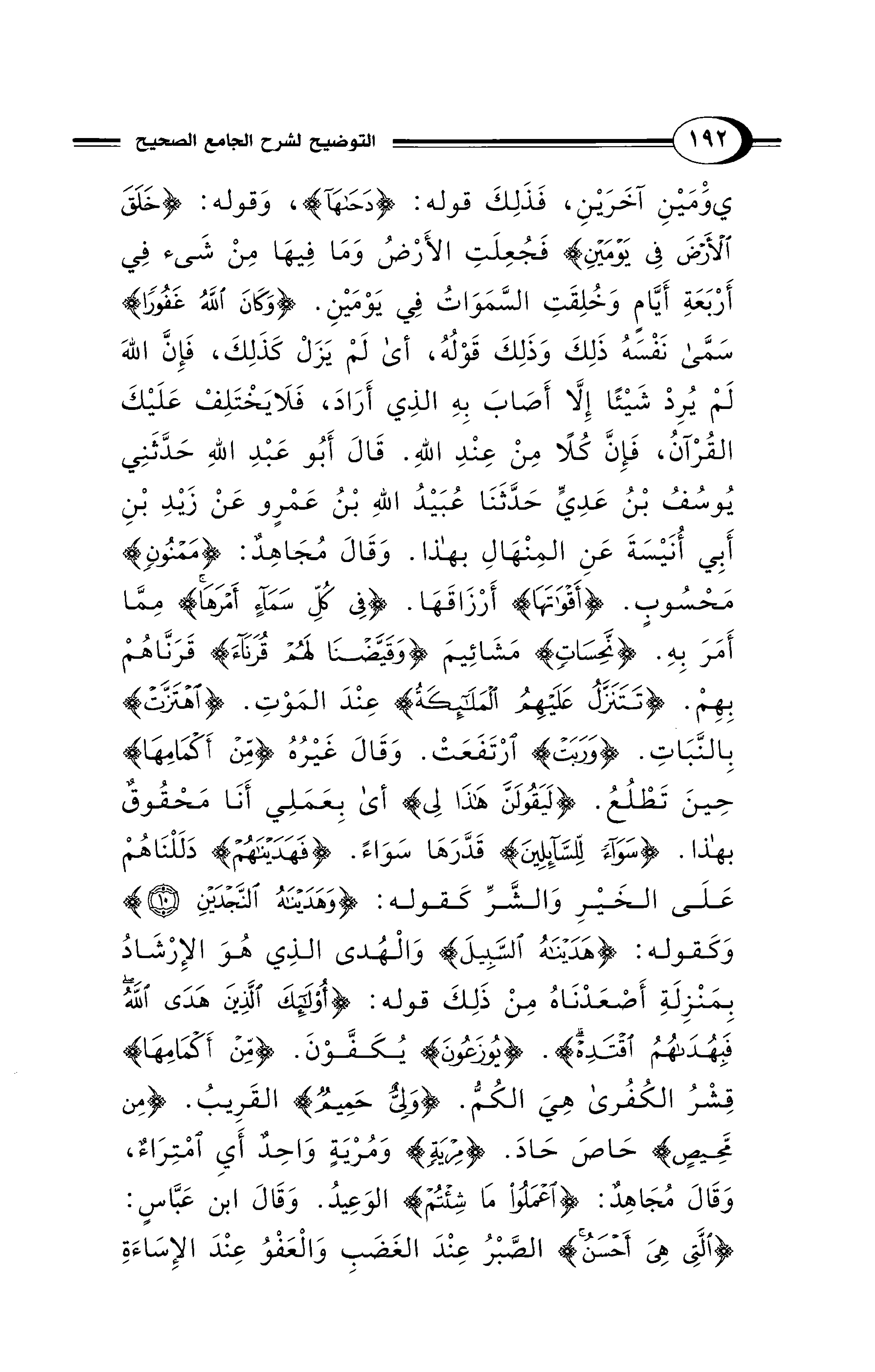 يَوْمَيْنِ آخَرَيْنِ، فَذَلِكَ قوله: {دَحَاهَا}، وَقوله: {خَلَقَ الْأَرْضَ فِي يَوْمَيْنِ} فَجُعِلَتِ الأَرْضُ وَمَا فِيهَا مِنْ شَىء فِي أَرْبَعَةِ أَيَّامٍ وَخُلِقَتِ السَّمَوَاتُ فِي يَوْمَيْنِ. {وَكَانَ اللهُ غَفُورًا} سَمَّى نَفْسَهُ ذَلِكَ وَذَلِكَ قَوْلُهُ، أي لَمْ يَزَلْ كَذَلِكَ، فَإِنَّ اللهَ لَمْ يُرِدْ شَيْئًا إِلَّا أَصَابَ بِهِ الذِي أَرَادَ، فَلَا يَخْتَلِفْ عَلَيْكَ القُرْآنُ، فَإِنَّ كُلًا مِنْ عِنْدِ اللهِ. قَالَ أَبُو عَبْدِ اللهِ حَدَّثَنِي يُوسُفُ بْنُ عَدِيٍّ حَدَّثَنَا عُبَيْدُ اللهِ بْنُ عَمْرٍو عَنْ زَيْدِ بْنِ أَبِي أُنَيْسَةَ عَنِ المِنْهَالِ بهذا. وَقَالَ مُجَاهِدٌ: {مَمْنُونٍ} مَحْسُوبٍ. {أَقْوَاتَهَا} أَرْزَاقَهَا. {فِي كُلِّ سَمَاءٍ أَمْرَهَا} مِمَّا أَمَرَ بِهِ. {نَحِسَاتٍ} مَشَائِيمَ {وَقَيَّضْنَا لَهُمْ قُرَنَاءَ} قَرَنَّاهُمْ بِهِمْ. {تَتَنَزَّلُ عَلَيْهِمُ الْمَلَائِكَةُ} عِنْدَ المَوْتِ. {اهْتَزَّتْ} بِالنَّبَاتِ. {وَرَبَتْ} ارْتَفَعَتْ. وَقَالَ غَيْرُهُ {مِنْ أَكْمَامِهَا} حِينَ تَطْلُعُ. {لَيَقُولَنَّ هَذَا لِي} أي بِعَمَلِي أَنَا مَحْقُوقٌ بهذا. {سَوَاءً لِلسَّائِلِينَ} قَدَّرَهَا سوَاءً. {فَهَدَيْنَاهُمْ} دَلَلْنَاهُمْ عَلَى الخَيْرِ وَالشَّرِّ كَقوله: {وَهَدَيْنَاهُ النَّجْدَيْنِ (10)} وَكَقوله: {هَدَيْنَاهُ السَّبِيلَ} وَالْهُدى الذِي هُوَ الإِرْشَادُ بِمَنْزِلَةِ أَصْعَدْنَاهُ مِنْ ذَلِكَ قوله: {أُولَئِكَ الَّذِينَ هَدَى اللهُ فَبِهُدَاهُمُ اقْتَدِهْ} {يُوزَعُونَ} يُكَفَّوْنَ. {مِنْ أَكْمَامِهَا} قِشْرُ الكُفُرى هِيَ الكُمُّ. {وَلِيٌّ حَمِيمٌ} القَرِيبُ. {مِنْ مَّحِيصٍ} حَاصَ حَادَ. {مِرْيَةٍ} وَمِرْيَةٍ وَاحِدٌ أَيِ امْتِرَاءٌ، وَقَالَ مُجَاهِدٌ: {اعْمَلُوا مَا شِئْتُمْ} الوَعِيدُ. وَقَالَ ابن عَبَّاسٍ: {اْلَّتِي هِيَ أَحْسَنُ} الصَّبْرُ عِنْدَ الغَضَبِ وَالْعَفْوُ عِنْدَ الإِسَاءَةِ