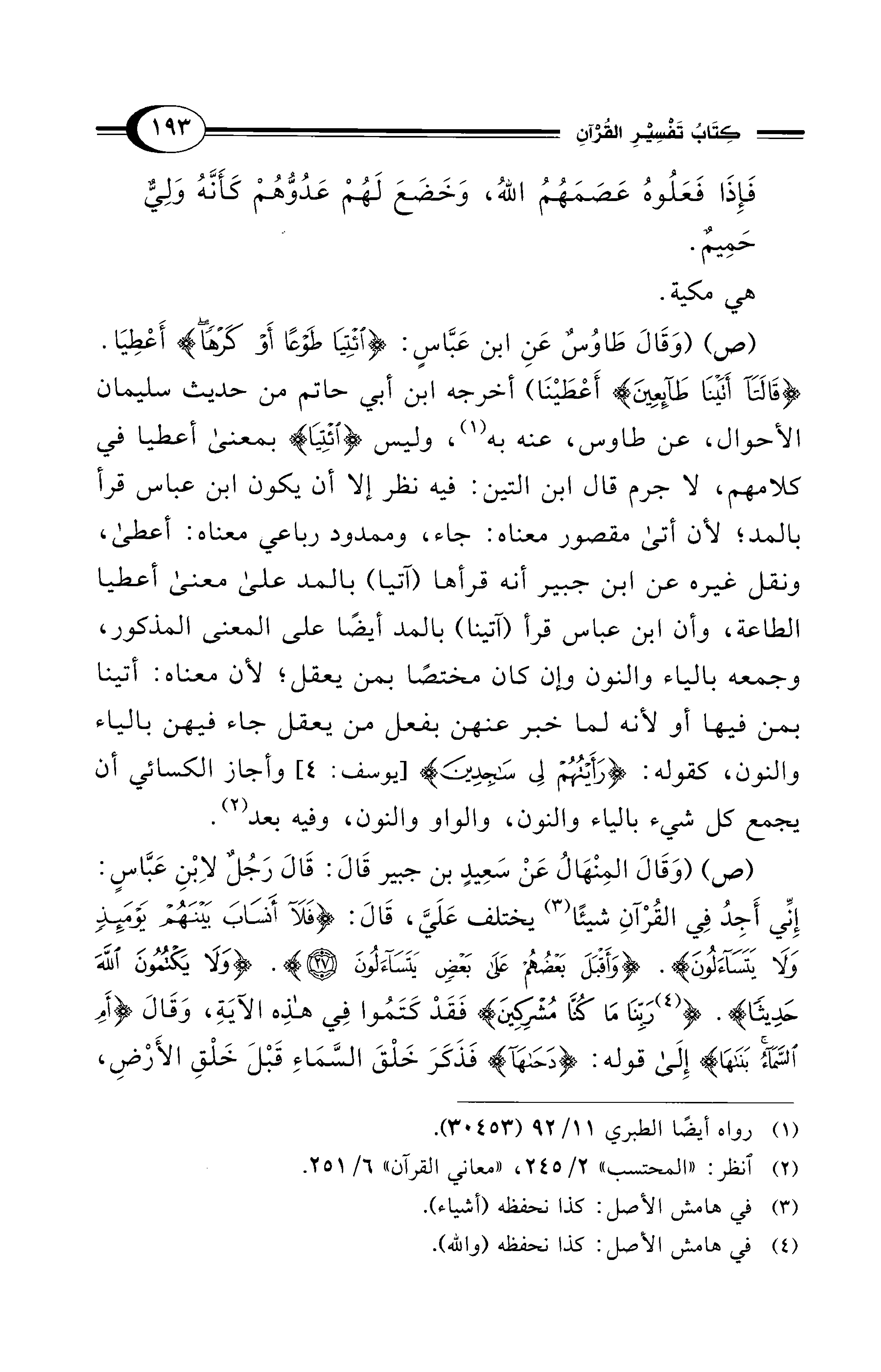 (ص) (وَقَال طَاوُسٌ عَنِ ابن عَبَّاسٍ: {ائْتِيَا طَوْعًا أَوْ كَرْهًا} أَعْطِيَا. {قَالَتَا أَتَيْنَا طَائِعِينَ} أَعْطَيْنَا) أخرجه ابن أبي حاتم من حديث سليمان الأحوال، عن طاوس، عنه به (¬1)، وليس {ائْتِيَا} بمعنى أعطيا في كلامهم، لا جرم قال ابن التين: فيه نظر إلا أن يكون ابن عباس قرأ بالمد؛ لأن أتى مقصور معناه: جاء، وممدود رباعي معناه: أعطى، ونقل غيره عن ابن جبير أنه قرأها (آتيا) بالمد على معنى أعطيا الطاعة، وأن ابن عباس قرأ (آتينا) بالمد أيضًا على المعنى المذكور، وجمعه بالياء والنون وإن كان مختصًا بمن يعقل؛ لأن معناه: أتينا بمن فيها أو لأنه لما خبر عنهن بفعل من يعقل جاء فيهن بالياء والنون، كقوله: {رَأَيْتُهُمْ لِي سَاجِدِينَ} [يوسف: 4] وأجاز الكسائي أن يجمع كل شيء بالياء والنون، والواو والنون، وفيه بعد (¬2).