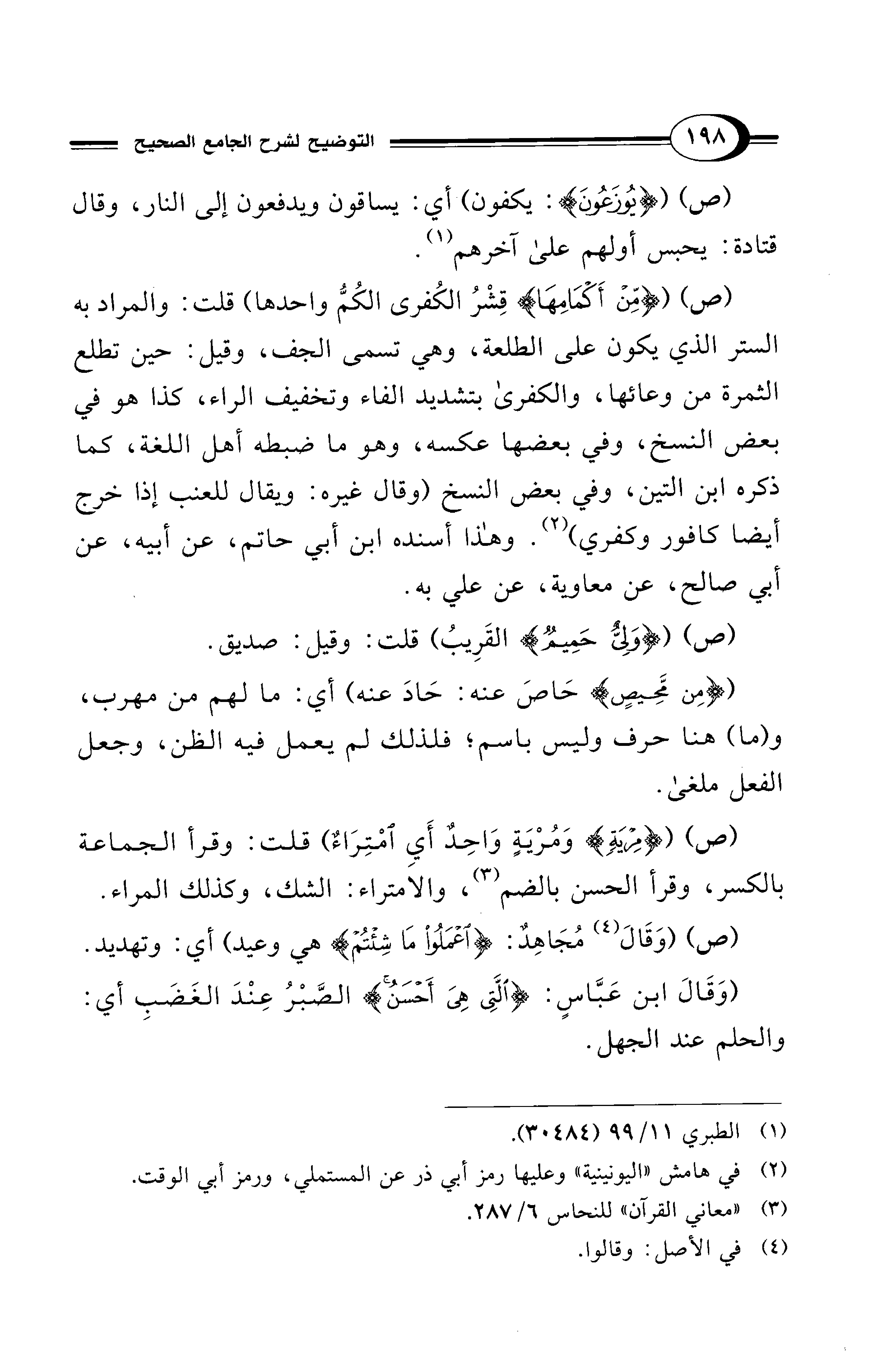 (ص) ({مِنْ أَكْمَامِهَا} قِشْرُ الكُفرى الكُمُّ واحدها) قلت: والمراد به الستر الذي يكون على الطلعة، وهي تسمى الجف، وقيل: حين تطلع الثمرة من وعائها، والكفرى بتشديد الفاء وتخفيف الراء، كذا هو في بعض النسخ، وفي بعضها عكسه، وهو ما ضبطه أهل اللغة، كما ذكره ابن التين، وفي بعض النسخ (وقال غيره: ويقال للعنب إذا خرج أيضا كافور وكفري) (¬2). وهذا أسنده ابن أبي حاتم، عن أبيه، عن أبي صالح، عن معاوية، عن علي به.