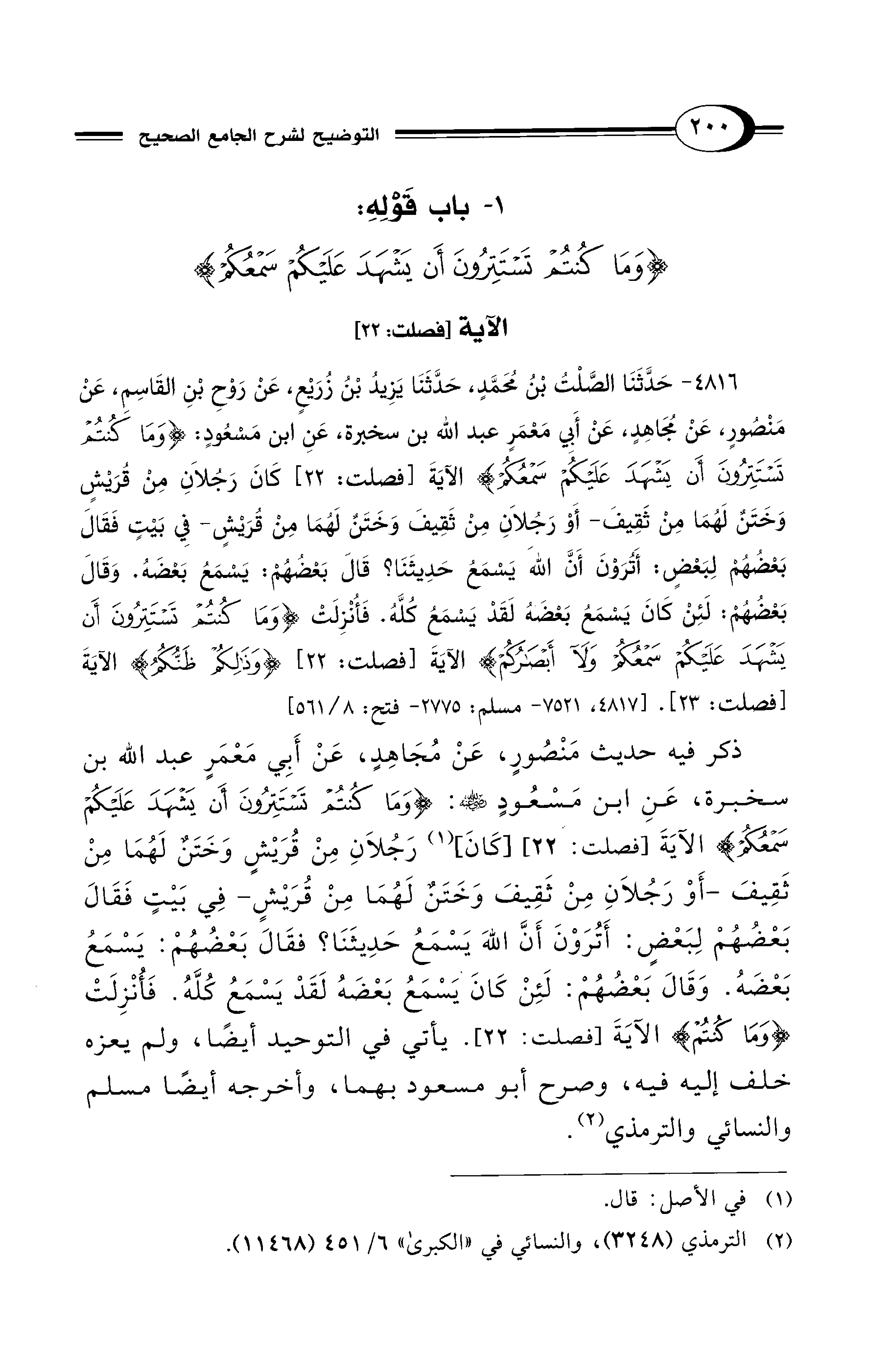 1 - باب قَوْلِهِ: {وَمَا كُنْتُمْ تَسْتَتِرُونَ أَنْ يَشْهَدَ عَلَيْكُمْ سَمْعُكُمْ} الآية [فصلت: 22]