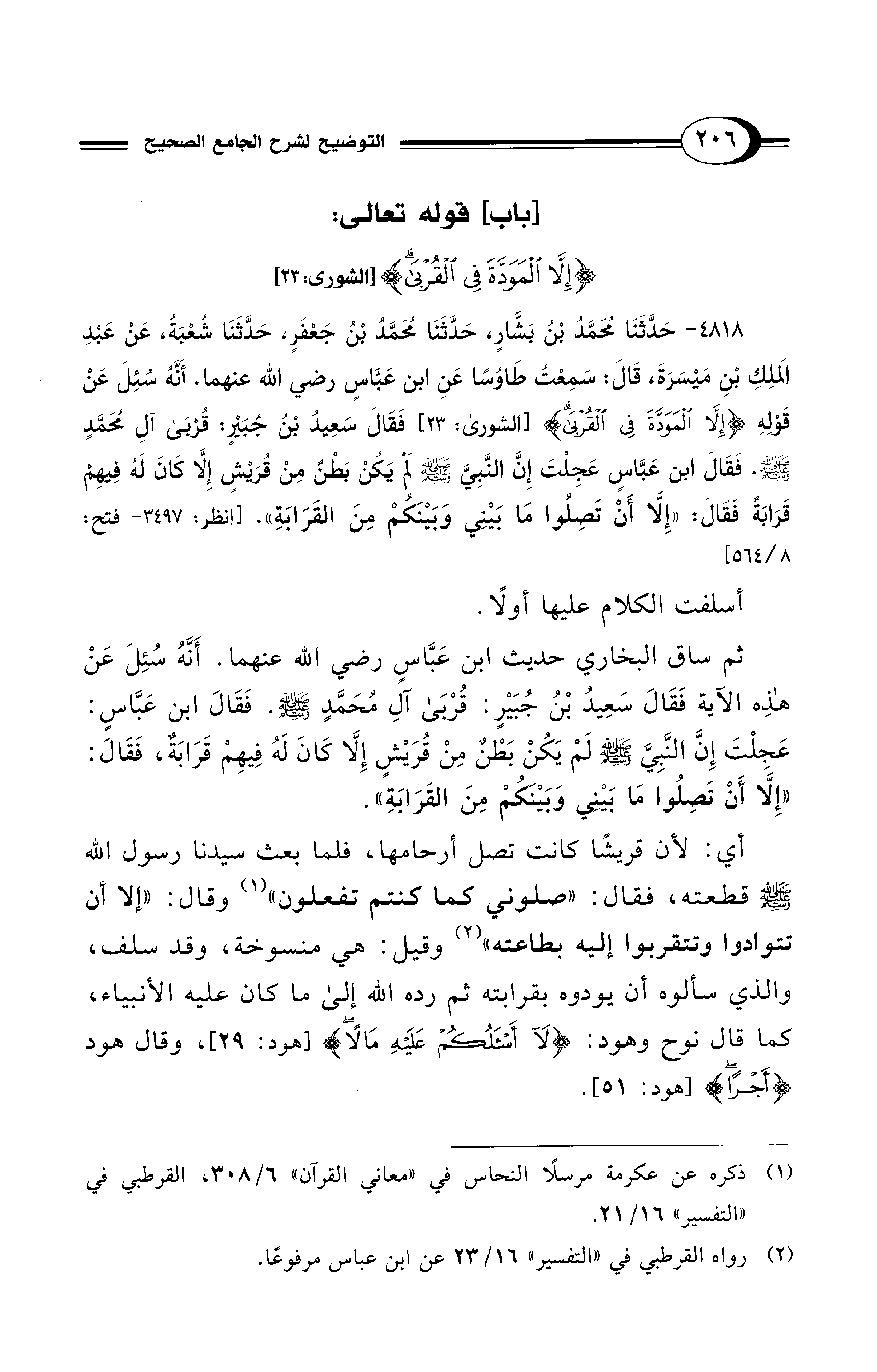 4818 - حَدَّثَنَا مُحَمَّدُ بْنُ بَشَّارٍ, حَدَّثَنَا مُحَمَّدُ بْنُ جَعْفَرٍ, حَدَّثَنَا شُعْبَةُ, عَنْ عَبْدِ الْمَلِكِ بْنِ مَيْسَرَةَ, قَالَ: سَمِعْتُ طَاوُسًا عَنِ ابْنِ عَبَّاسٍ - رضي الله عنهما -. أَنَّهُ سُئِلَ عَنْ قَوْلِهِ {إِلاَّ الْمَوَدَّةَ فِي الْقُرْبَى} [الشورى: 23] فَقَالَ سَعِيدُ بْنُ جُبَيْرٍ: قُرْبَى آلِ مُحَمَّدٍ - صلى الله عليه وسلم - فَقَالَ ابْنُ عَبَّاسٍ عَجِلْتَ إِنَّ النَّبِيَّ - صلى الله عليه وسلم - لَمْ يَكُنْ بَطْنٌ مِنْ قُرَيْشٍ إِلاَّ كَانَ لَهُ فِيهِمْ قَرَابَةٌ فَقَالَ: "إِلاَّ أَنْ تَصِلُوا مَا بَيْنِي وَبَيْنَكُمْ مِنَ الْقَرَابَةِ". [انظر: 3497 - فتح 8/ 564]