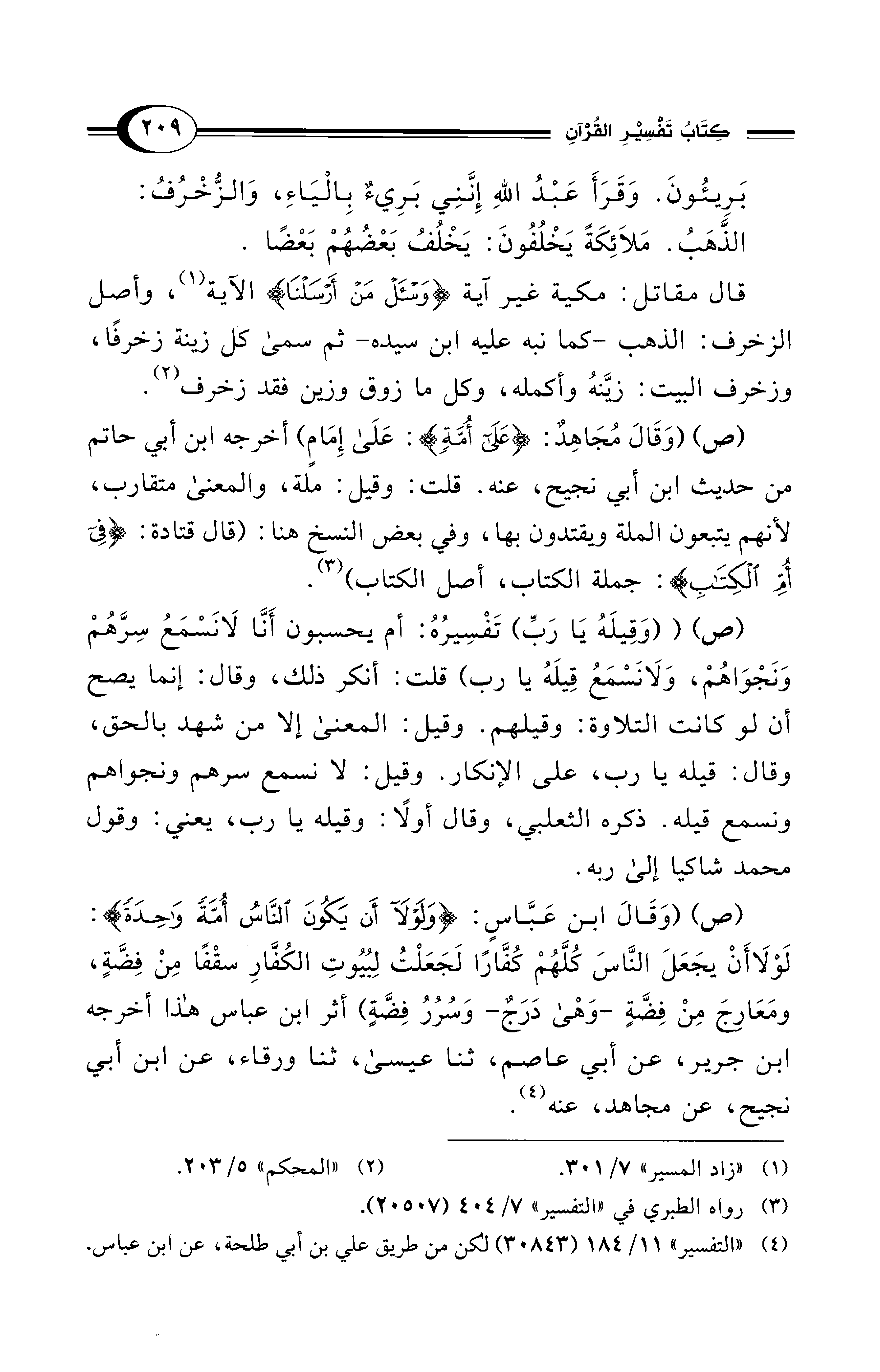 (ص) (وَقَالَ ابن عَبَّاسٍ: {وَلَوْلَا أَنْ يَكُونَ النَّاسُ أُمَّةً وَاحِدَةً}: لَوْلَا أَنْ يجَعَلَ النَّاسَ كُلَّهُمْ كُفَّارًا لَجَعَلْتُ لِبُيُوتِ الكُفَّارِ سقْفًا مِنْ فِضَّةٍ، ومَعَارجَ مِنْ فِضَّةٍ -وَهْى دَرَجٌ- وَسُرُرُ فِضَّةٍ) أثر ابن عباس هذا أخرجه ابن جرير، عن أبي عاصم، ثنا عيسى، ثنا ورقاء، عن ابن أبي نجيح، عن مجاهد، عنه (¬4).