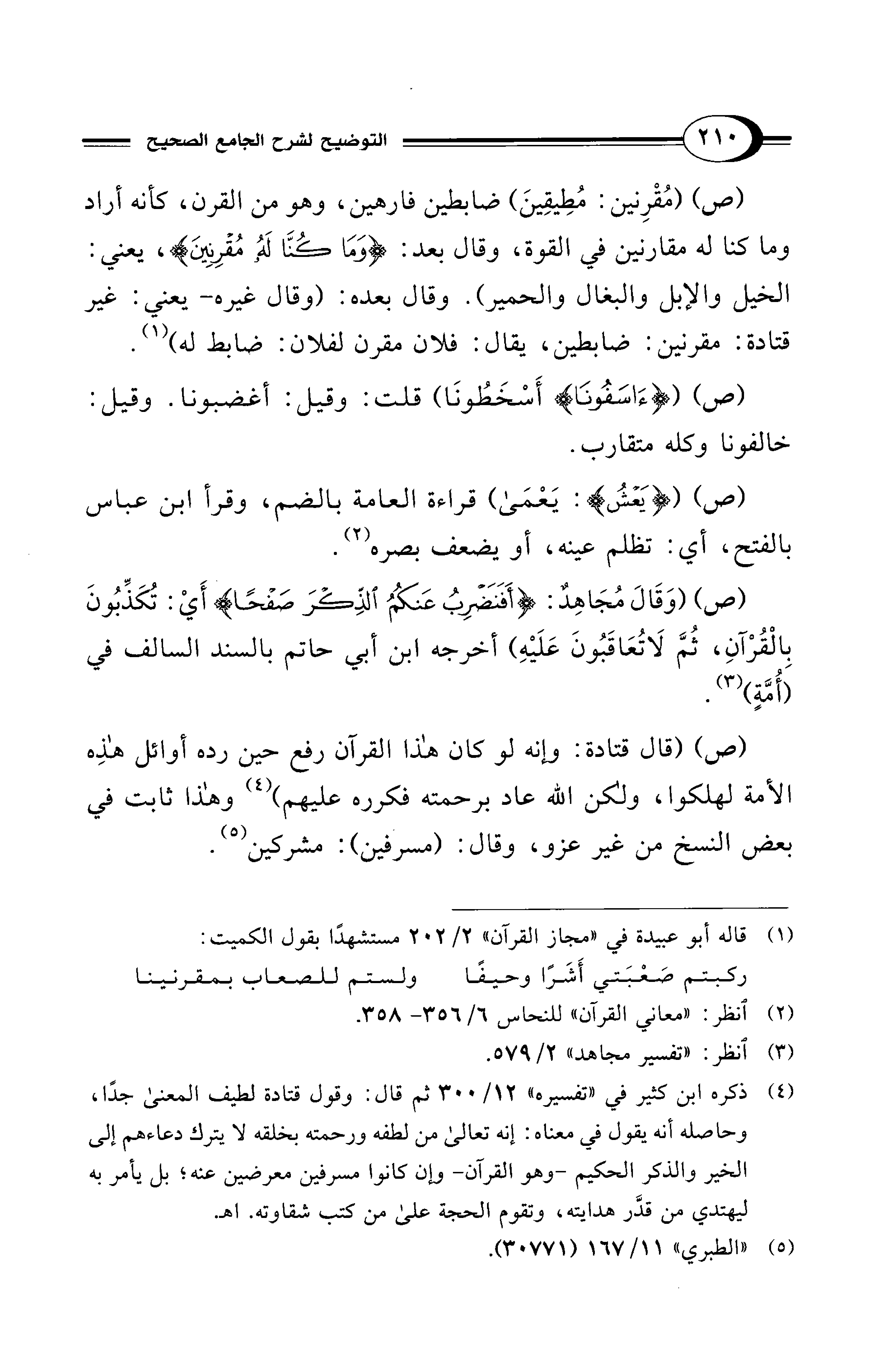 (ص) (وَقَالَ مُجَاهِدٌ: {أَفَنَضْرِبُ عَنْكُمُ الذِّكْرَ صَفْحًا} أَيْ: تُكَذِّبُونَ بِالْقُرْآنِ، ثُمَّ لَا تُعَاقَبُونَ عَلَيْهِ) أخرجه ابن أبي حاتم بالسند السالف في (أُمَةٍ) (¬3).
