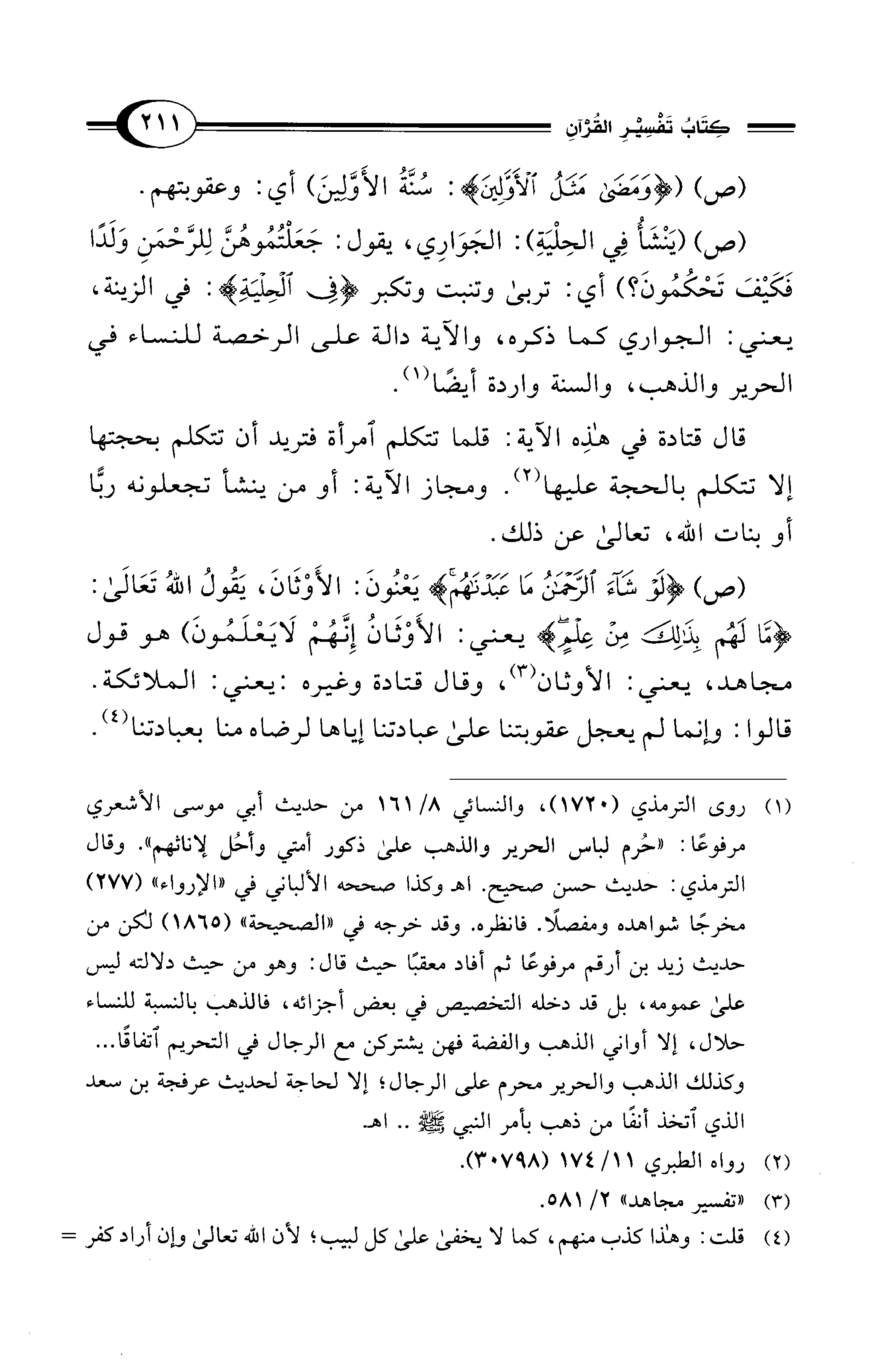 (ص) (يَنْشَأُ فِي الحِلْيَةِ): الجَوَارِي، يقول: جَعَلْتُمُوهُنَّ لِلرَّحْمَنِ وَلَدًا فَكَيْفَ تَحْكُمُونَ؟) أي: تربى وتنبت وتكبر {فِي الْحِلْيَةِ}: في الزينة، يعني: الجواري كما ذكره، والآية دالة على الرخصة للنساء في الحرير والذهب، والسنة واردة أيضًا (¬1).