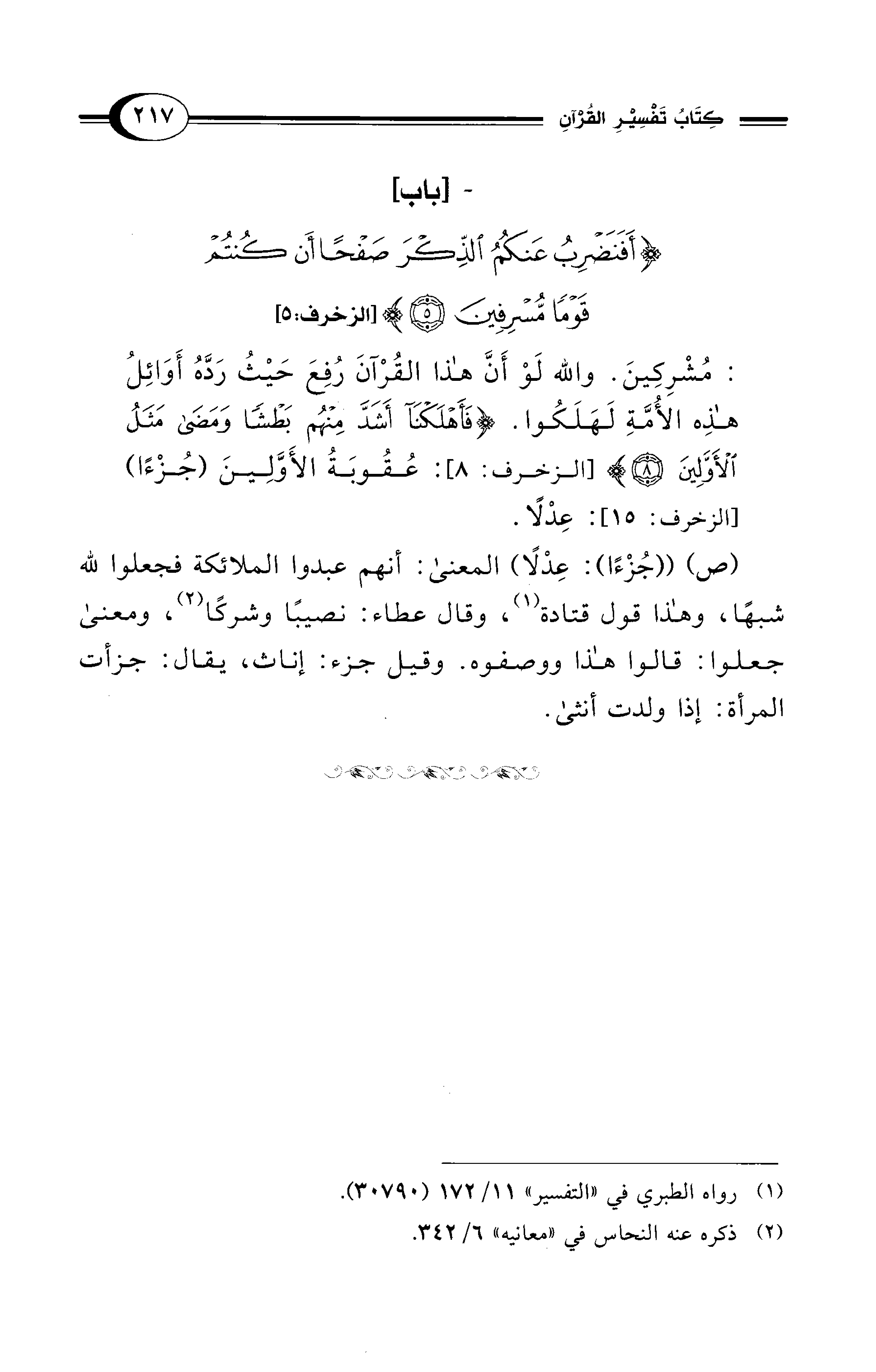 : مُشْرِكِينَ. والله لَوْ أَنَّ هذا القُرْاَنَ رُفِعَ حَيْثُ رَدَّهُ أَوَائِلُ هذِه الأُمَّةِ لَهَلَكُوا. {فَأَهْلَكْنَا أَشَدَّ مِنْهُمْ بَطْشًا وَمَضَى مَثَلُ الْأَوَّلِينَ (8)} [الزخرف: 8] عُقُوبَةُ الأَوَّلِينَ (جُزْءًا) [الزخرف: 15]: عِدْلًا.