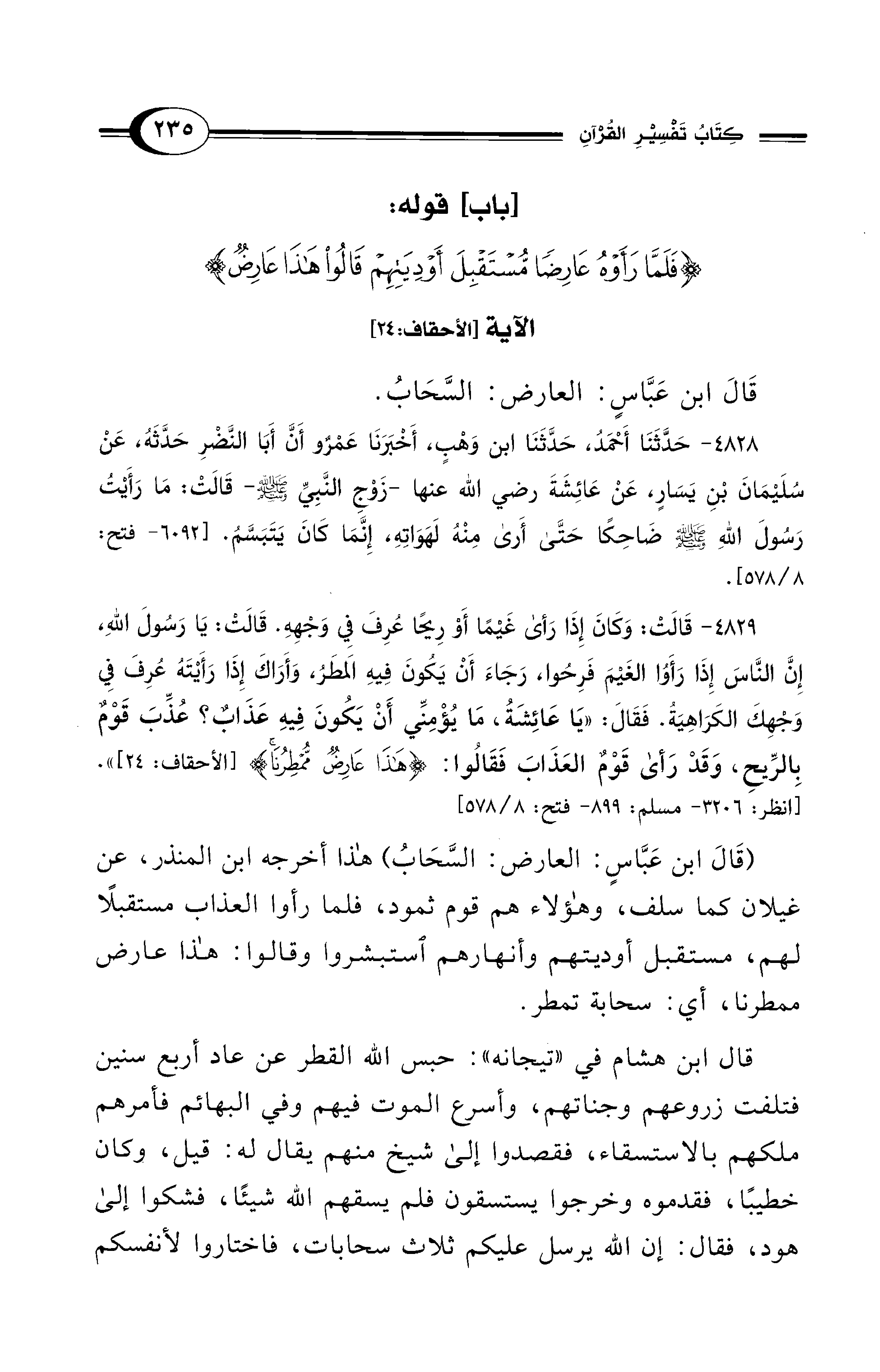 [باب] قوله: {فَلَمَّا رَأَوْهُ عَارِضًا مُسْتَقْبِلَ أَوْدِيَتِهِمْ قَالُوا هَذَا عَارِضٌ} الآية [الأحقاف: 24]