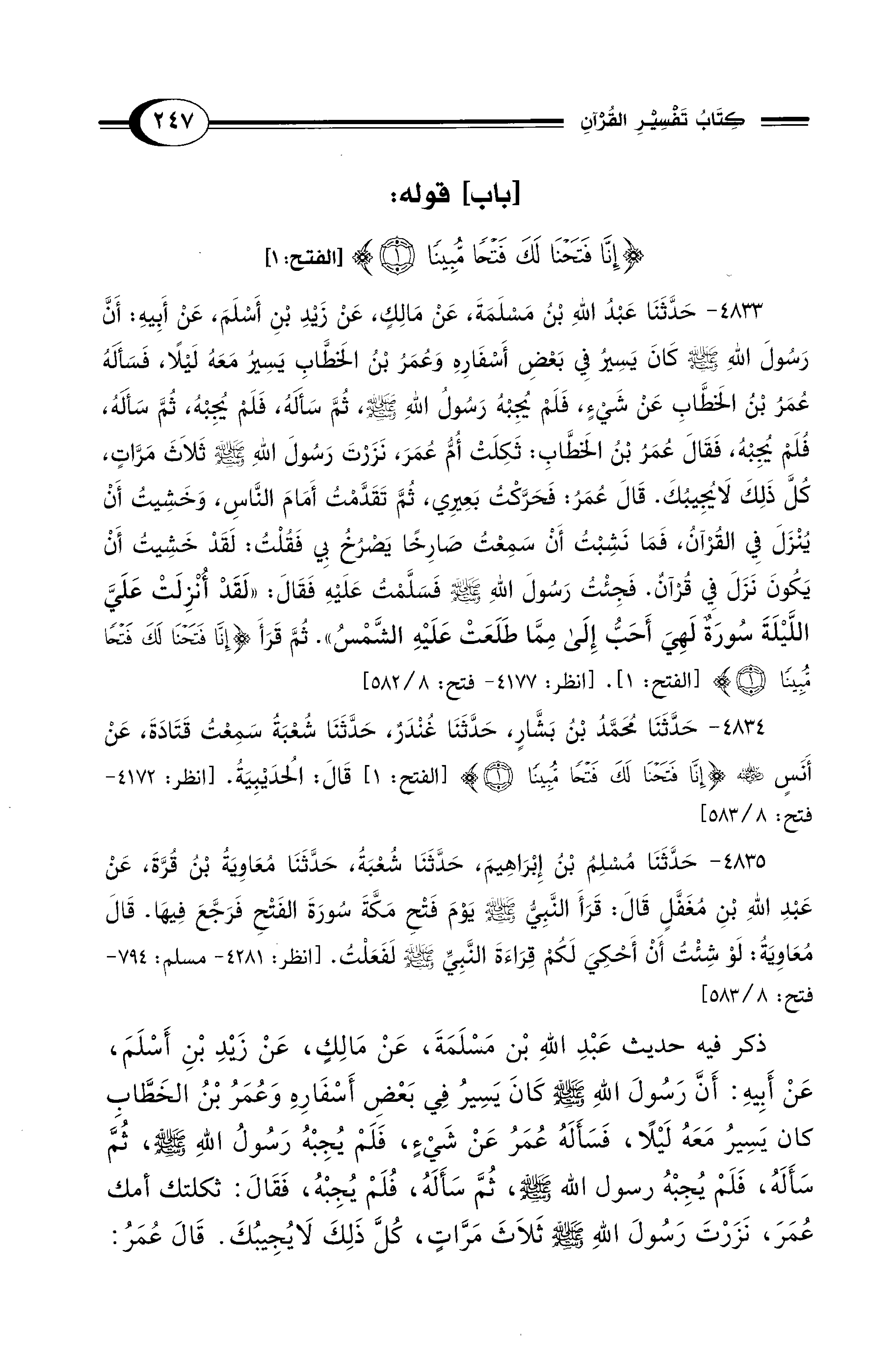 4833 - حَدَّثَنَا عَبْدُ اللهِ بْنُ مَسْلَمَةَ, عَنْ مَالِكٍ, عَنْ زَيْدِ بْنِ أَسْلَمَ, عَنْ أَبِيهِ: أَنَّ رَسُولَ اللهِ - صلى الله عليه وسلم - كَانَ يَسِيرُ فِي بَعْضِ أَسْفَارِهِ وَعُمَرُ بْنُ الْخَطَّابِ يَسِيرُ مَعَهُ لَيْلاً، فَسَأَلَهُ عُمَرُ بْنُ الْخَطَّابِ عَنْ شَيْءٍ، فَلَمْ يُجِبْهُ رَسُولُ اللهِ - صلى الله عليه وسلم - ثُمَّ سَأَلَهُ, فَلَمْ يُجِبْهُ، ثُمَّ سَأَلَهُ, فُلَمْ يُجِبْهُ، فَقَالَ عُمَرُ بْنُ الْخَطَّابِ: ثَكِلَتْ أُمُّ عُمَرَ، نَزَرْتَ رَسُولَ اللهِ - صلى الله عليه وسلم - ثَلاَثَ مَرَّاتٍ، كُلَّ ذَلِكَ لاَ يُجِيبُكَ. قَالَ عُمَرُ: فَحَرَّكْتُ بَعِيرِي، ثُمَّ تَقَدَّمْتُ أَمَامَ النَّاسِ، وَخَشِيتُ أَنْ يُنْزَلَ فِيَّ الْقُرْآنُ، فَمَا نَشِبْتُ أَنْ سَمِعْتُ صَارِخًا يَصْرُخُ بِي فَقُلْتُ: لَقَدْ خَشِيتُ أَنْ يَكُونَ نَزَلَ فِيَّ قُرْآنٌ. فَجِئْتُ رَسُولَ اللهِ - صلى الله عليه وسلم - فَسَلَّمْتُ عَلَيْهِ فَقَالَ: «لَقَدْ أُنْزِلَتْ عَلَيَّ اللَّيْلَةَ سُورَةٌ لَهِيَ أَحَبُّ إِلَيَّ مِمَّا طَلَعَتْ عَلَيْهِ الشَّمْسُ». ثُمَّ قَرَأَ {إِنَّا فَتَحْنَا لَكَ فَتْحًا مُبِينًا (1)}. [الفتح: 1]. [انظر: 4177 - فتح: 8/ 582]