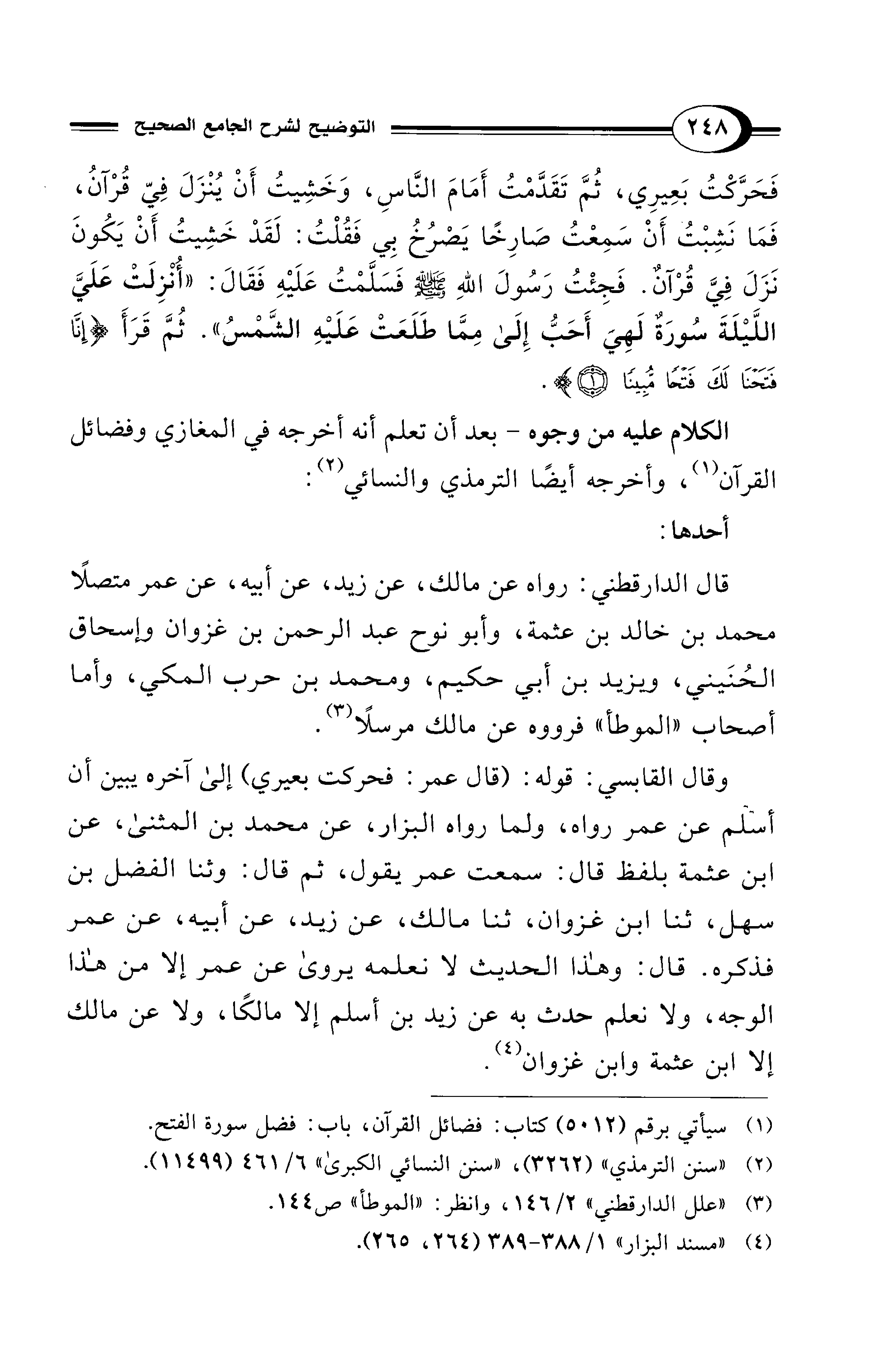 وقال القابسي: قوله: (قال عمر: فحركت بعيري) إلى آخره يبين أن أسلم عن عمر رواه، ولما رواه البزار، عن محمد بن المثنى، عن ابن عثمة بلفظ قال: سمعت عمريقول، ثم قال: وثنا الفضل بن سهل، ئنا ابن غزوان، ثنا مالك، عن زيد، عن أبيه، عن عمر فذكره. قال: وهذا الحديث لا نعلمه يروى عن عمر إلا من هذا الوجه، ولا نعلم حدث به عن زيد بن أسلم إلا مالكًا، ولا عن مالك إلا ابن عثمة وابن غزوان (¬4).