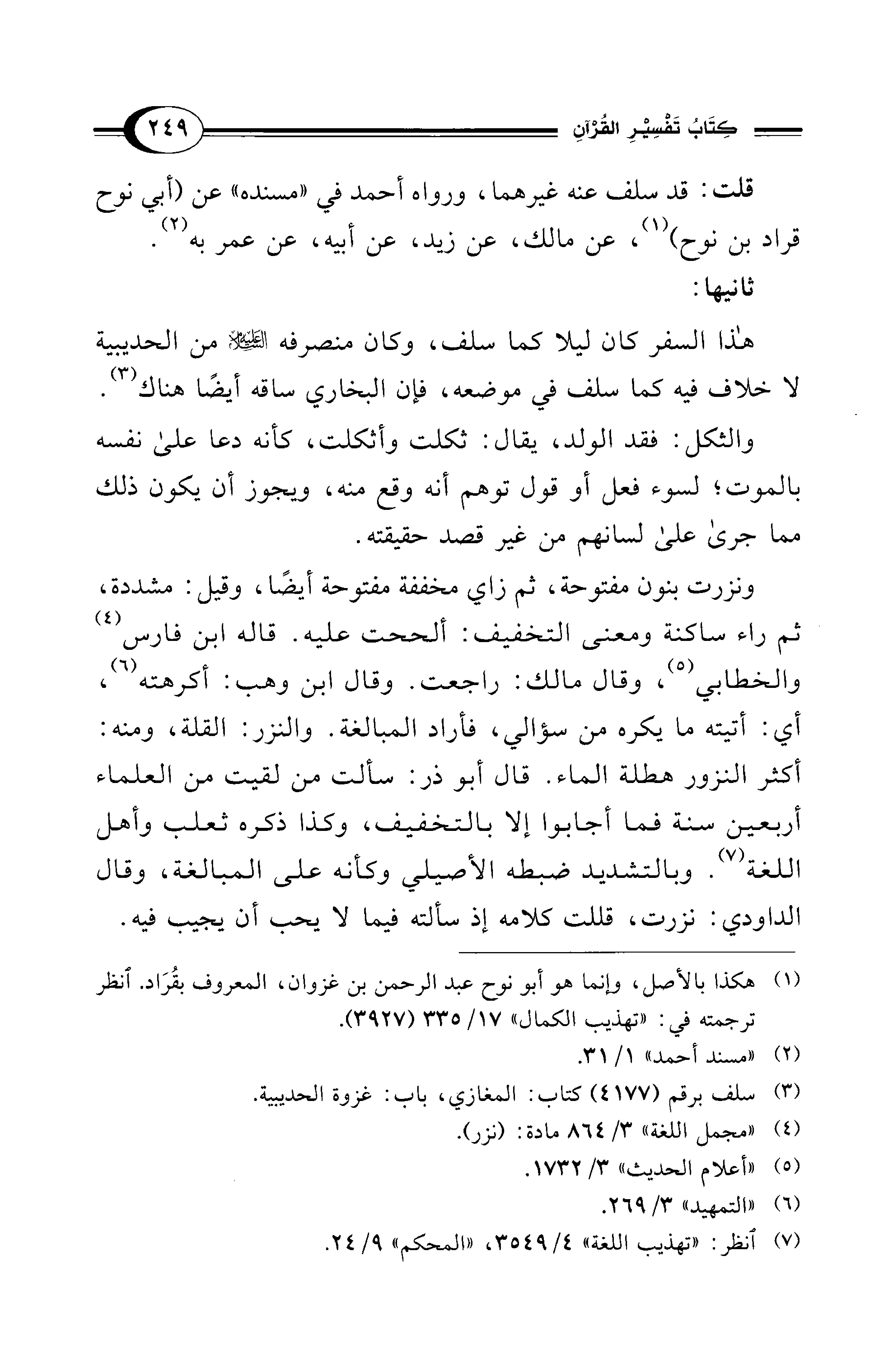 ونزرت بنون مفتوحة، ثم زاي مخففة مفتوحة أيضًا، وقيل: مشددة، ثم راء ساكنة ومعنى التخفيف: ألححت عليه. قاله ابن فارس (¬4) والخطابي (¬5)، وقال مالك: راجعت. وقال ابن وهب: أكرهته (¬6)، أي: أتيته ما يكره من سؤالي، فأراد المبالغة. والنزر: القلة، ومنه: أكثر النزور هطلة الماء. قال أبو ذر: سألت من لقيت من العلماء أربعين سنة فما أجابوا إلا بالتخفيف، وكذا ذكره ثعلب وأهل اللغة (¬7). وبالتشديد ضبطه الأصيلي وكأنه على المبالغة، وقال الداودي: نزرت، قللت كلامه إذ سألته فيما لا يحب أن يجيب فيه.