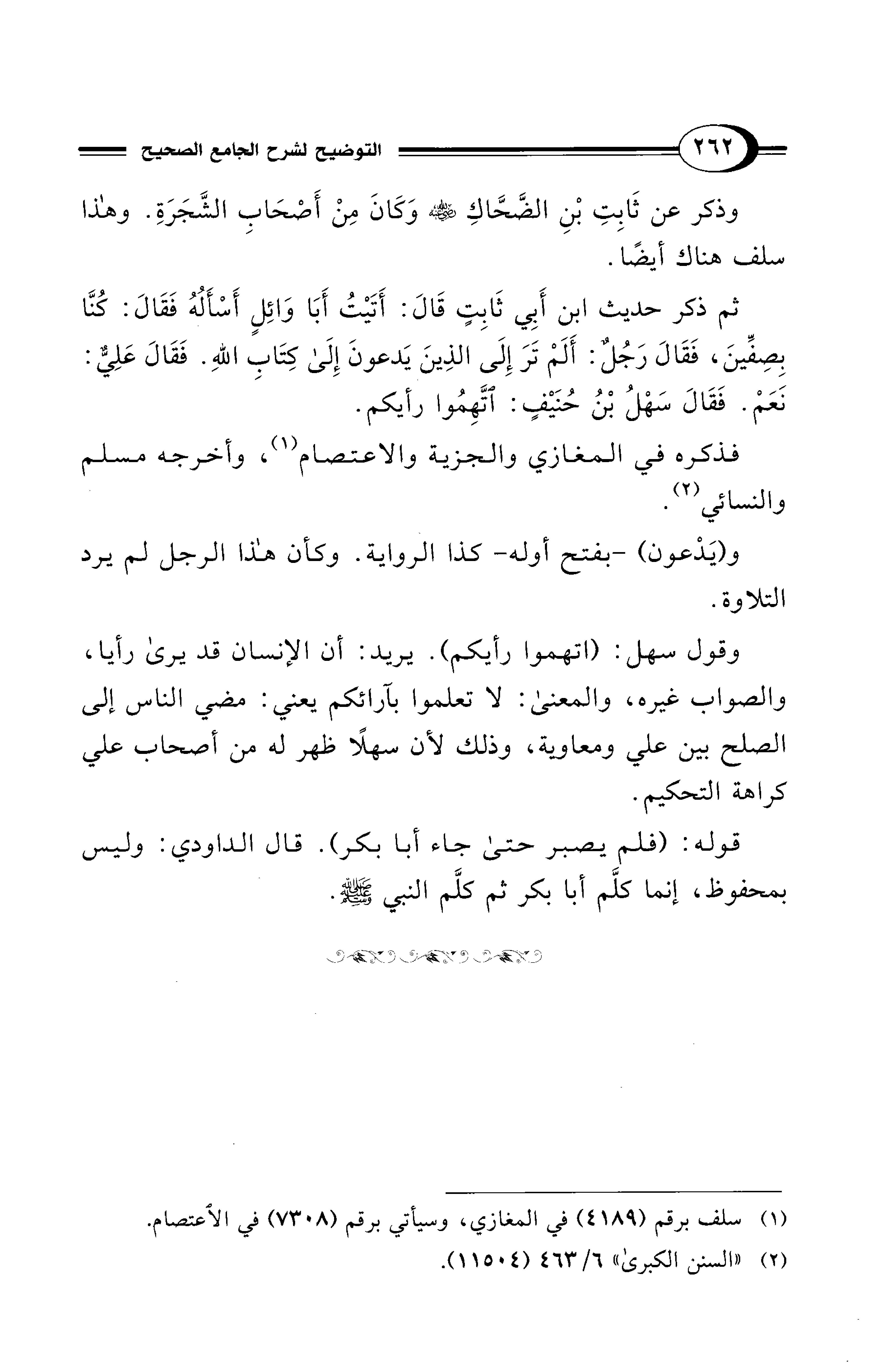ثم ذكر حديث ابن أَبِي ثَابِتٍ قَالَ: أَتَيْتُ أَبَا وَائِلٍ أَسْأَلُهُ فَقَالَ: كُنَّا بِصفِّينَ، فَقَالَ رَجُلٌ: أَلَمْ تَرَ إِلَى الذِينَ يَدعونَ إِلَى كِتَابِ اللهِ. فَقَالَ عَلِيٌّ: نَعَمْ. فَقَالَ سَهْلُ بْنُ حُنَيْفٍ: اْتَّهِمُوا رأيكم.