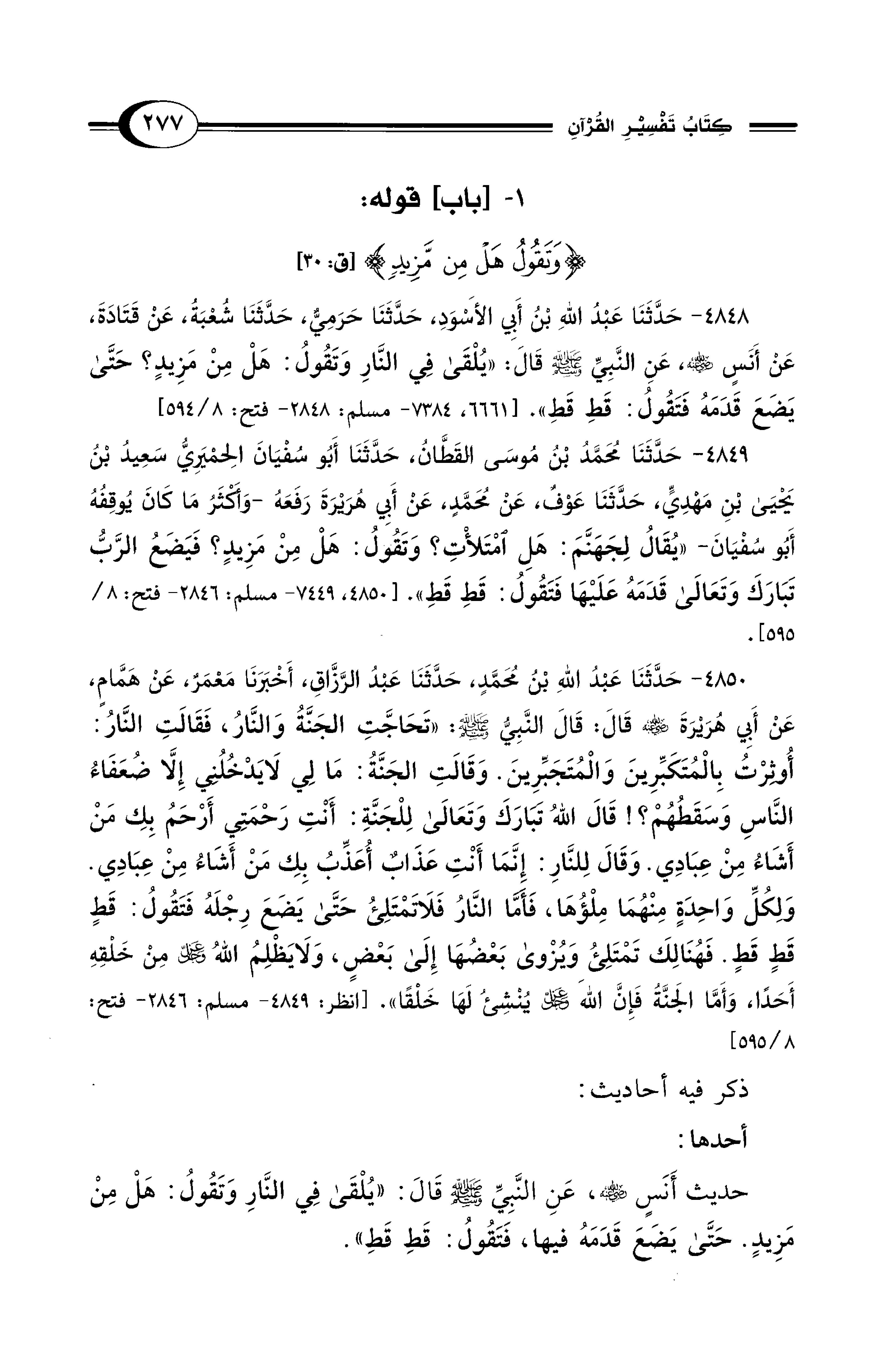 4848 - حَدَّثَنَا عَبْدُ اللهِ بْنُ أَبِي الأَسْوَدِ, حَدَّثَنَا حَرَمِيٌّ, حَدَّثَنَا شُعْبَةُ, عَنْ قَتَادَةَ, عَنْ أَنَسٍ - رضي الله عنه - عَنِ النَّبِيِّ - صلى الله عليه وسلم - قَالَ: «يُلْقَى فِي النَّارِ وَتَقُولُ هَلْ مِنْ مَزِيدٍ؟ حَتَّى يَضَعَ قَدَمَهُ فَتَقُولُ: قَطِ قَطِ». [6661، 7384 - مسلم: 2848 - فتح: 8/ 594]