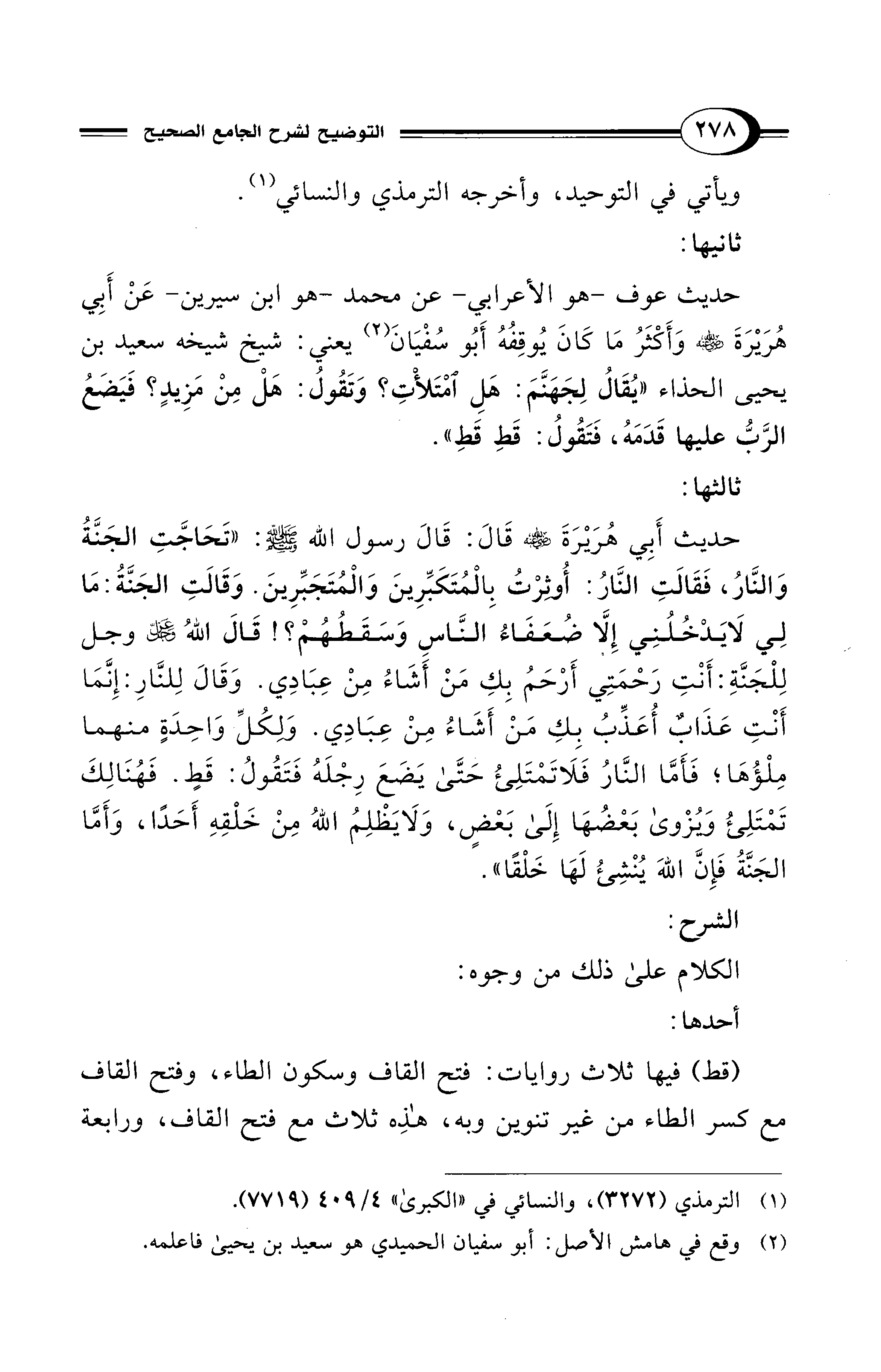 حديث عوف -هو الأعرابي- عن محمد -هو ابن سيرين- عَنْ أَبِي هُرَيْرَةَ - رضي الله عنه - وَأَكْثَرُ مَا كَانَ يُوقِفُهُ أَبُو سُفْيَانَ (¬2) يعني: شيخ شيخه سعيد بن يحيى الحذاء "يُقَالُ لِجَهَنَّمَ: هَلِ امْتَلأْتِ؟ وَتَقُولُ: هَلْ مِنْ مَزِيدٍ؟ فَيَضَعُ الرَّبُّ عليها قَدَمَهُ، فَتَقُولُ: قَطِ قَطِ".