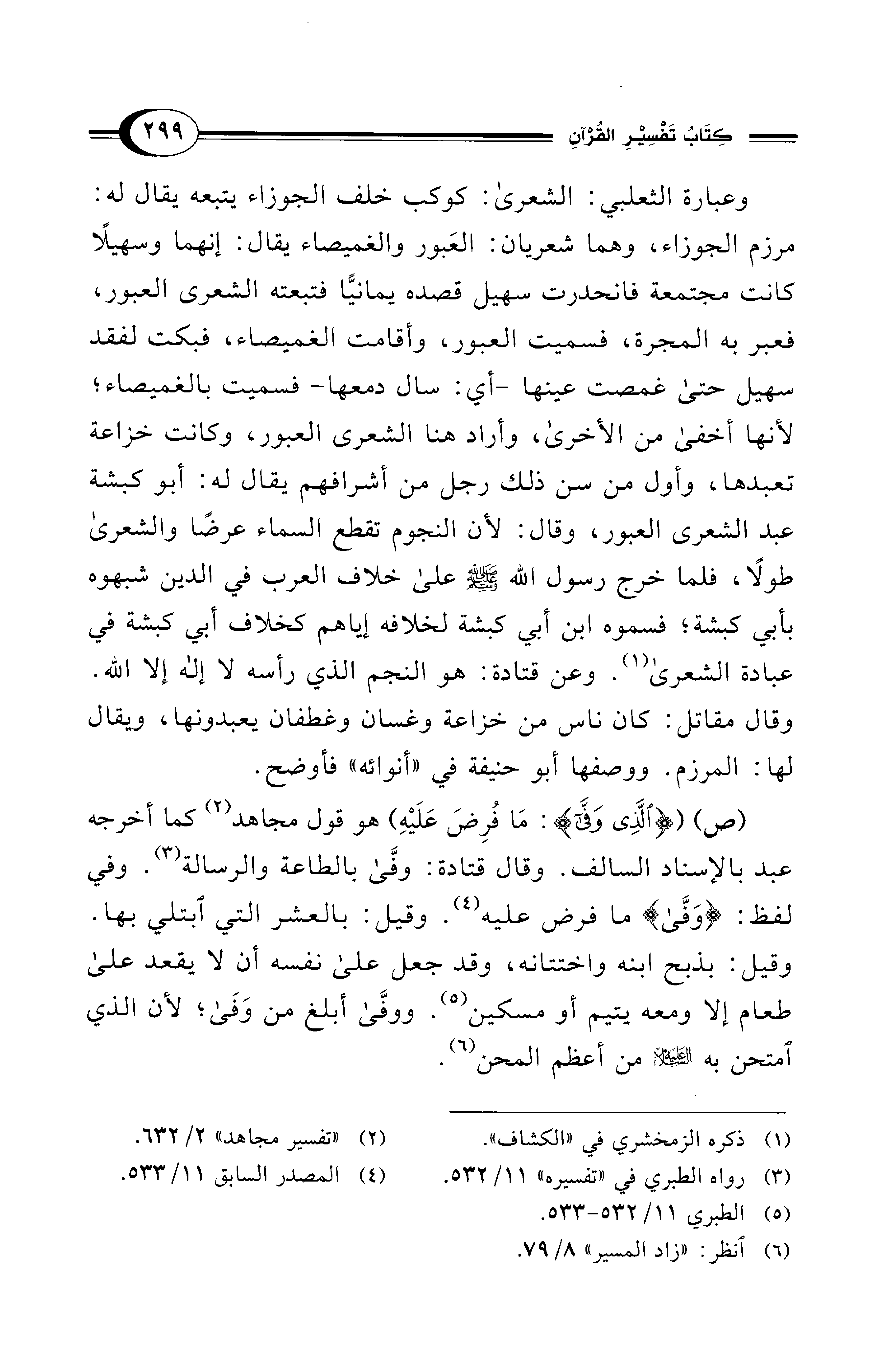 وعبارة الثعلبي: الشعرى: كوكب خلف الجوزاء يتبعه يقال له: مرزم الجوزاء، وهما شعريان: العَبور والغميصاء يقال: إنهما وسهيلًا كانت مجتمعة فانحدرت سهيل قصده يمانيًّا فتبعته الشعرى العبور، فعبر به المجرة، فسميت العبور، وأقامت الغميصاء، فبكت لفقد سهيل حتى غمصت عينها -أي: سال دمعها- فسميت بالغميصاء؛ لأنها أخفى من الأخرى، وأراد هنا الشعرى العبور، وكانت خزاعة تعبدها، وأول من سن ذلك رجل من أشرافهم يقال له: أبو كبشة عبد الشعرى العبور، وقال: لأن النجوم تقطع السماء عرضًا والشعرى طولًا، فلما خرج رسول الله - صلى الله عليه وسلم - على خلاف العرب في الدين شبهوه بأبي كبشة؛ فسموه ابن أبي كبشة لخلافه إياهم كخلاف أبي كبشة في عبادة الشعرى (¬1). وعن قتادة: هو النجم الذي رأسه لا إله إلا الله. وقال مقاتل: كان ناس من خزاعة وغسان وغطفان يعبدونها، ويقال لها: المرزم. ووصفها أبو حنيفة في "أنوائه" فأوضح.