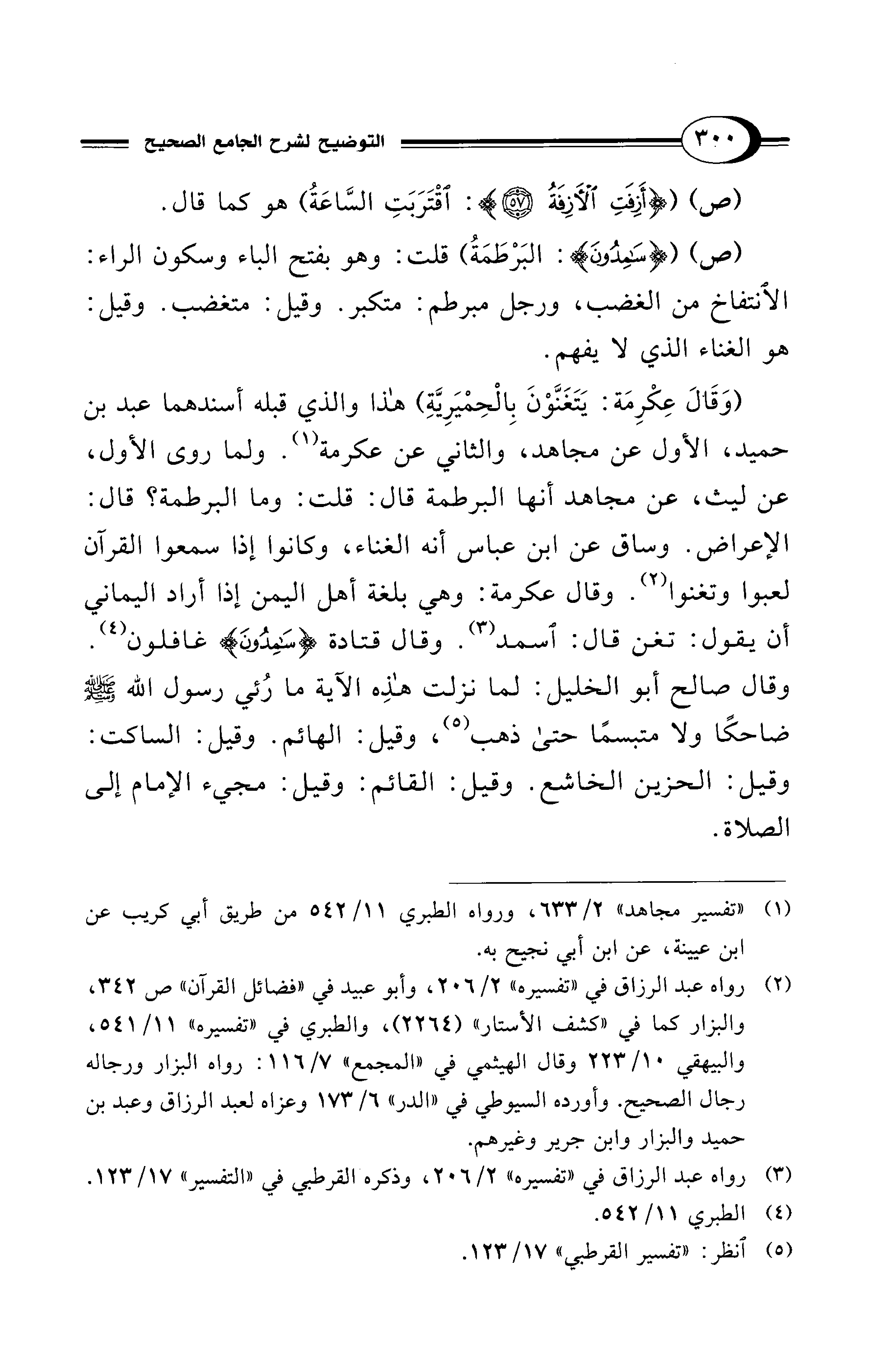 (وَقَاْلَ عِكْرِمَة: يَتَغَنَّوْنَ بِالْحِمْيَرِيَّةِ) هذا والذي قبله أسندهما عبد بن حميد، الأول عن مجاهد، والثاني عن عكرمة (¬1). ولما روى الأول، عن ليث، عن مجاهد أنها البرطمة قال: قلت: وما البرطمة؟ قال: الإعراض. وساق عن ابن عباس أنه الغناء، وكانوا إذا سمعوا القرآن لعبوا وتغنوا (¬2). وقال عكرمة: وهي بلغة أهل اليمن إذا أراد اليماني أن يقول: تغن قال: اسمد (¬3). وقال قتادة {سَامِدُونَ} غافلون (¬4).