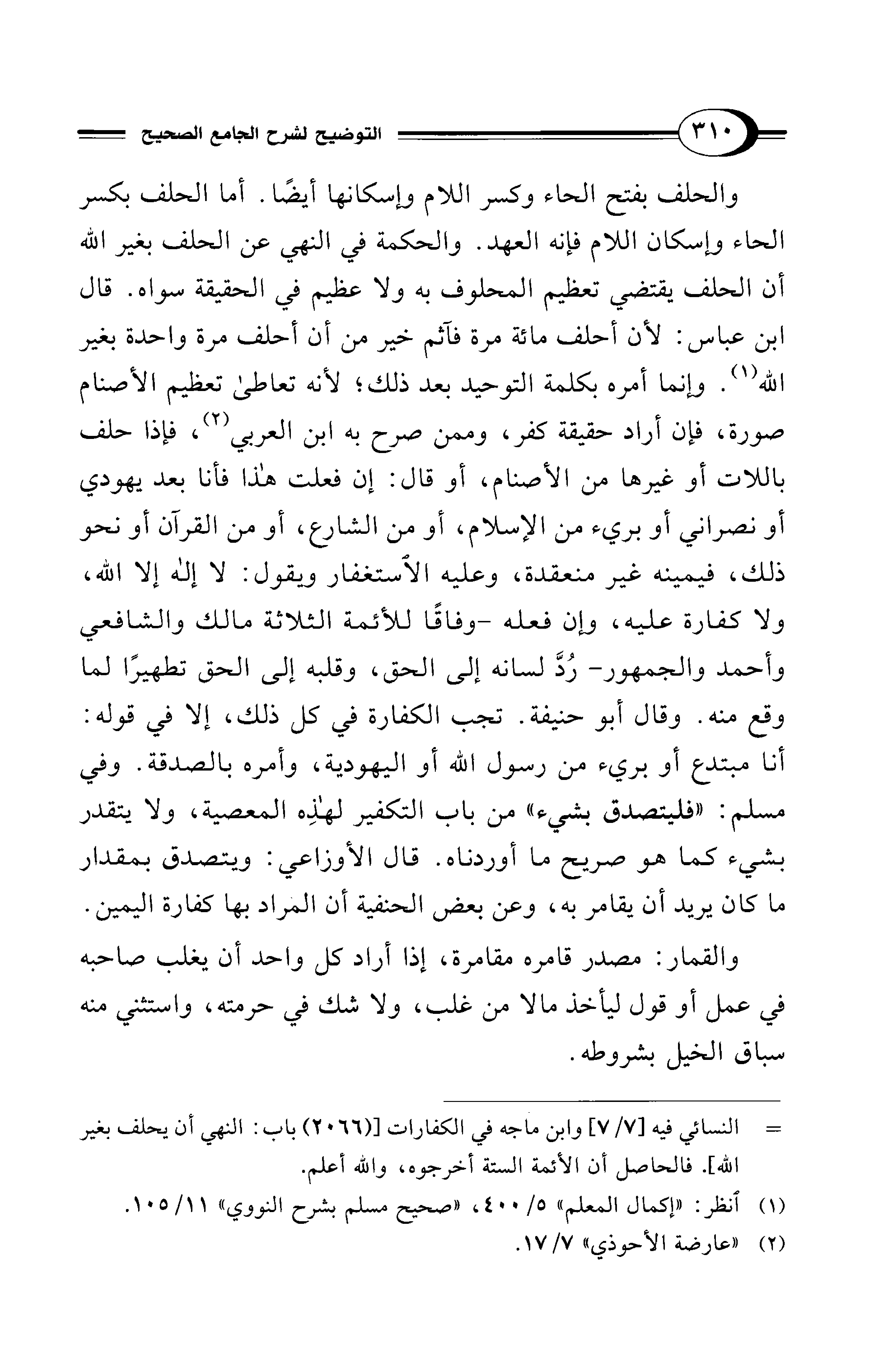 والحلف بفتح الحاء وكسر اللام وإسكانها أيضًا. أما الحلف بكسر الحاء وإسكان اللام فإنه العهد. والحكمة في النهي عن الحلف بغير الله أن الحلف يقتضي تعظيم المحلوف به ولا عظيم في الحقيقة سواه. قال ابن عباس: لأن أحلف مائة مرة فآثم خير من أن أحلف مرة واحدة بغير الله (¬1). وإنما أمره بكلمة التوحيد بعد ذلك؛ لأنه تعاطى تعظيم الأصنام صورة، فإن أراد حقيقة كفر، وممن صرح به ابن العربي (¬2)، فإذا حلف باللات أو غيرها من الأصنام، أو قال: إن فعلت هذا فأنا بعد يهودي أو نصراني أو بريء من الإسلام، أو من الشارع، أو من القرآن أو نحو ذلك، فيمينه غير منعقدة، وعليه الاستغفار ويقول: لا إله إلا الله، ولا كفارة عليه، وإن فعله -وفاقًا للأئمة الثلاثة مالك والشافعي وأحمد والجمهور- رُدَّ لسانه إلى الحق، وقلبه إلى الحق تطهيرًا لما وقع منه. وقال أبو حنيفة. تجب الكفارة في كل ذلك، إلا في قوله: أنا مبتدع أو بريء من رسول الله أو اليهودية، وأمره بالصدقة. وفي مسلم: "فليتصدق بشيء" من باب التكفير لهذِه المعصية، ولا يتقدر بشيء كما هو صريح ما أوردناه. قال الأوزاعي: ويتصدق بمقدار ما كان يريد أن يقامر به، وعن بعض الحنفية أن المراد بها كفارة اليمين.