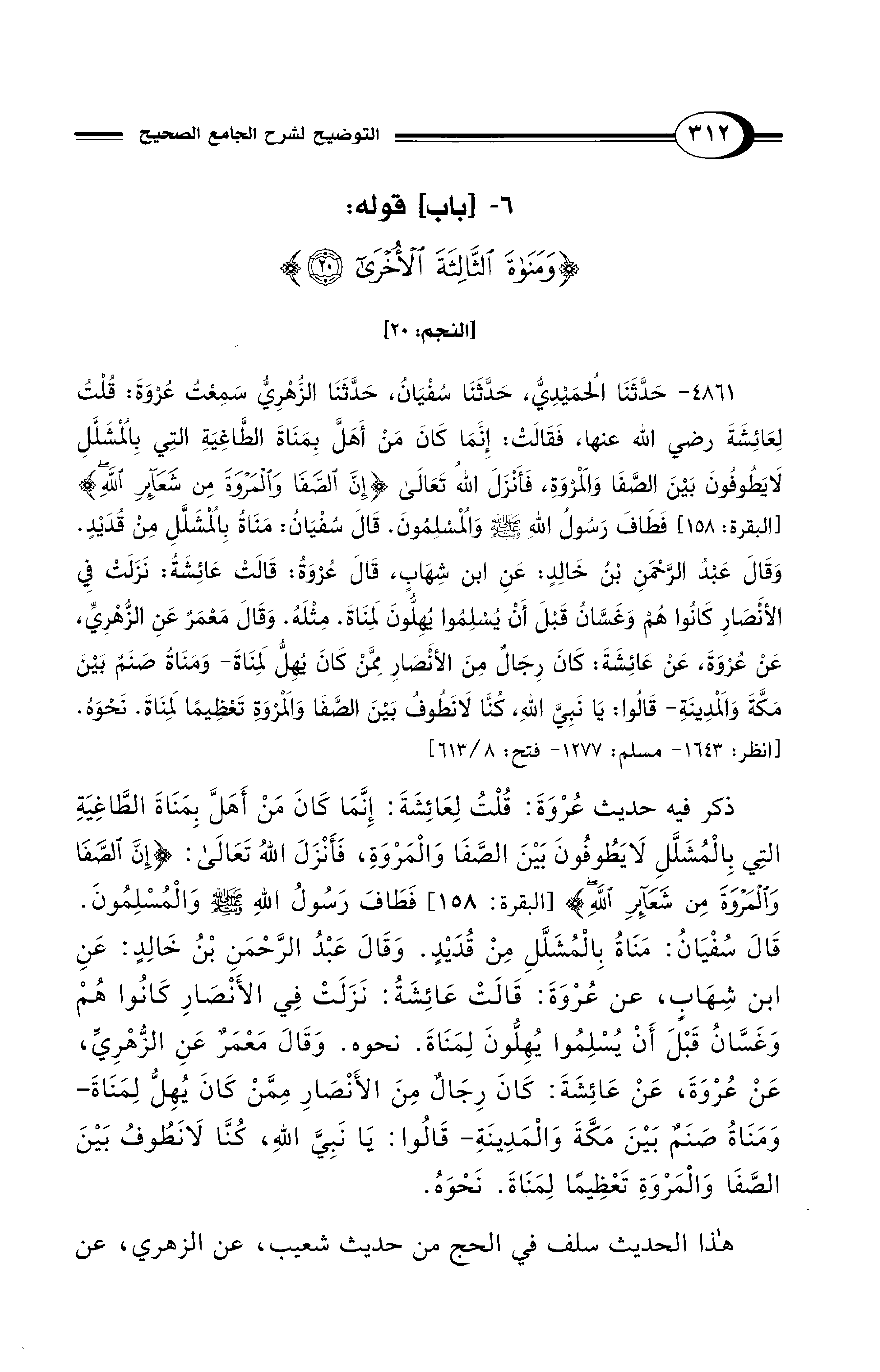 4861 - حَدَّثَنَا الْحُمَيْدِيُّ, حَدَّثَنَا سُفْيَانُ, حَدَّثَنَا الزُّهْرِيُّ سَمِعْتُ عُرْوَةَ: قُلْتُ لِعَائِشَةَ - رضي الله عنها - فَقَالَتْ: إِنَّمَا كَانَ مَنْ أَهَلَّ بِمَنَاةَ الطَّاغِيَةِ الَّتِي بِالْمُشَلَّلِ لاَ يَطُوفُونَ بَيْنَ الصَّفَا وَالْمَرْوَةِ، فَأَنْزَلَ اللهُ تَعَالَى {إِنَّ الصَّفَا وَالْمَرْوَةَ مِنْ شَعَائِرِ اللهِ} [البقرة: 158] فَطَافَ رَسُولُ اللهِ - صلى الله عليه وسلم - وَالْمُسْلِمُونَ. قَالَ سُفْيَانُ: مَنَاةُ بِالْمُشَلَّلِ مِنْ قُدَيْدٍ. وَقَالَ عَبْدُ الرَّحْمَنِ بْنُ خَالِدٍ: عَنِ ابْنِ شِهَابٍ, قَالَ عُرْوَةُ: قَالَتْ عَائِشَةُ: نَزَلَتْ فِي الأَنْصَارِ كَانُوا هُمْ وَغَسَّانُ قَبْلَ أَنْ يُسْلِمُوا يُهِلُّونَ لِمَنَاةَ. مِثْلَهُ. وَقَالَ مَعْمَرٌ عَنِ الزُّهْرِيِّ عَنْ عُرْوَةَ عَنْ عَائِشَةَ: كَانَ رِجَالٌ مِنَ الأَنْصَارِ مِمَّنْ كَانَ يُهِلُّ لِمَنَاةَ -وَمَنَاةُ صَنَمٌ بَيْنَ مَكَّةَ وَالْمَدِينَةِ- قَالُوا: يَا نَبِيَّ اللهِ كُنَّا لاَ نَطُوفُ بَيْنَ الصَّفَا وَالْمَرْوَةِ تَعْظِيمًا لِمَنَاةَ. نَحْوَهُ. [انظر: 1643 - مسلم: 1277 - فتح: 8/ 613]
