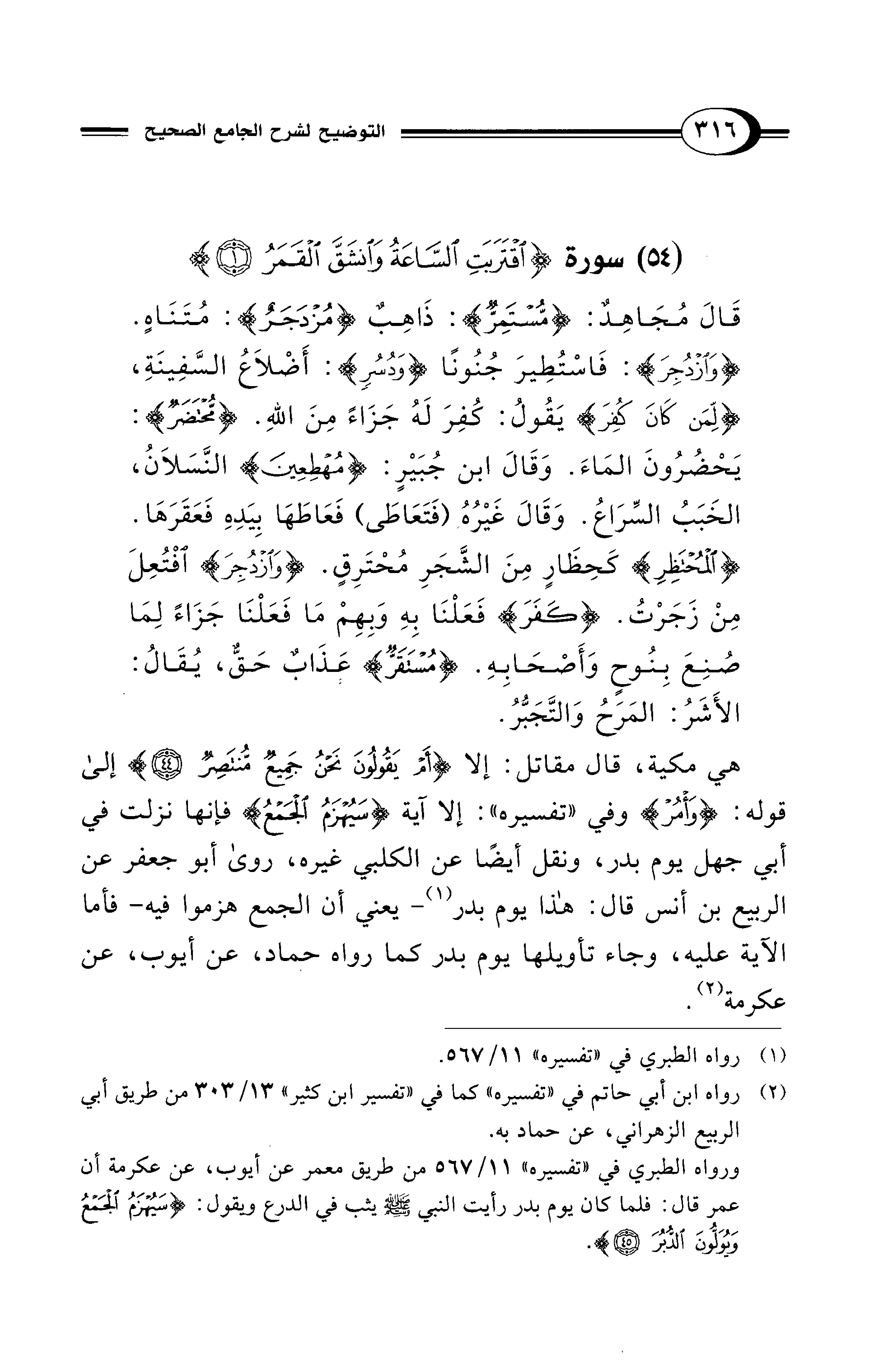 قَالَ مُجَاهِدٌ: {مُسْتَمِرٌّ}: ذَاهِبٌ {مُزْدَجَرٌ}: مُتَنَاهٍ. {وَازْدُجِرَ}: فَاسْتُطِيرَ جُنُونًا {وَدُسُرٍ}: أَضْلاَعُ السَّفِينَةِ، {لِمَنْ كَانَ كُفِرَ} يَقُولُ: كُفِرَ لَهُ جَزَاءً مِنَ اللهِ. {مُحْتَضَرٌ}: يَحْضُرُونَ المَاءَ. وَقَالَ ابن جُبَيْرٍ: {مُهْطِعِينَ} النَّسَلاَنُ، الخَبَبُ السِّرَاعُ. وَقَالَ غَيْرُهُ (فَتَعَاطَى) فَعَاطَهَا بِيَدِهِ فَعَقَرَهَا. {الْمُحْتَظِرِ} كَحِظَارٍ مِنَ الشَّجَرِ مُحْتَرِقٍ. {وَازْدُجِرَ} اْفْتُعِلَ مِنْ زَجَرْتُ. {كَفَرَ} فَعَلْنَا بِهِ وَبِهِمْ مَا فَعَلْنَا جَزَاءً لِمَا صُنِعَ بِنُوحٍ وَأَصْحَابِهِ. {مُسْتَقَرٌّ} عَذَابٌ حَقّ، يُقَالُ: الأَشَرُ: المَرَحُ وَالتَّجَبُّرُ.