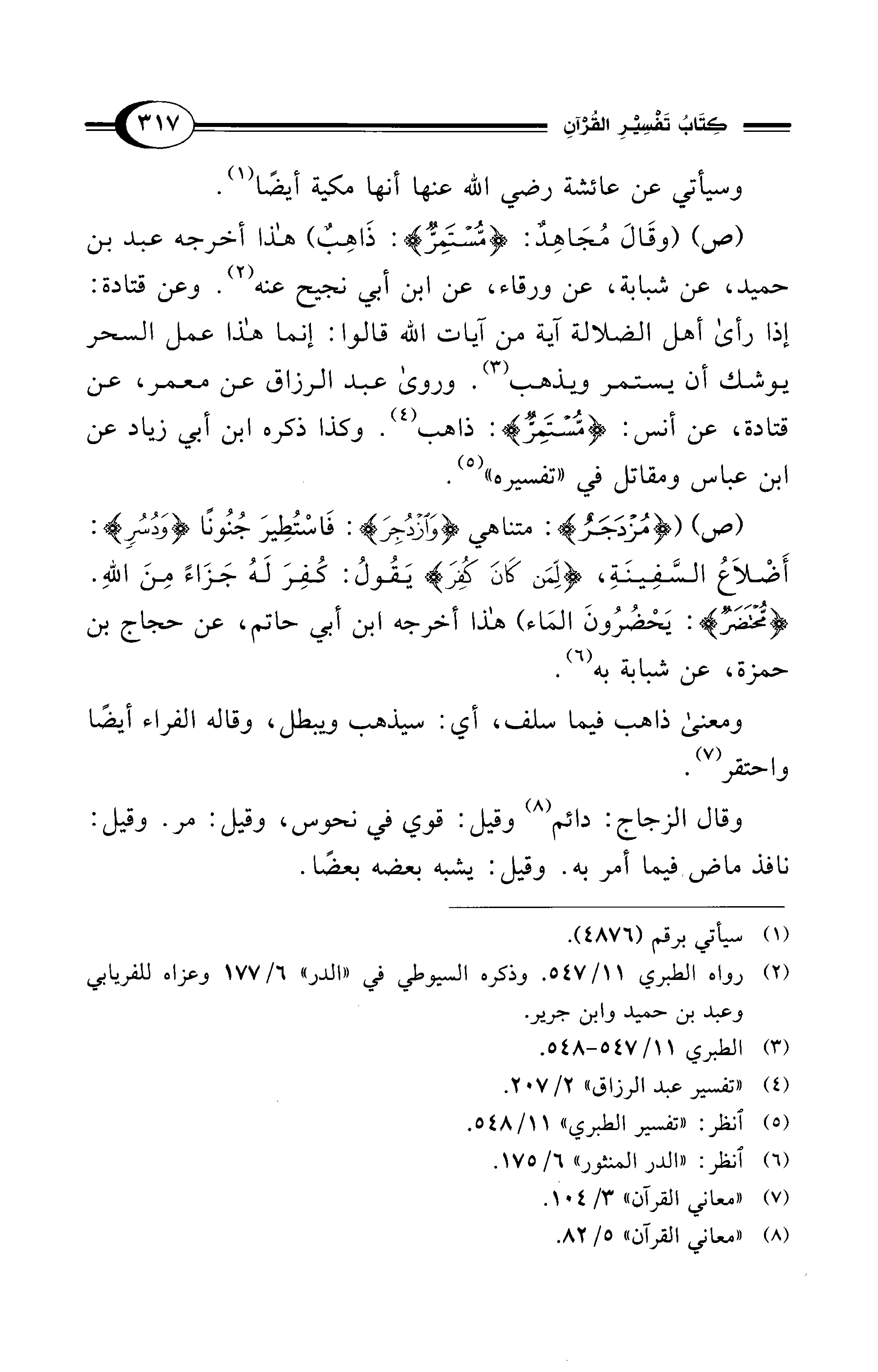 (ص) ({مُزْدَجَرٌ}: متناهي {وَازْدُجِرَ}: فَاسْتُطِيرَ جُنُونًا {وَدُسُرٍ}: أَضْلاَعُ السَّفِينَةِ، {لِمَنْ كَانَ كُفِرَ} يَقُولُ: كُفِرَ لَهُ جَزَاءً مِنَ اللهِ. {مُحْتَضَرٌ}: يَحْضُرُونَ المَاء) هذا أخرجه ابن أبي حاتم، عن حجاج بن حمزة، عن شبابة به (¬6).