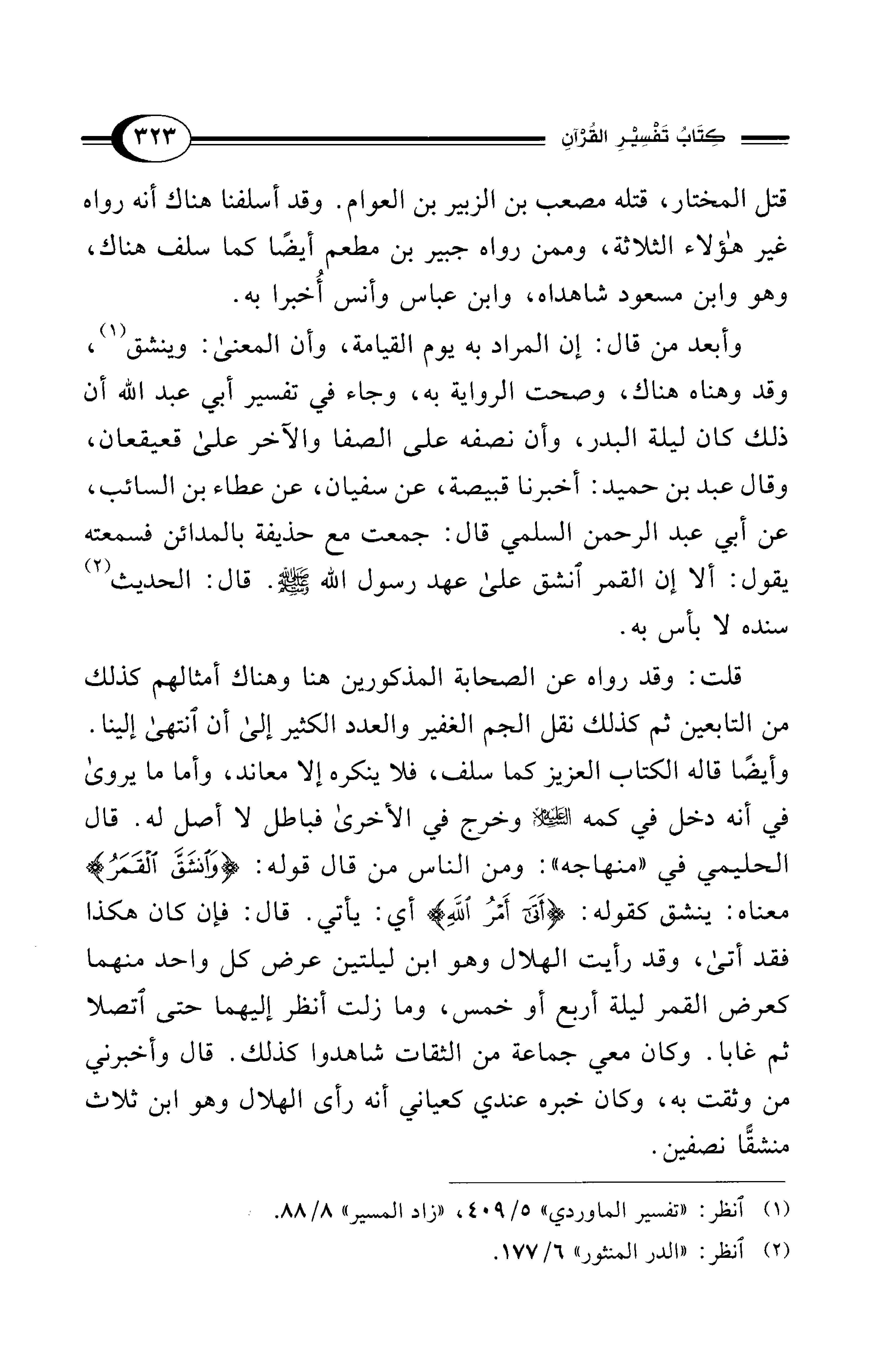 وأبعد من قال: إن المراد به يوم القيامة، وأن المعنى: وينشق (¬1)، وقد وهناه هناك، وصحت الرواية به، وجاء في تفسير أبي عبد الله أن ذلك كان ليلة البدر، وأن نصفه على الصفا والآخر على قعيقعان، وقال عبد بن حميد: أخبرنا قبيصة، عن سفيان، عن عطاء بن السائب، عن أبي عبد الرحمن السلمي قال: جمعت مع حذيفة بالمدائن فسمعته يقول: ألا إن القمر انشق على عهد رسول الله - صلى الله عليه وسلم -. قال: الحديث (¬2) سنده لا بأس به.