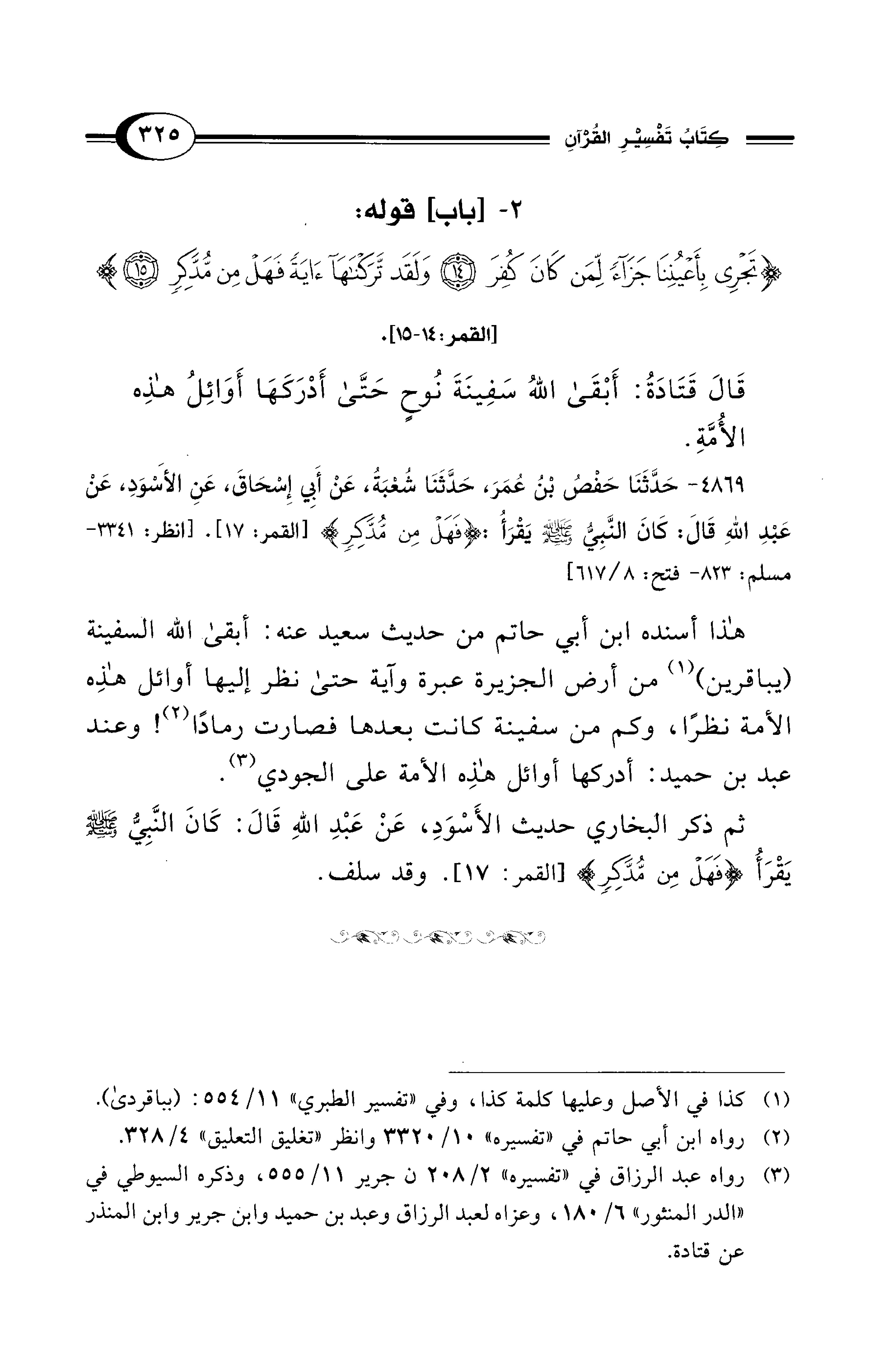 2 - [باب] قوله: {تَجْرِي بِأَعْيُنِنَا جَزَاءً لِمَنْ كَانَ كُفِرَ (14) وَلَقَدْ تَرَكْنَاهَا آيَةً فَهَلْ مِنْ مُدَّكِرٍ (15)} [القمر: 14 - 15].