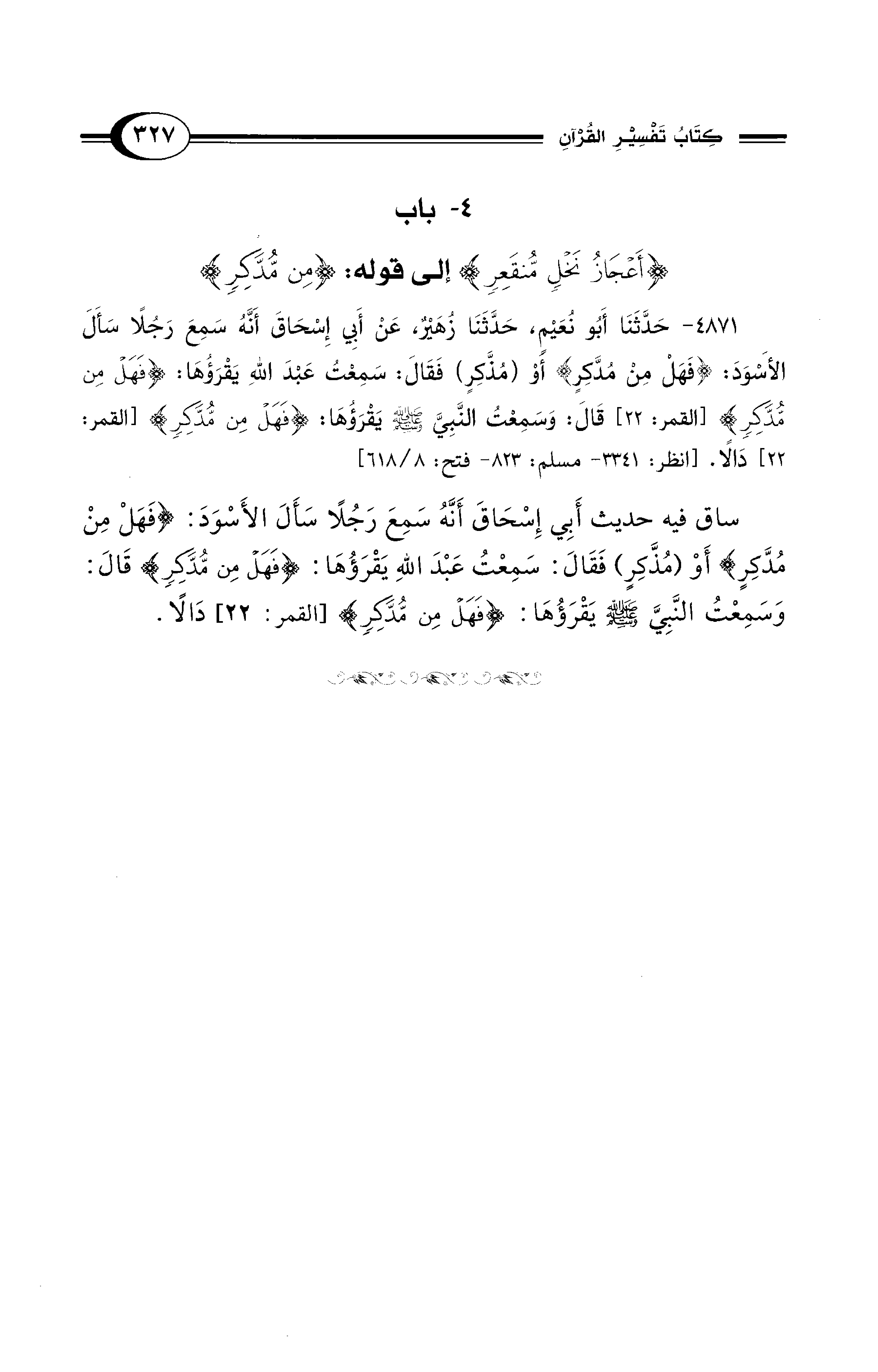 4871 - حَدَّثَنَا أَبُو نُعَيْمٍ, حَدَّثَنَا زُهَيْرٌ, عَنْ أَبِي إِسْحَاقَ أَنَّهُ سَمِعَ رَجُلاً سَأَلَ الأَسْوَدَ: {فَهَلْ مِنْ مُدَّكِرٍ} أَوْ (مُذَّكِرٍ) فَقَالَ: سَمِعْتُ عَبْدَ اللهِ يَقْرَؤُهَا: {فَهَلْ مِنْ مُدَّكِرٍ} [القمر: 22] قَالَ: وَسَمِعْتُ النَّبِيَّ - صلى الله عليه وسلم - يَقْرَؤُهَا: {فَهَلْ مِنْ مُدَّكِرٍ} [القمر: 22] دَالاً. [انظر: 3341 - مسلم: 823 - فتح: 8/ 618]