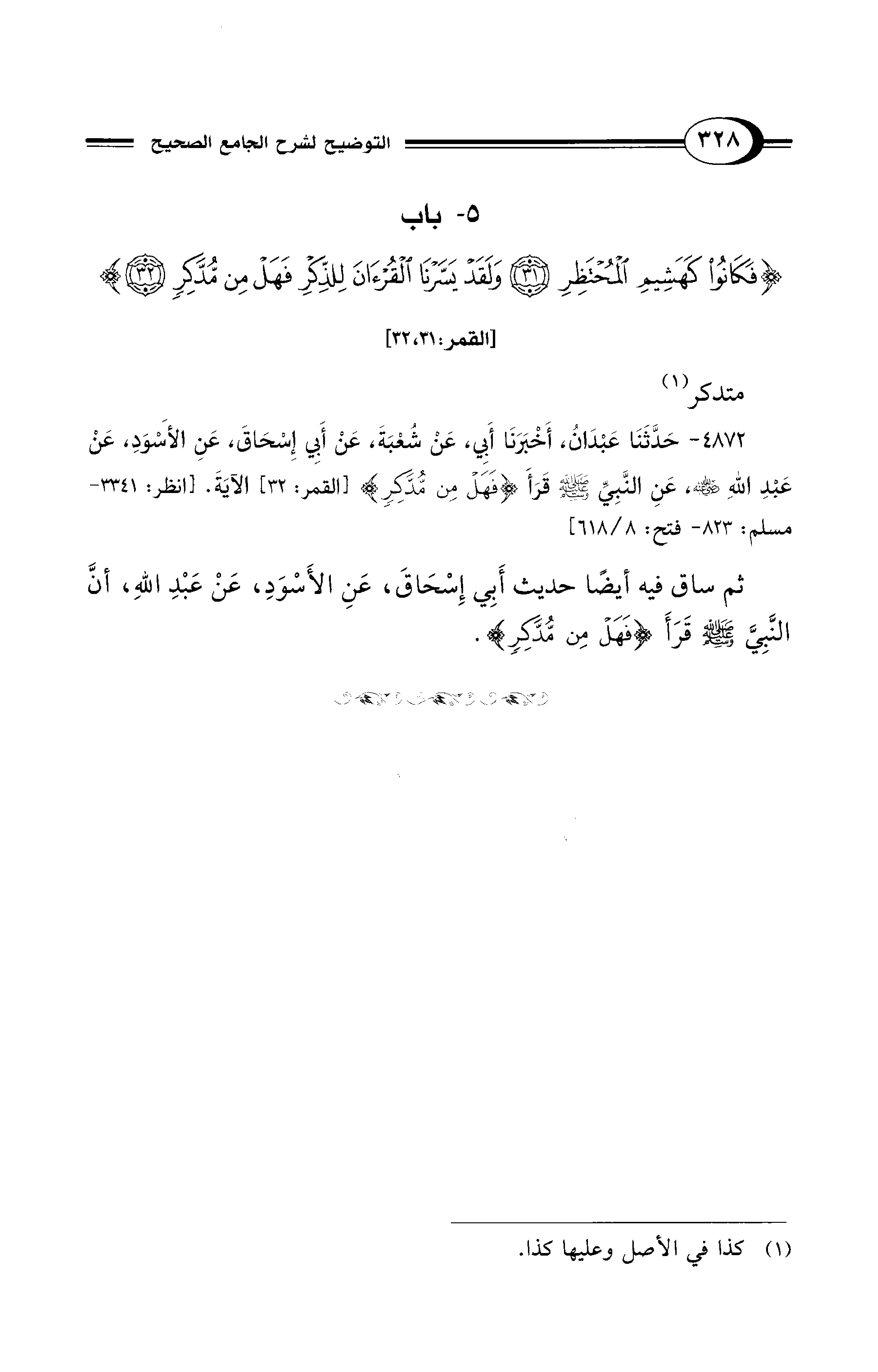5 - باب {كَهَشِيمِ الْمُحْتَظِرِ (31) وَلَقَدْ يَسَّرْنَا الْقُرْآنَ لِلذِّكْرِ فَهَلْ مِنْ مُدَّكِرٍ (32)} [القمر: 31، 33]