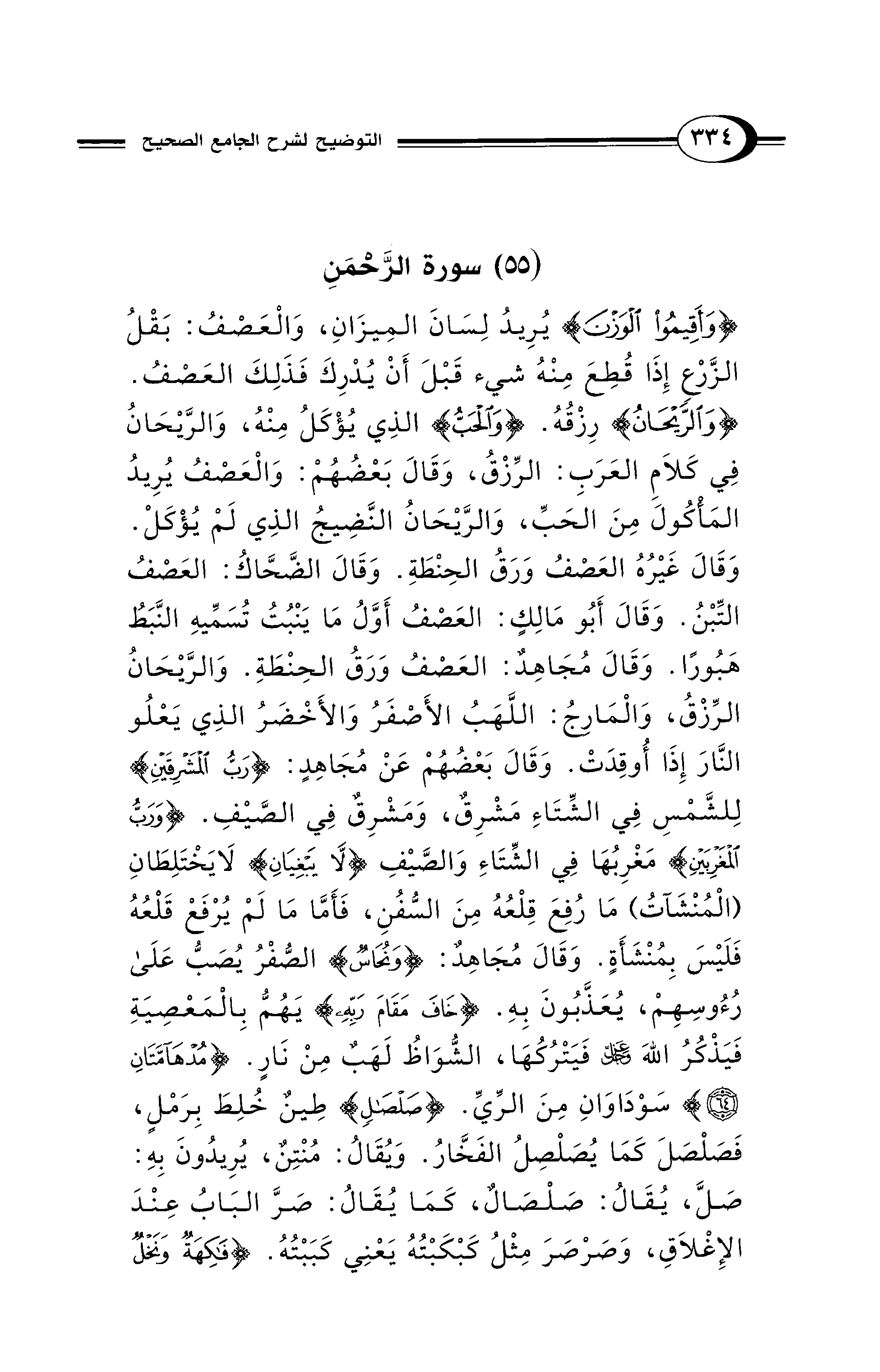 {وَأَقِيمُوا الْوَزْنَ} يُرِيدُ لِسَانَ المِيزَانِ، وَالْعَصْفُ: بَقْلُ الزَّرْعِ إِذَا قُطِعَ مِنْهُ شيء قَبْلَ أَنْ يُدْرِكَ فَذَلِكَ العَصْفُ. {وَالرَّيْحَانُ} رِزْقُهُ. {وَالْحَبُّ} الذِي يُؤْكَلُ مِنْهُ، وَالرَّيْحَانُ فِي كَلاَمِ العَرَبِ: الرِّزْقُ، وَقَالَ بَعْضُهُمْ: وَالْعَصْفُ يُرِيدُ المَأكُولَ مِنَ الحَبِّ، وَالرَّيْحَانُ النَّضِيجُ الذِي لَمْ يُؤْكَلْ. وَقَالَ غَيْرُهُ العَصْفُ وَرَقُ الحِنْطَةِ. وَقَالَ الضَّحَّاكُ: العَصْفُ التِّبْنُ. وَقَالَ أَبُو مَالِكٍ: العَصْفُ أَوَّلُ مَا يَنْبُتُ تُسَمِّيهِ النَّبَطُ هَبُورًا. وَقَالَ مُجَاهِدٌ: العَصْفُ وَرَقُ الحِنْطَةِ. وَالرَّيْحَانُ الرِّزْقُ، وَالْمَارجُ: اللَّهَبُ الأَصْفَرُ وَالأَخْضَرُ الذِي يَعْلُو النَّارَ إِذَا أُوقِدَتْ. وَقَالَ بَعْضُهُمْ عَنْ مُجَاهِدٍ: {رَبُّ الْمَشْرِقَيْنِ} لِلشَّمْسِ فِي الشِّتَاءِ مَشْرِقٌ، وَمَشْرِقٌ فِي الصَّيْفِ. {وَرَبُّ الْمَغْرِبَيْنِ} مَغْرِبُهَا فِي الشِّتَاءِ وَالصَّيْفِ {لَا يَبْغِيَانِ} لَا يَخْتَلِطَانِ {الْمُنْشَآتُ} مَا رُفِعَ قِلْعُهُ مِنَ السُّفُنِ، فَأَمَّا مَا لَمْ يُرْفَعْ قَلْعُهُ فَلَيْسَ بِمُنْشَأَةٍ. وَقَالَ مُجَاهِدٌ: {وَنُحَاسٌ} الصُّفْرُ يُصَبُّ عَلَى رُءُوسِهِمْ، يُعَذَّبُونَ بِهِ. {خَافَ مَقَامَ رَبِّهِ} يَهُمُّ بِالْمَعْصِيَةِ فَيَذْكُرُ اللهَ -عَزَّ وَجَلَّ- فَيَتْرُكُهَا، الشُّوَاظُ لَهَبٌ مِنْ نَارٍ. {مُدْهَامَّتَانِ (64)} سَوْدَاوَانِ مِنَ الرِّيِّ. {صَلْصَالٍ} طِينٌ خُلِطَ بِرَمْلٍ، فَصَلْصَلَ كَمَا يُصَلْصِلُ الفَخَّارُ. وَيُقَالُ: مُنْتِنٌ، يُرِيدُونَ بِهِ: صَلَّ، يُقَالُ: صَلْصَالٌ، كَمَا يُقَالُ: صَرَّ البَابُ عِنْدَ الإِغْلاَقِ، وَصَرْصَرَ مِثْلُ كَبْكَبْتُهُ يَعْنِي كَبَبْتُهُ. {فَاكِهَةٌ وَنَخْلٌ