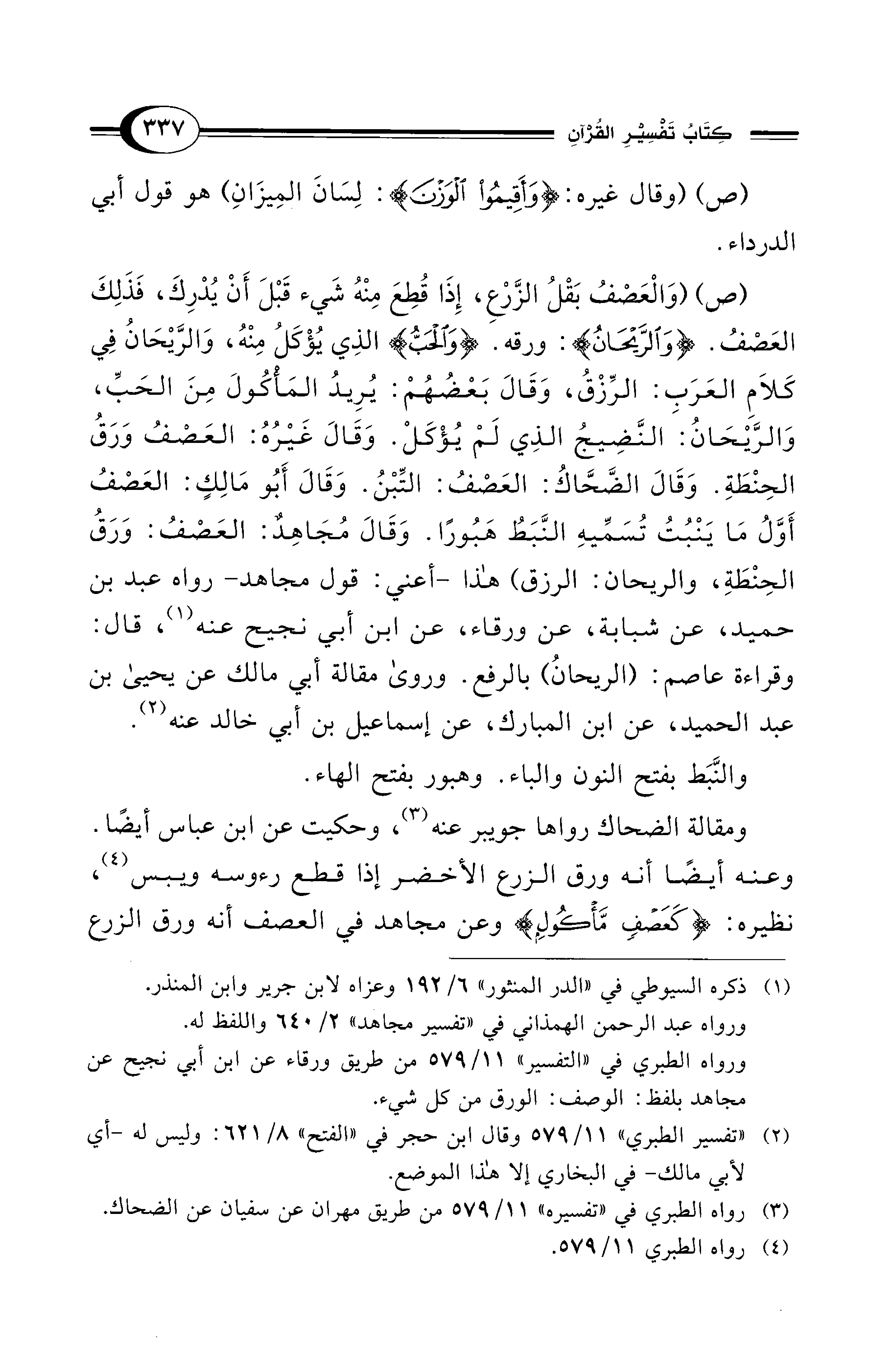 (ص) (وَالْعَصْفُ بَقْلُ الزَّرْعِ، إِذَا قُطِعَ مِنْهُ شَيء قَبْلَ أَنْ يُدْرِكَ، فَذَلِكَ العَصْفُ. {وَالرَّيْحَانُ}: ورقه. {وَالْحَبُّ} الذِي يُؤْكَلُ مِنْهُ، وَالرَّيْحَانُ فِي كَلاَمِ العَرَبِ: الرِّزْقُ، وَقَالَ بَعْضُهُمْ: يُرِيدُ المَأْكُولَ مِنَ الحَبِّ، وَالرَّيْحَانُ: النَّضِيجُ الذِي لَمْ يُؤْكَلْ. وَقَالَ غَيْرُهُ: العَصْفُ وَرَقُ الحِنْطَةِ. وَقَالَ الضَّحَّاكُ: العَصْفُ: التِّبْنُ. وَقَالَ أَبُو مَالِكٍ: العَصْفُ أَوَّلُ مَا يَنْبُتُ تُسَمِّيهِ النَّبَطُ هَبُورًا. وَقَالَ مُجَاهِدٌ: العَصْفُ: وَرَقُ الحِنْطَةِ، والريحان: الرزق) هذا -أعني: قول مجاهد- رواه عبد بن حميد، عن شبابة، عن ورقاء، عن ابن أبي نجيح عنه (¬1)، قال: وقراءة عاصم: (الريحانُ) بالرفع. وروى مقالة أبي مالك عن يحيى بن عبد الحميد، عن ابن المبارك، عن إسماعيل بن أبي خالد عنه (¬2).