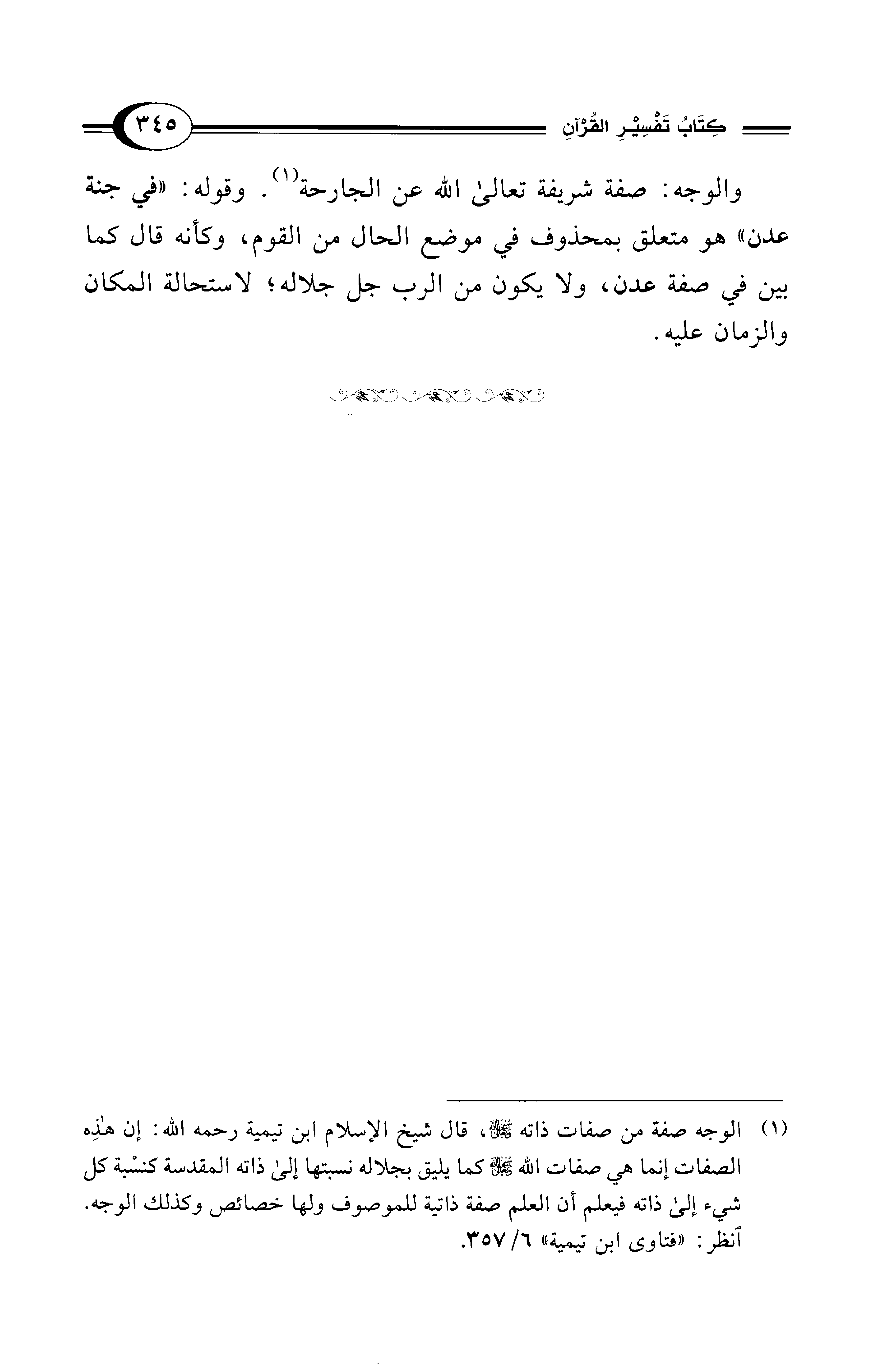 (¬1) الوجه صفة من صفات ذاته -سبحانه وتعالى-، قال شيخ الإسلام ابن تيمية رحمه الله: إن هذِه الصفات إنما هي صفات الله -سبحانه وتعالى- كما يليق بجلاله نسبتها إلى ذاته المقدسة كنسْبة كل شيء إلى ذاته فيعلم أن العلم صفة ذاتية للموصوف ولها خصائص وكذلك الوجه.