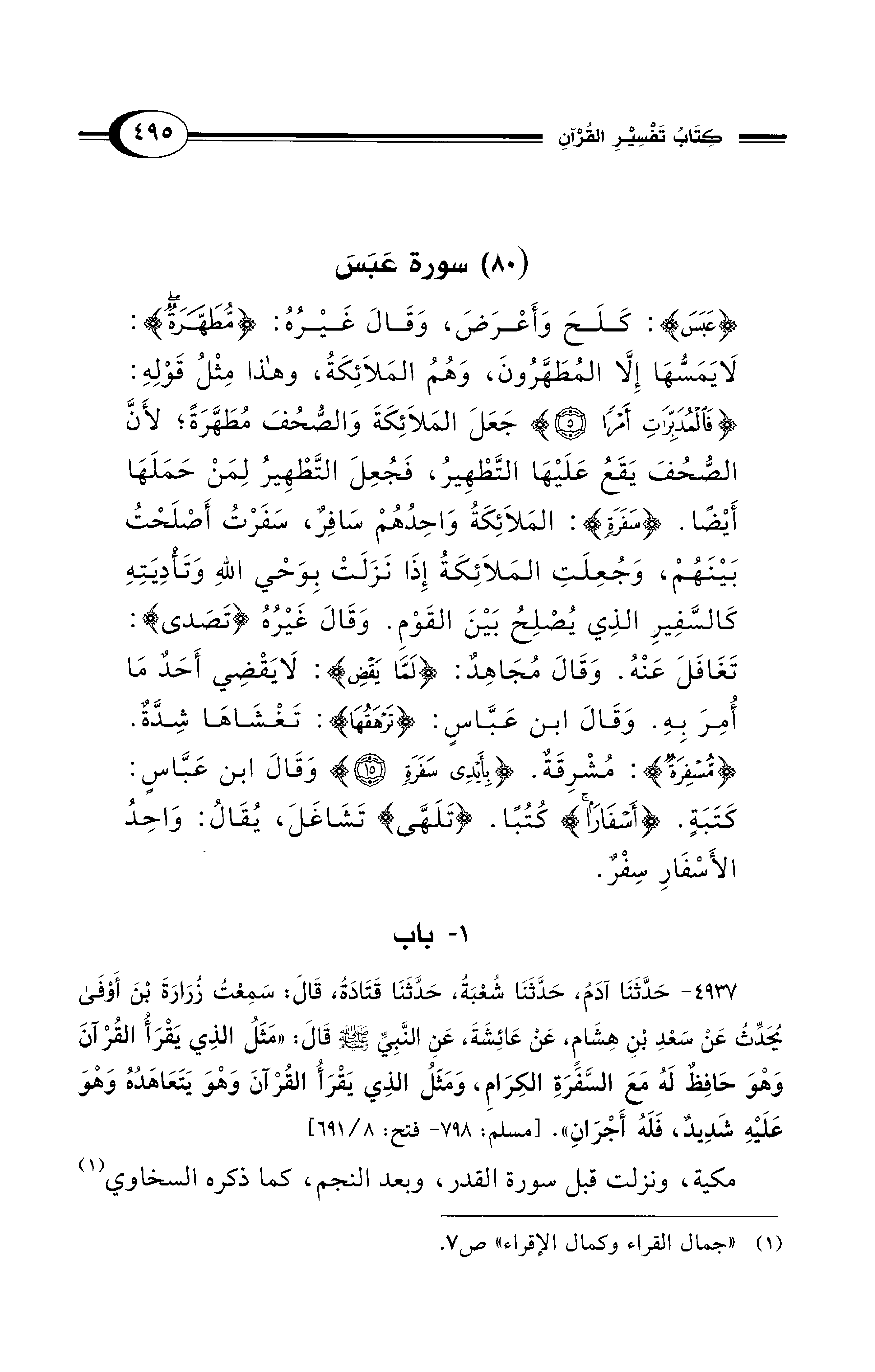 {عَبَسَ}: كَلَحَ وَأَعْرَضَ، وَقَالَ غَيْرُهُ: {مُطَهَّرَةٌ}: لَا يَمَسُّهَا إِلَّا المُطَهَّرُونَ، وَهُمُ المَلاَئِكَةُ، وهذا مِثْلُ قَوْلِهِ: {فَالْمُدَبِّرَاتِ أَمْرًا (5)} جَعَلَ المَلاَئِكَةَ وَالصحُفَ مُطَهَّرَةً؛ لأَنَّ الصُّحُفَ يَقَعُ عَلَيْهَا التَّطْهِيرُ، فَجُعِلَ التَّطْهِيرُ لِمَنْ حَمَلَهَا أَيْضًا. {سَفَرَةٍ}: المَلاَئِكَةُ وَاحِدُهُمْ سَافِرٌ، سَفَرْتُ أَصْلَحْتُ بَيْنَهُمْ، وَجُعِلَتِ المَلاَئِكَةُ إِذَا نَزَلَتْ بِوَحْي اللهِ وَتَأدِيَتِهِ كَالسَّفِيرِ الذِي يُصْلِحُ بَيْنَ القَوْمِ. وَقَالَ غَيْرُهُ {تَصَدى}: تَغَافَلَ عَنْهُ. وَقَالَ مُجَاهِدٌ: {لَمَّا يَقْضِ}: لَا يَقْضِي أَحَدٌ مَا أُمِرَ بِهِ. وَقَالَ ابن عَبَّاسٍ: {تَرْهَقُهَا}: تَغْشَاهَا شِدَّةٌ. {مُسْفِرَةٌ}: مُشْرِقَةٌ. {بِأَيْدِي سَفَرَةٍ} وَقَالَ ابن عَبَّاسٍ: كَتَبَةٍ. {أَسْفَارًا} كُتُبًا. {تَلَهَّى} تَشَاغَلَ، يُقَالُ: وَاحِدُ الأَسْفَارِ سِفْرٌ.