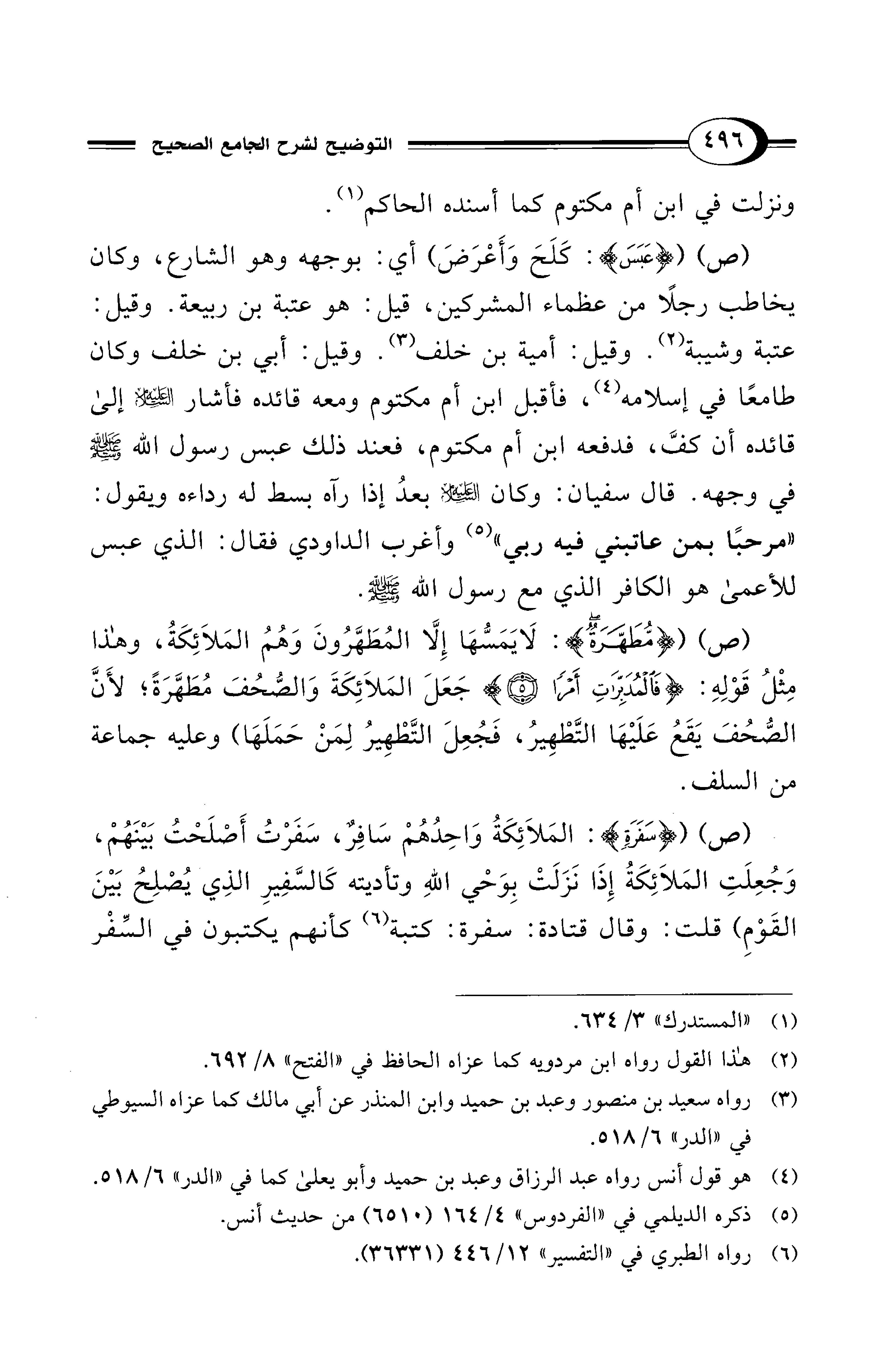 (ص) ({عَبَسَ}: كَلَحَ وَأَعْرَضَ) أي: بوجهه وهو الشارع، وكان يخاطب رجلًا من عظماء المشركين، قيل: هو عتبة بن ربيعة. وقيل: عتبة وشيبة (¬2). وقيل: أمية بن خلف (¬3). وقيل: أبي بن خلف وكان طامعًا في إسلامه (¬4)، فأقبل ابن أم مكتوم ومعه قائده فأشار - عليه السلام - إلى قائده أن كفَّ، فدفعه ابن أم مكتوم، فعند ذلك عبس رسول الله - صلى الله عليه وسلم - في وجهه. قال سفيان: وكان - عليه السلام - بعدُ إذا رآه بسط له رداءه ويقول: "مرحبًا بمن عاتبني فيه ربي" (¬5) وأغرب الداودي فقال: الذي عبس للأعمى هو الكافر الذي مع رسول الله - صلى الله عليه وسلم -.